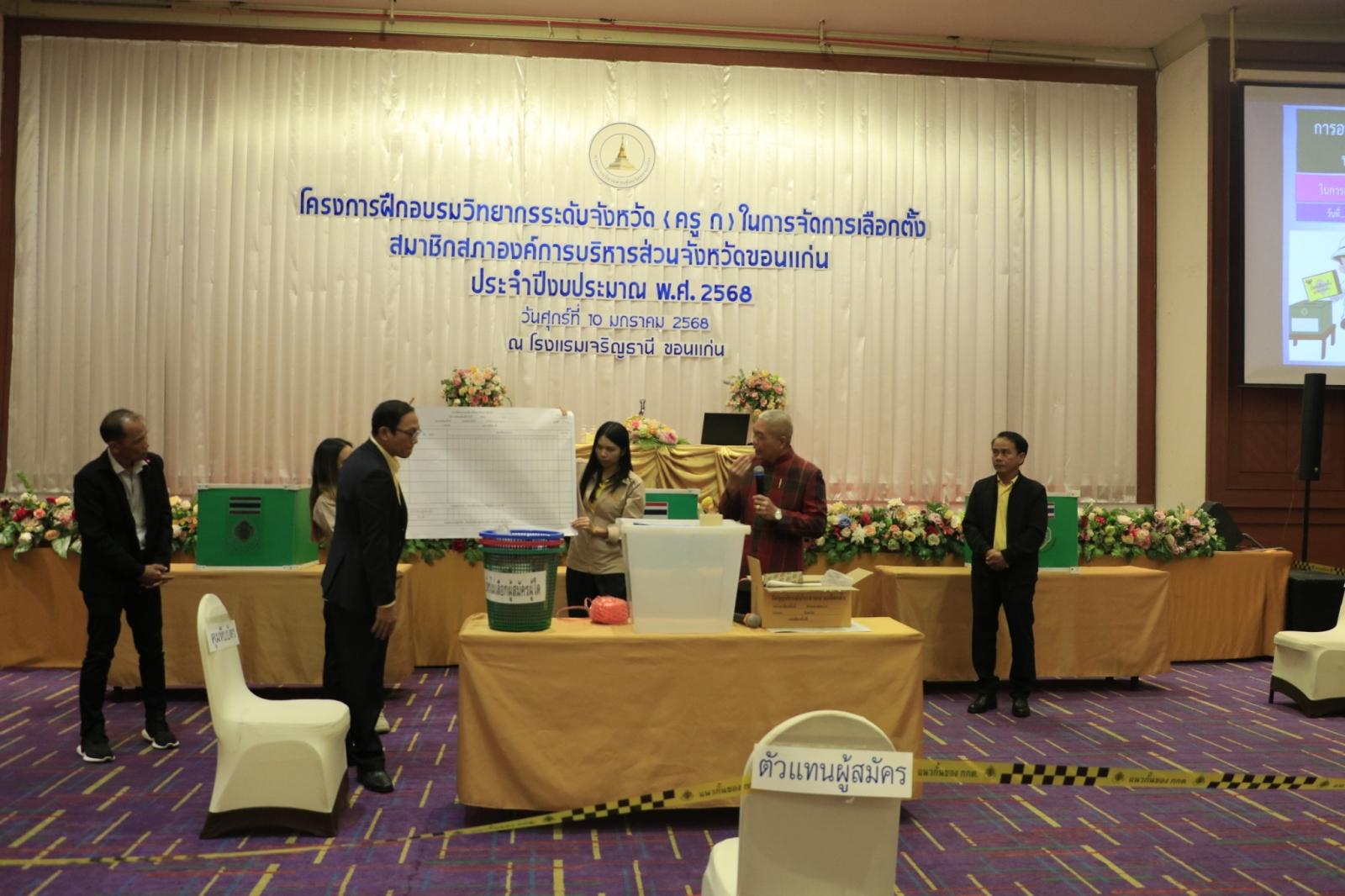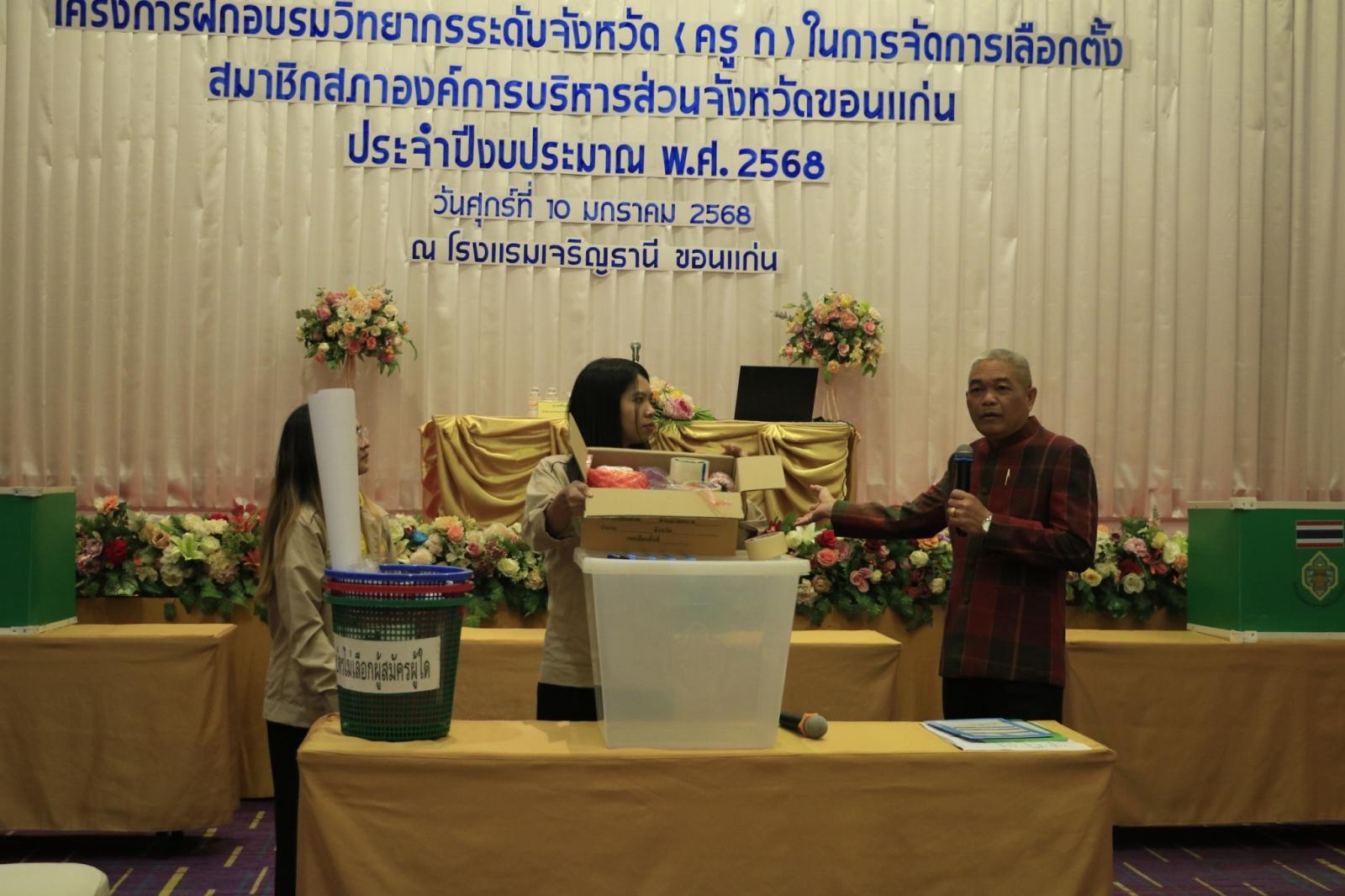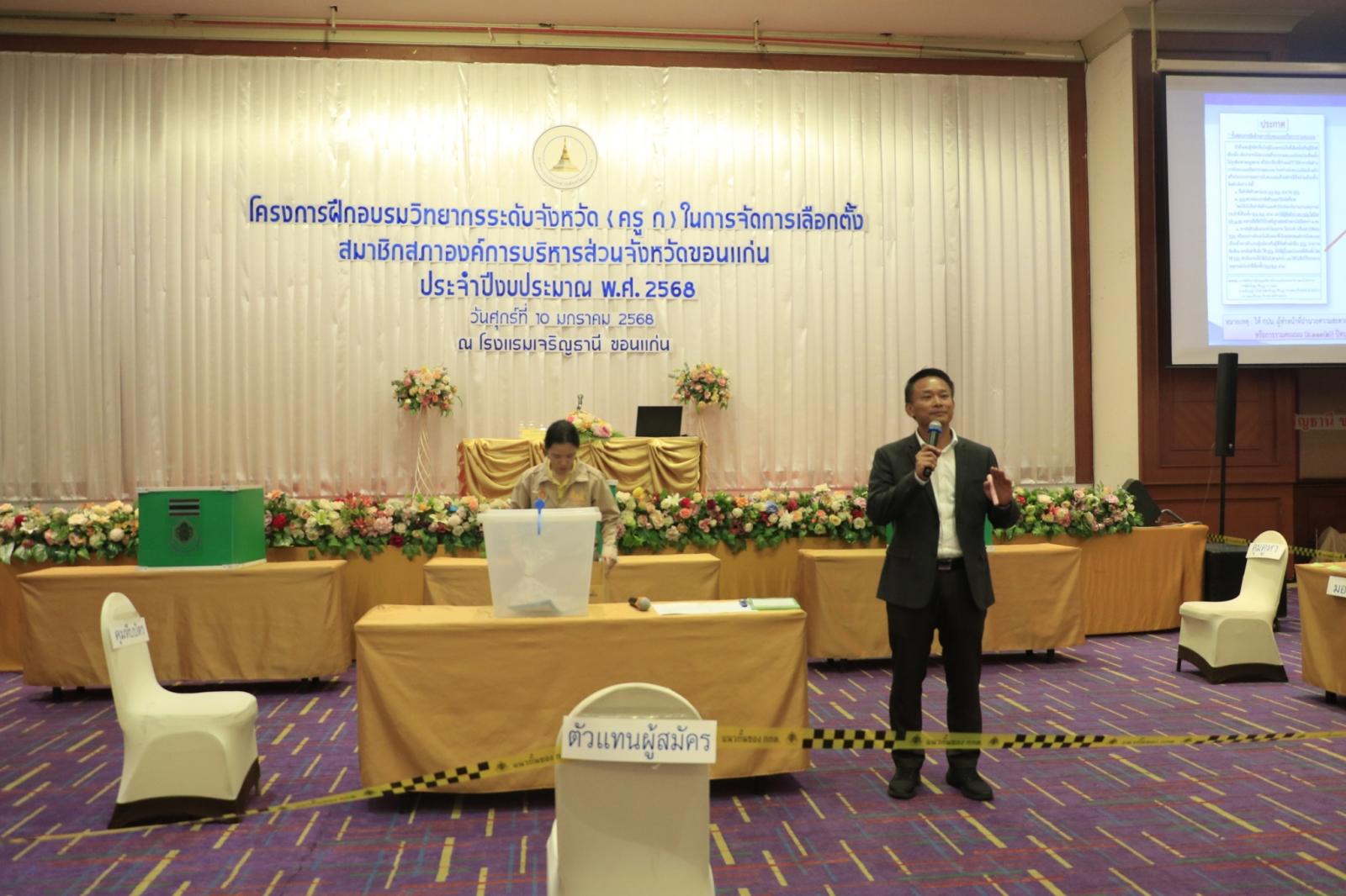 เมื่อวันที่ 10 มกราคม 2568 เวลา 10.00 น. องค์การบริหารส่วนจังหวัดขอนแก่น จัดโครงการฝึกอบรมวิทยากรระดับจังหวัด (ครู ก.) ในการเลือกตั้งสมาชิกสภาองค์การบริหารส่วนจังหวัดขอนแก่น ประจำปีงบประมาณ พ.ศ.2568 โดยมีนายพันธ์เทพ เสาโกศล รองผู้ว่าราชการจังหวัดขอนแก่นในฐานะ ประธานคณะกรรมการการเลือกตั้งนายกองค์การบริหารส่วนจังหวัดขอนแก่น เป็นประธานในพิธีเปิดการฝึกอบรมฯ ในโอกาสนี้มี ว่าที่ร้อยเอกพงเจตน์ พรกุณา ปลัดองค์การบริหารส่วนจังหวัดขอนแก่น ในฐานะผู้อำนวยการการเลือกตั้งประจำองค์การบริหารส่วนจังหวัดขอนแก่น เป็นผู้กล่าวรายงานถึงวัตถุประสงค์ของการอบรมในครั้งนี้ โดยมี นางสาวสิริยากร ภัทร์ธนะวัตน์ รองผู้อำนวยการสำนักงานคณะกรรมการเลือกตั้งประจำจังหวัดขอนแก่น ให้ความรู้ผู้เข้าร่วมการฝึกอบรบฯ โดยมีคณะกรรมการการเลือกตั้งประจำองค์การบริหารส่วนจังงหวัดขอนแก่น คณะกรรมการที่ปรึกษา ที่ปรึกษานายกองค์การบริหารส่วนจังหวัดขอนแก่น ผู้บริหารท้องถิ่น หัวหน้าส่วนราชการองค์การบริหารส่วนจังหวัดขอนแก่น เข้าร่วมเป็นเกียรติในพิธีเปิดในครั้งนี้ ในโอกาสนี้ได้รับเกียรติคณะวิทยากรจากสำนักงานคณะกรรมการการเลือกตั้งประจำจังหวัดขอนแก่น บรรยายให้ความรู้เรื่องเกี่ยวกับโครงสร้างการบริหารจัดการเลือกตั้งท้องถิ่น ประกอบด้วย เจ้าพนักงานผู้ดำเนินการเลือกตั้ง, การปฏิบัติหน้าที่ในการจัดการออกเสียงลงคะแนน, การปฏิบัติหน้าที่ในการดำเนินการนับคะแนนเลือกตั้ง, ข้อพึงระวังในการปฏิบัติหน้าที่, ตัวอย่างแบบพิมพ์ต่าง ๆ ณ โรงแรมเจริญธานี อำเภอเมือง จังหวัดขอนแก่น