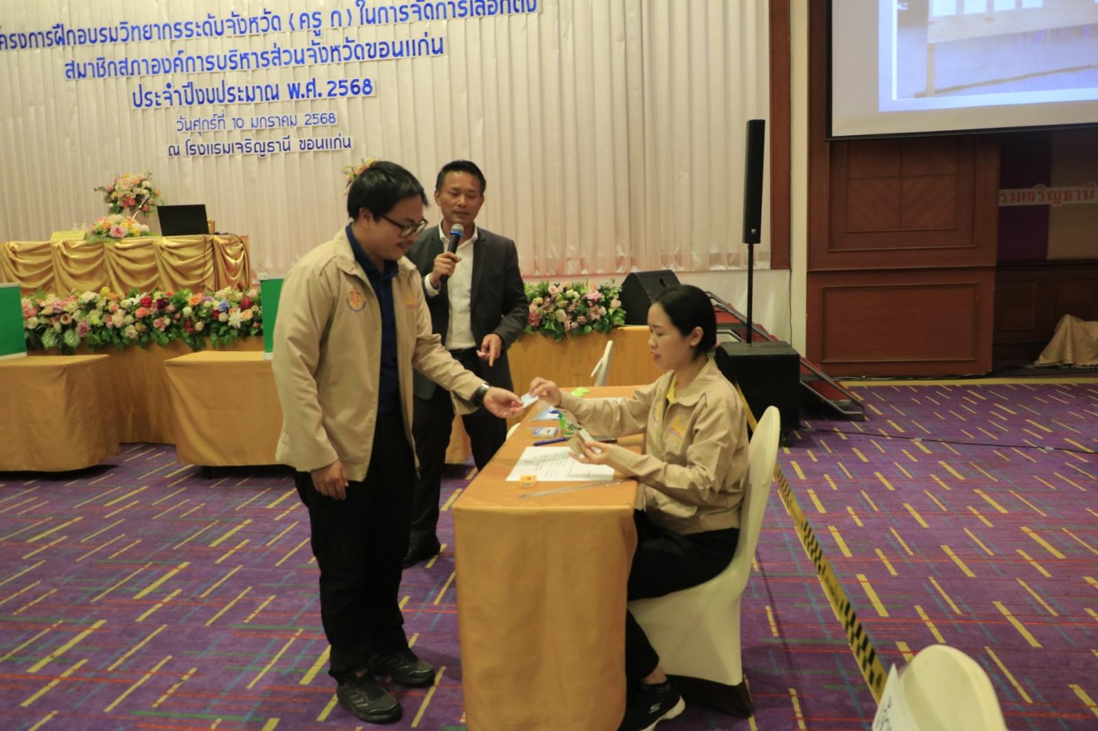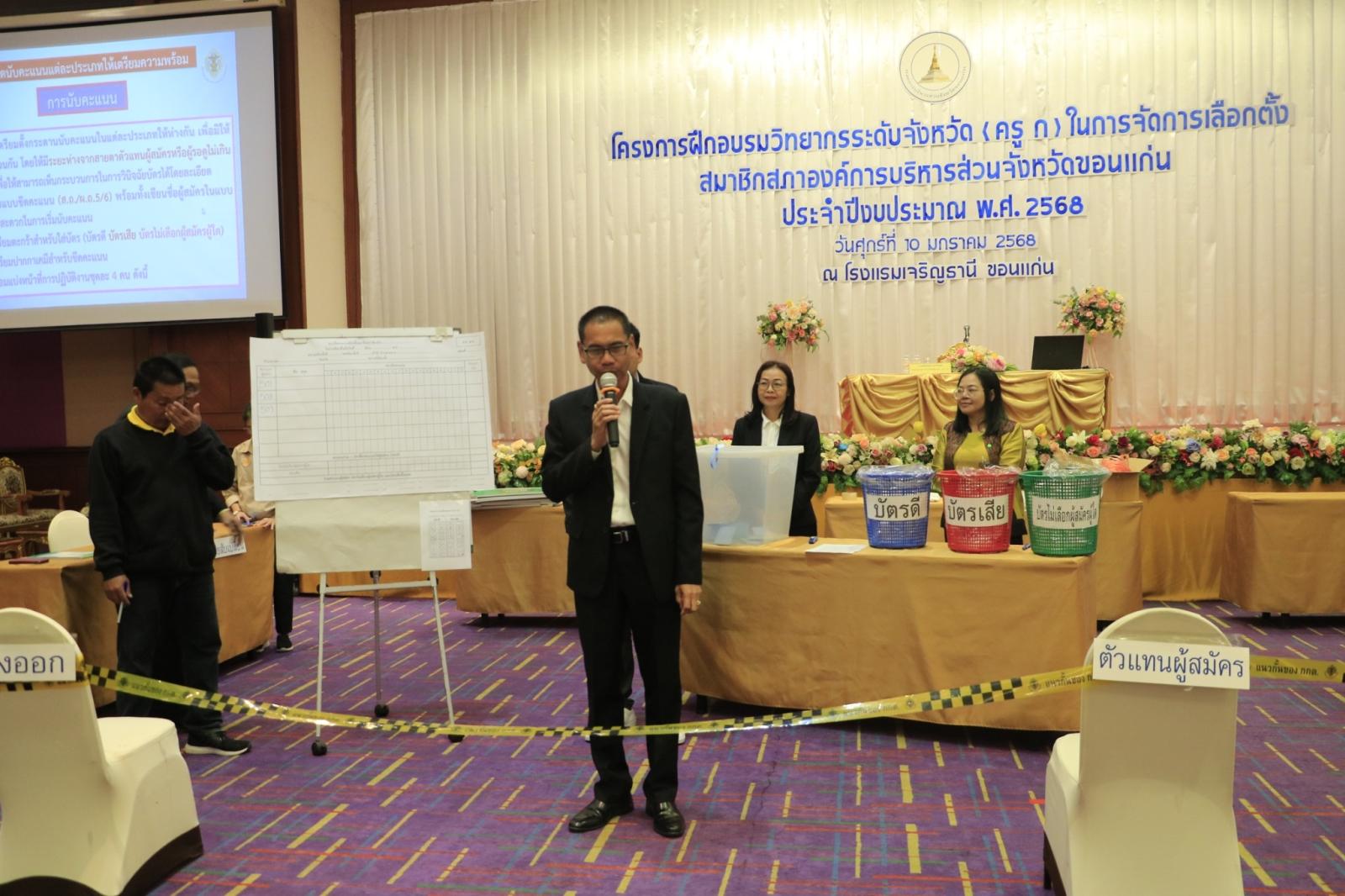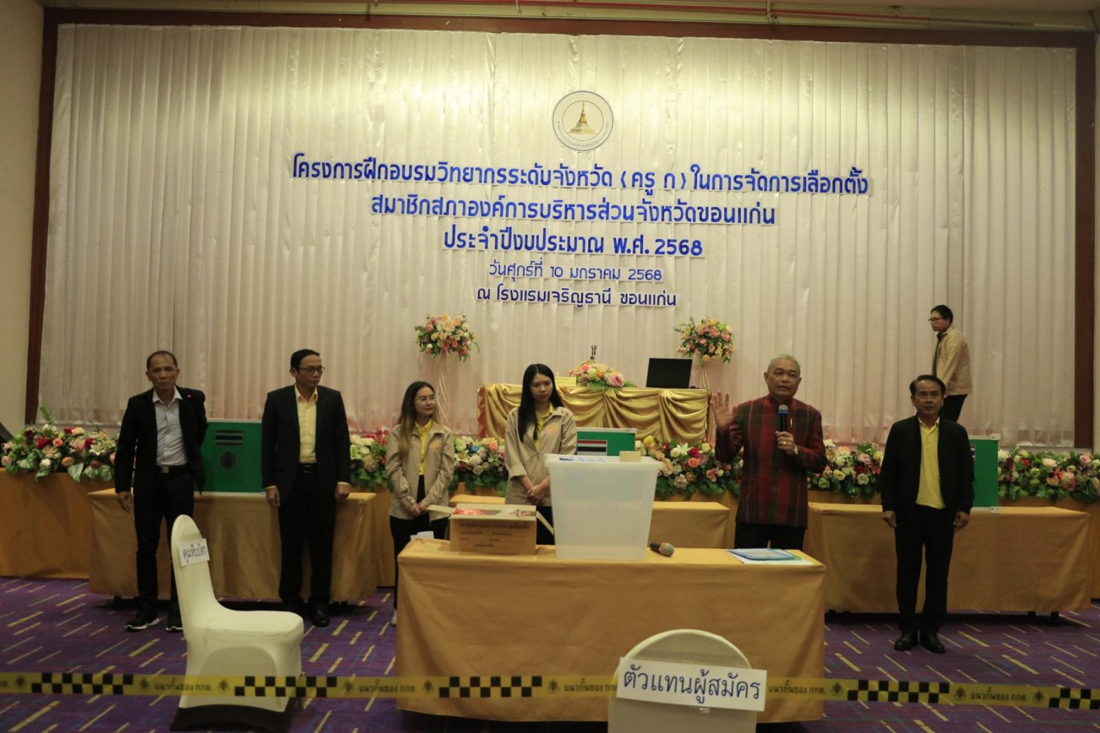 เมื่อวันที่ 10 มกราคม 2568 เวลา 10.00 น. องค์การบริหารส่วนจังหวัดขอนแก่น จัดโครงการฝึกอบรมวิทยากรระดับจังหวัด (ครู ก.) ในการเลือกตั้งสมาชิกสภาองค์การบริหารส่วนจังหวัดขอนแก่น ประจำปีงบประมาณ พ.ศ.2568 โดยมีนายพันธ์เทพ เสาโกศล รองผู้ว่าราชการจังหวัดขอนแก่นในฐานะ ประธานคณะกรรมการการเลือกตั้งนายกองค์การบริหารส่วนจังหวัดขอนแก่น เป็นประธานในพิธีเปิดการฝึกอบรมฯ ในโอกาสนี้มี ว่าที่ร้อยเอกพงเจตน์ พรกุณา ปลัดองค์การบริหารส่วนจังหวัดขอนแก่น ในฐานะผู้อำนวยการการเลือกตั้งประจำองค์การบริหารส่วนจังหวัดขอนแก่น เป็นผู้กล่าวรายงานถึงวัตถุประสงค์ของการอบรมในครั้งนี้ โดยมี นางสาวสิริยากร ภัทร์ธนะวัตน์ รองผู้อำนวยการสำนักงานคณะกรรมการเลือกตั้งประจำจังหวัดขอนแก่น ให้ความรู้ผู้เข้าร่วมการฝึกอบรบฯ โดยมีคณะกรรมการการเลือกตั้งประจำองค์การบริหารส่วนจังงหวัดขอนแก่น คณะกรรมการที่ปรึกษา ที่ปรึกษานายกองค์การบริหารส่วนจังหวัดขอนแก่น ผู้บริหารท้องถิ่น หัวหน้าส่วนราชการองค์การบริหารส่วนจังหวัดขอนแก่น เข้าร่วมเป็นเกียรติในพิธีเปิดในครั้งนี้ ในโอกาสนี้ได้รับเกียรติคณะวิทยากรจากสำนักงานคณะกรรมการการเลือกตั้งประจำจังหวัดขอนแก่น บรรยายให้ความรู้เรื่องเกี่ยวกับโครงสร้างการบริหารจัดการเลือกตั้งท้องถิ่น ประกอบด้วย เจ้าพนักงานผู้ดำเนินการเลือกตั้ง, การปฏิบัติหน้าที่ในการจัดการออกเสียงลงคะแนน, การปฏิบัติหน้าที่ในการดำเนินการนับคะแนนเลือกตั้ง, ข้อพึงระวังในการปฏิบัติหน้าที่, ตัวอย่างแบบพิมพ์ต่าง ๆ ณ โรงแรมเจริญธานี อำเภอเมือง จังหวัดขอนแก่น