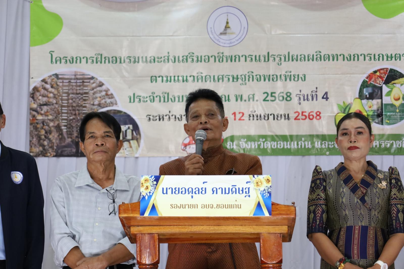 เมื่อวันที่ 10 กันยายน 2568 เวลา 10.30 น. องค์การบริหารส่วนจังหวัดขอนแก่น นำโดยนายวัฒนา ช่างเหลา นายกองค์การบริหารส่วนจังหวัดขอนแก่น มอบหมายให้นายอดุลย์ คามดิษฐ์ รองนายกองค์การบริหารส่วนจังหวัดขอนแก่น เป็นประธานในพิธีเปิดโครงการฝึกอบรมและส่งเสริมอาชีพการแปรรูปผลผลิตทางการเกษตรตามแนวคิดเศรษฐกิจพอเพียง ประจำปีงบประมาณ 2568 รุ่นที่ 4 โดยมีนางสาวสุธิดา อุ่นสนธิ์ หัวหน้าฝ่ายอำนวยการ สำนักปลัดองค์การบริหารส่วนจังหวัดขอนแก่น กล่าวรายงานถึงวัตถุประสงค์การจัดโครงการ มุ่งเน้นการสร้างองค์ความรู้และทักษะในการเพิ่มมูลค่าผลผลิตทางการเกษตร เพื่อสร้างรายได้ที่มั่นคงและยั่งยืนให้แก่เกษตรกรในพื้นที่ นายอดุลย์ คามดิษฐ์ ประธานในพิธี ได้กล่าวว่า “การแปรรูปผลผลิตทางการเกษตรถือเป็นการเพิ่มมูลค่าและสร้างโอกาสทางเศรษฐกิจที่สำคัญ เกษตรกรไม่เพียงแต่จะมีรายได้เพิ่มขึ้นจากการจำหน่ายผลผลิตสด แต่ยังสามารถสร้างผลิตภัณฑ์ใหม่ ๆ ที่ตรงกับความต้องการของตลาดได้ อบจ.ขอนแก่น จึงมุ่งเน้นการส่งเสริมการเรียนรู้ควบคู่กับการนำหลักเศรษฐกิจพอเพียงมาประยุกต์ใช้ เพื่อให้ประชาชนมีอาชีพที่มั่นคงและสามารถพึ่งพาตนเองได้อย่างยั่งยืน”