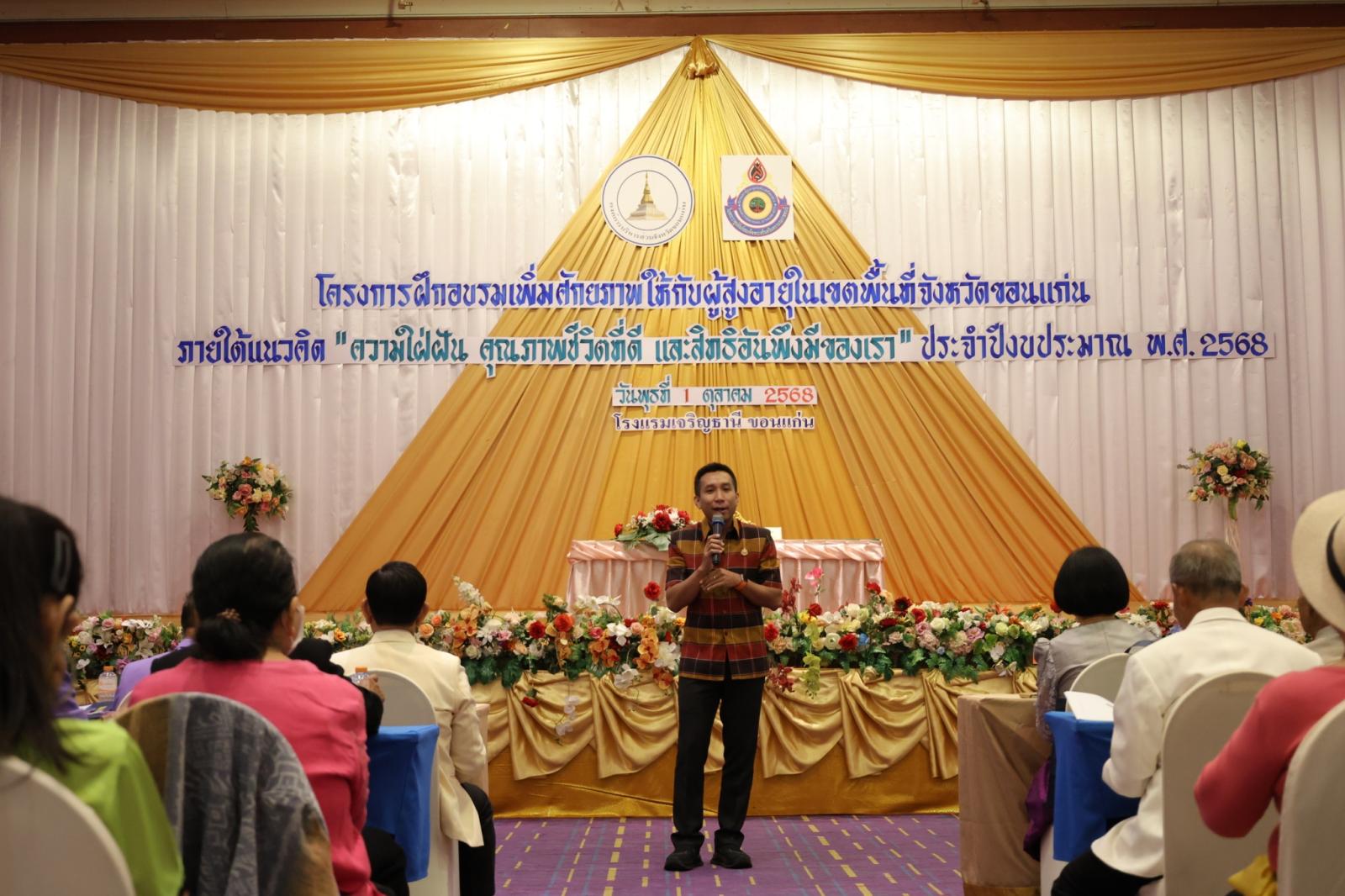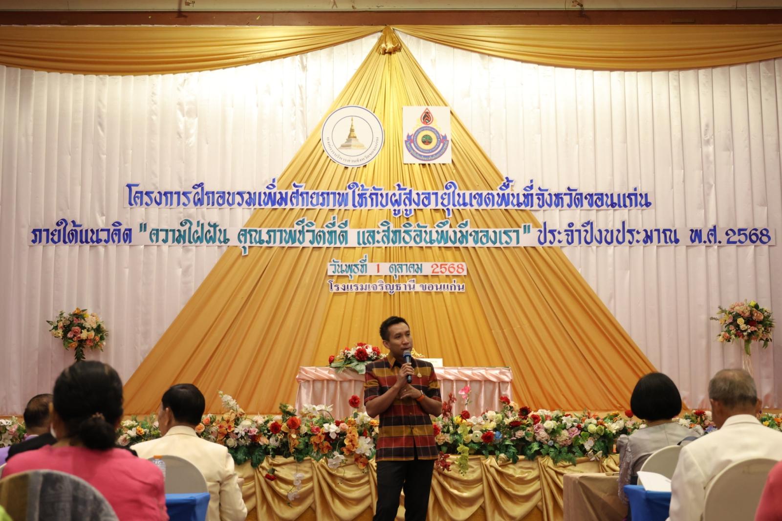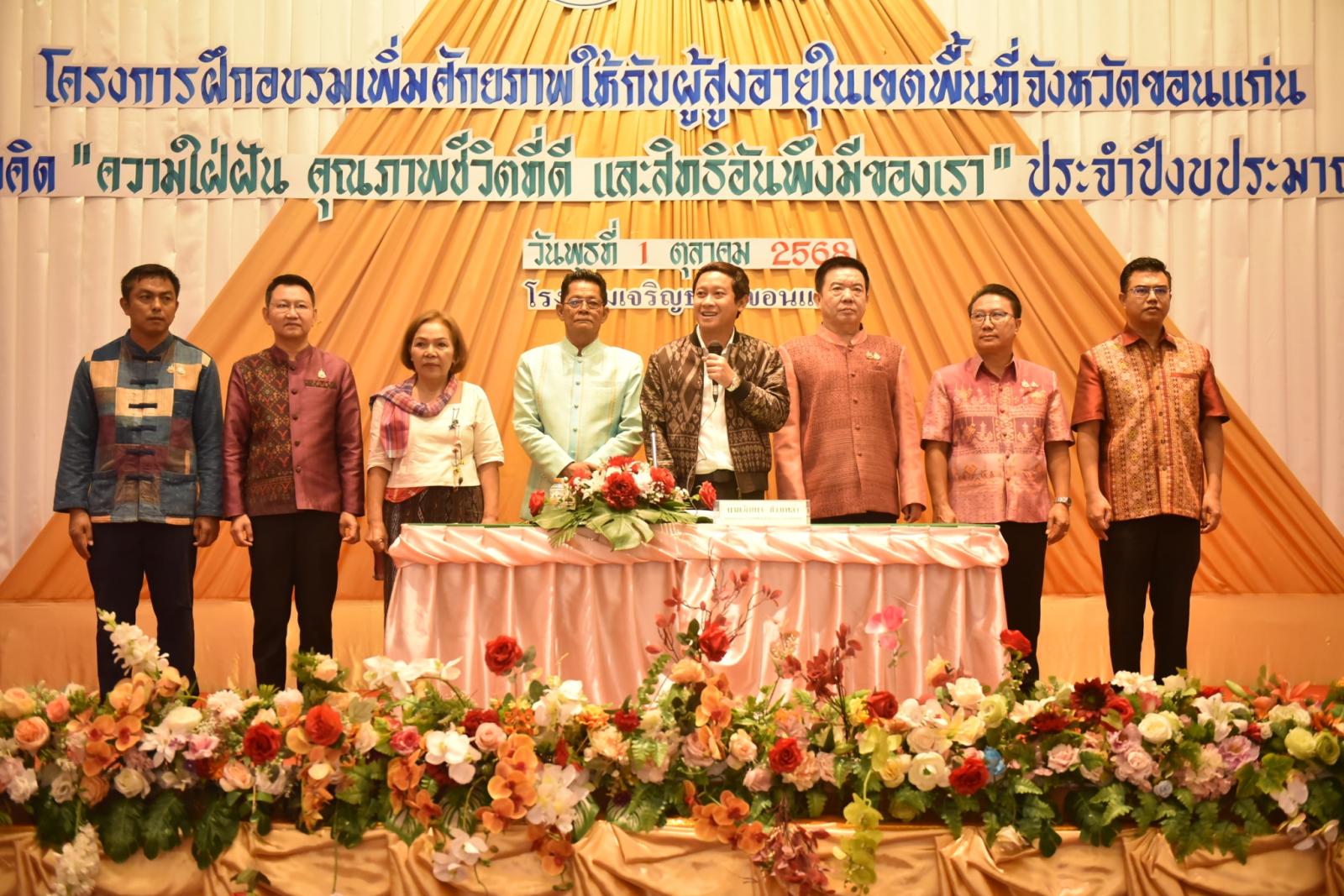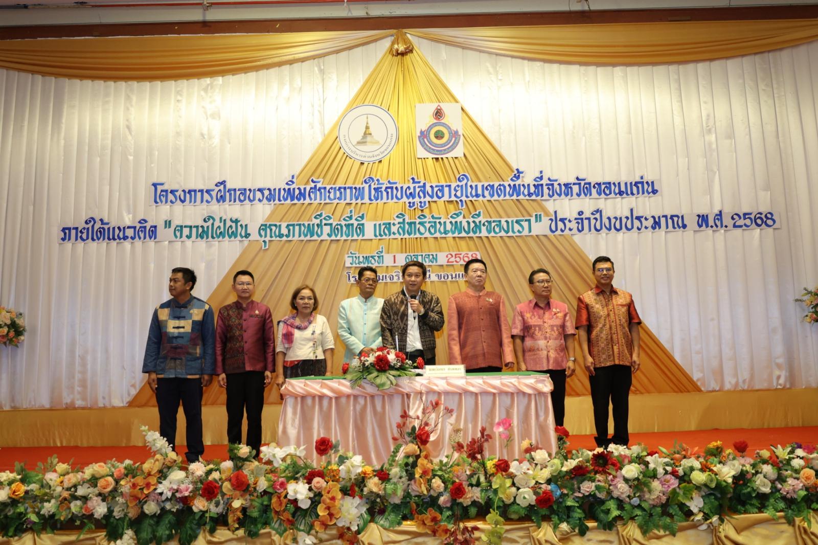 องค์การบริหารส่วนจังหวัดขอนแก่น ร่วมกับ สมาคมสภาผู้สูงอายุแห่งประเทศไทยในพระราชูปถัมภ์สมเด็จพระศรีนครินทราบรมราชชนนีประจำจังหวัดขอนแก่น จัด โครงการอบรมเพิ่มศักยภาพให้แก่ผู้สูงอายุในเขตพื้นที่จังหวัดขอนแก่น ประจำปีงบประมาณ พ.ศ. 2568 ภายใต้แนวคิด "ความใฝ่ฝัน คุณภาพชีวิตที่ดี และสิทธิอันพึงมีของเรา" เมื่อวันที่ 1 ตุลาคม 2568 ณ โรงแรมเจริญธานีขอนแก่น จังหวัดขอนแก่น เพื่อยกย่องคุณค่าและพัฒนาศักยภาพผู้สูงอายุให้มีความเข้มแข็งทั้งร่างกายและจิตใจ