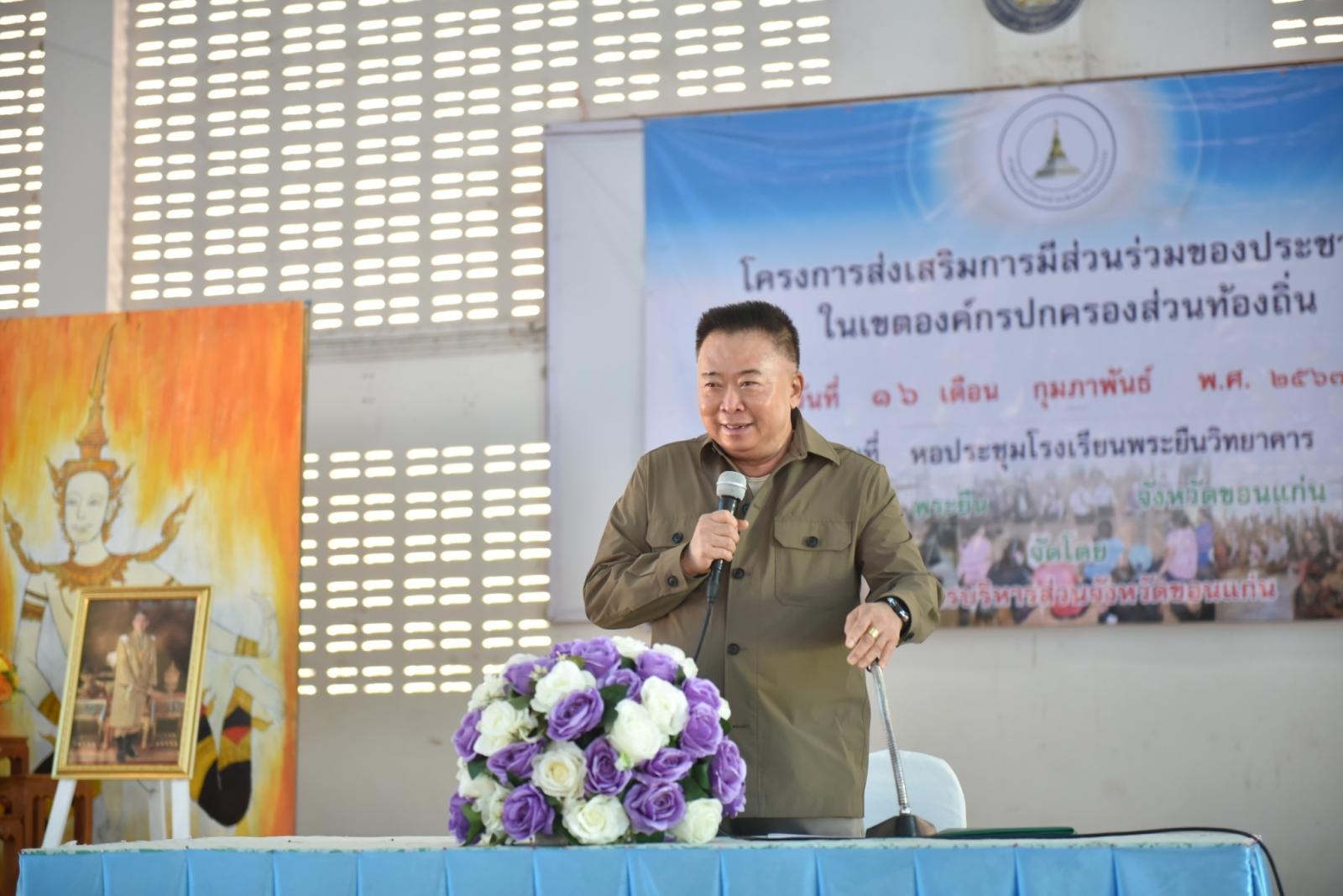 วันที่ 16 กุมภาพันธ์ 2567 เวลา 10.00 น. องค์การบริหารส่วนจังหวัดขอนแก่น นำโดย ดร.พงษ์ศักดิ์ ตั้งวานิชกพงษ์ นายกองค์การบริหารส่วนจังหวัดขอนแก่น เป็นประธานเปิดโครงการส่งเสริมการมีส่วนร่วมของประชาชนในเขตองค์กรปกครองส่วนท้องถิ่น อ.พระยืน จำนวน 300 คน โอกาสนี้มี นายสิทธิกุล ภูคำวงศ์ รอง นายก อบจ.ขอนแก่น, นายเพ็ชร มูลป้อม ที่ปรึกษานายก อบจ.ขอนแก่น ,นายสมาส นามพิกุล ส.อบจ.ขอนแก่น เขต อ.พระยืน พร้อมด้วย นายศักดิ์ดา ต้นคชสาร นายอำเภอพระยืน ผู้นำท้องที่ ผู้นำท้องถิ่น และคณะผู้บริหาร หัวหน้าส่วนราชการ เจ้าหน้าที่ อบจ.ขอนแก่น ร่วมเป็นเกียรติในพิธี ณ หอประชุมโรงเรียนพระยืนวิทยาคาร อำเภอพระยืน จังหวัดขอนแก่น
