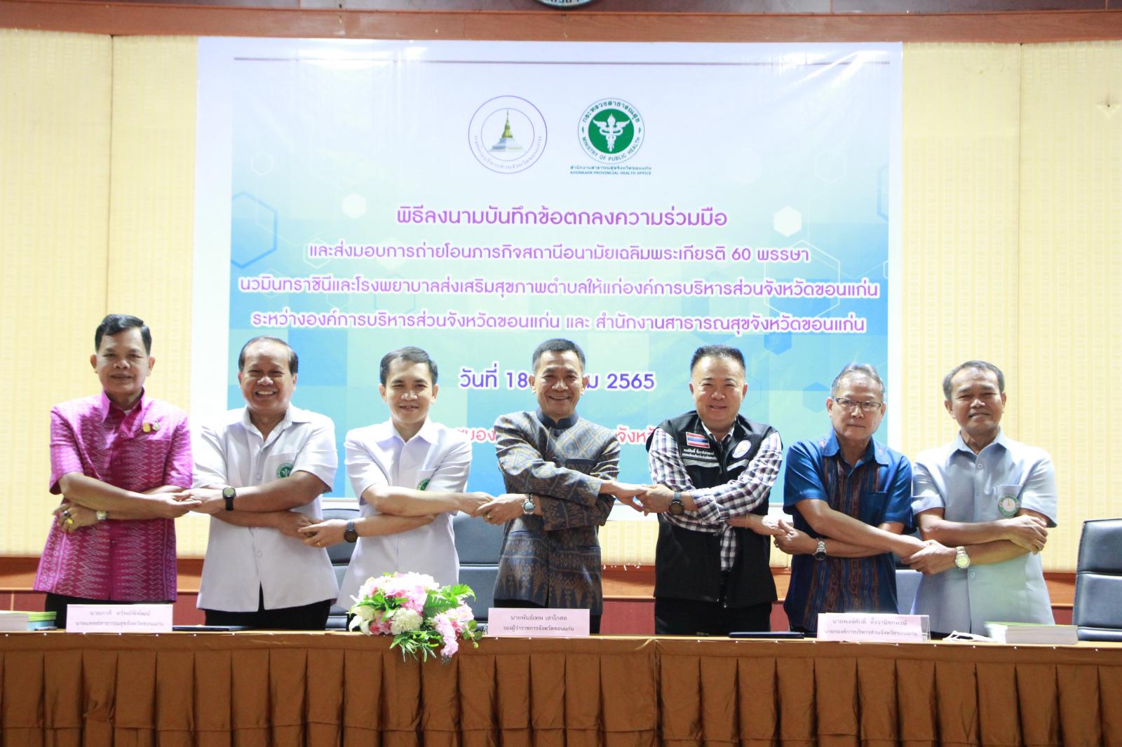 เมื่อวันที่ 18 ตุลาคม 2565 เวลา 09.00 น. ดร.พงษ์ศักดิ์ ตั้งวานิชกพงษ์ นายก อบจ.ขอนแก่น ร่วมลงนามในพิธีลงนามความร่วมมือ (MOU) การถ่ายโอนภารกิจสถานีอนามัยเฉลิมพระเกียรติ 60 พรรษา นวมินทราชินีและโรงพยาบาลส่งเสริมสุขภาพตำบลให้องค์การบริหารส่วนจังหวัดขอนแก่น ซึ่งได้รับเกียรติจาก นายพันธุ์เทพ เสาโกศล รองผู้ว่าราชการจังหวัดขอนแก่น เป็นประธานและสักขีพยานในการลงนาม (MOU) โดยมี นายธีระชัย แสนภูวา ท้องถิ่นจังหวัดขอนแก่น, นายภาคี ทรัพย์พิพัฒน์ นายแพทย์สาธารณสุขจังหวัดขอนแก่น, นายอดุลย์ บำรุง ผอ.รพ.บ้านไผ่ ในนามประธานชมรมผู้อำนวยการโรงพยาบาลชุมชน จังหวัดขอนแก่น ,นายวงษ์เสน่ห์ เครื่องฉาย สสอ.น้ำพอง ในนามประธานชมรมสาธารณสุขแห่งประเทศไทย สาขาจังหวัดขอนแก่น และนายคะนึง พาที ผอ.รพ.สต.หัวหนอง อำเภอบ้านไผ่ ในนามประธานชมรมผู้อำนวยการโรงพยาบาลโรงพยาบาลส่งเสริมสุขภาพตำบล จังหวัดขอนแก่น ร่วมลงนามความร่วมมือ (MOU) ในโอกาสนี้มี นายสิทธิกุล ภูคำวงศ์, นายธาดา พรหมสาขา ณ สกลนคร, นายประสิทธิ์ ทองแท่งไทย รองนายก อบจ.ขอนแก่น, ว่าที่ร้อยเอกพงเจตน์ พรกุณา ปลัด อบจ.ขอนแก่น,นายนพกุล ปัญญาแก้ว, นางอาซีซะห์ ว่องไว รองปลัด อบจ.ขอนแก่น หัวหน้าส่วนราชการ อบจ.ขอนแก่น และผู้แทนจากโรงพยาบาลส่งเสริมสุขภาพตำบลในพื้นที่จังหวัดขอนแก่น เข้าร่วมเป็นเกียรติ ณ หอประชุมองค์การบริหารส่วนจังหวัดขอนแก่น อ.เมืองขอนแก่น จ.ขอนแก่น