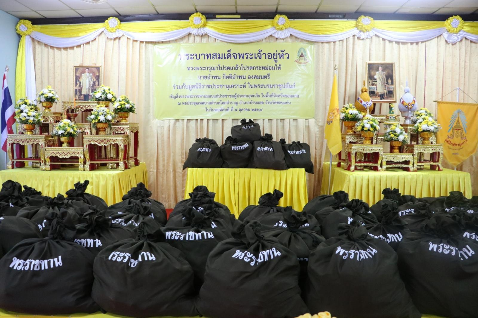 เมื่อวันที่ 7 ตุลาคม 2564 เวลา 09.00 น. ดร.พงษ์ศักดิ์ ตั้งวานิชกพงษ์ นายก อบจ.ขอนแก่น มอบหมายให้ นายสิทธิกุล ภูคำวงศ์ รองนายก อบจ.ขอนแก่น เข้าร่วมพิธีมอบสิ่งของพระราชทานแก่ประชาชนผู้ประสบอุทกภัย ซึ่ง พระบาทสมเด็จพระเจ้าอยู่หัวทรงโปรดเกล้าโปรดกระหม่อม ให้ นายอำพน กิตติอำพน องคมนตรี ร่วมกับ มูลนิธิราชประชานุเคราะห์ในพระบรมราชูปถัมภ์ เชิญสิ่งของพระราชทานมอบให้แก่ประชาชนผู้ประสบอุทกภัย จำนวน 3,000 ชุด เพื่อมอบแก่ประชาชนผู้ประสบอุกภัย ในพื้นที่จังหวัดขอนแก่น รวม 10 อำเภอ ประกอบด้วย อำเภอบ้านแฮด แวงน้อย แวงใหญ่ โนนศิลา บ้านไผ่ พระยืน หนองเรือ โคกโพธิ์ไชย มัญจาคีรี และอำเภอชนบท โดยมี ดร.สมศักดิ์ จังตระกุล ผู้ว่าราชการจังหวัดขอนแก่น พร้อมด้วย นายอำเภอทั้ง 10 อำเภอ เป็นผู้แทนประชาชนที่ประสบอุทกภัยรับมอบ ในโอกาสนี้มี นางนริศรา อรุณเดชาชัย ส.อบจ.ขอนแก่น เขต อ.บ้านแฮด ผู้นำท้องที่ ผู้นำท้องถิ่น เข้าร่วมเป็นเกียรติ ณ ห้องประชุมเทศบาลตำบลโคกสำราญ อ.บ้านแฮด จ.ขอนแก่น