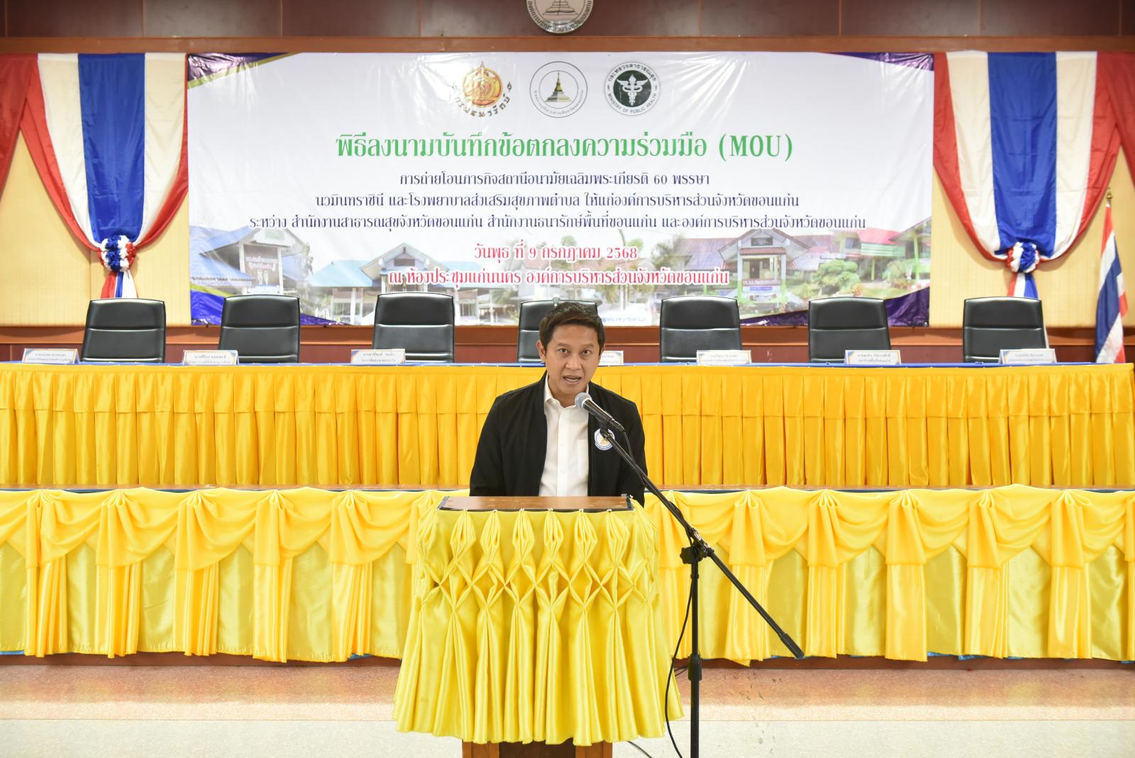 เมื่อวันที่ 9 กรกฎาคม 2568 เวลา 14.00 น. นายวัฒนา ช่างเหลา นายกองค์การบริหารส่วนจังหวัดขอนแก่น กล่าวต้อนรับและร่วมลงนามบันทึกข้อตกลงความร่วมมือฯ (MOU) ในพิธีลงนามบันทึกข้อตกลงความร่วมมือ (MOU) การถ่ายโอนภารกิจสถานีอนามัยเฉลิมพระเกียรติ 60 พรรษา นวมินทราชินี และโรงพยาบาลส่งเสริมสุขภาพตำบล ระหว่าง สำนักงานสาธารณสุขจังหวัดขอนแก่น สำนักงานธนารักษ์พื้นที่ขอนแก่น และองค์การบริหารส่วนจังหวัดขอนแก่น ซึ่งมีวัตถุประสงค์เพื่อให้การขอใช้ที่ราชพัสดุที่เป็นที่ตั้งสถานีอนามัยเฉลิมพระเกียรติ 60 พรรษา นวมินทราชินี และโรงพยาบาลส่งเสริมสุขภาพตำบล รวมทั้งสิ้น 251 แห่ง เป็นไปอย่างมีประสิทธิภาพ โดยมีเป้าประสงค์ร่วมกันจะดำเนินการพิจารณาอนุญาตให้องค์การบริหารส่วนจังหวัดขอนแก่นใช้ที่ราชพัสดุให้แล้วเสร็จภายในปี 2568 การจัดงานในครั้งนี้ได้รับเกียรติจาก นายศิริวัฒน์ พินิจพานิชย์ รองผู้ว่าราชการจังหวัดขอนแก่น เป็นประธาน โดยมี นายอภิชัย ลิมานนท์ นายแพทย์สาธารณสุขจังหวัดขอนแก่น, ดร.สุรทิน กรีดำรงศักดิ์ ธนารักษ์พื้นที่ขอนแก่น ร่วมลงนามในครั้งนี้ ทั้งนี้มี นายทศภณ วงษาลี เลขานุการนายกองค์การบริหารส่วนจังหวัดขอนแก่น, นายวิบูลย์ เรืองประเสริฐกุล ประธานสภาองค์การบริหารส่วนจังหวัดขอนแก่น, นางกรรณาการ์ สืบสารคาม เลขานุการสภาองค์การบริหารส่วนจังหวัดขอนแก่น, นายธีระศักดิ์ ผาเหลา ส.อบจ.ขอนแก่น อ.เมืองขอนแก่น เขต 4, นางอาซีซะห์ ว่องไว รองปลัดงอค์การบริหารส่วนจังหวัดขอนแก่น หัวหน้าส่วนราชการ ผู้อำนวยการโรงพยาบาลส่งเสริมสุขภาพตำบล เข้าร่วมเป็นเกียรติในพิธี ณ หอประชุมแก่นนคร องค์การบริหารส่วนจังหวัดขอนแก่น อ.เมืองขอนแก่น จ.ขอนแก่น