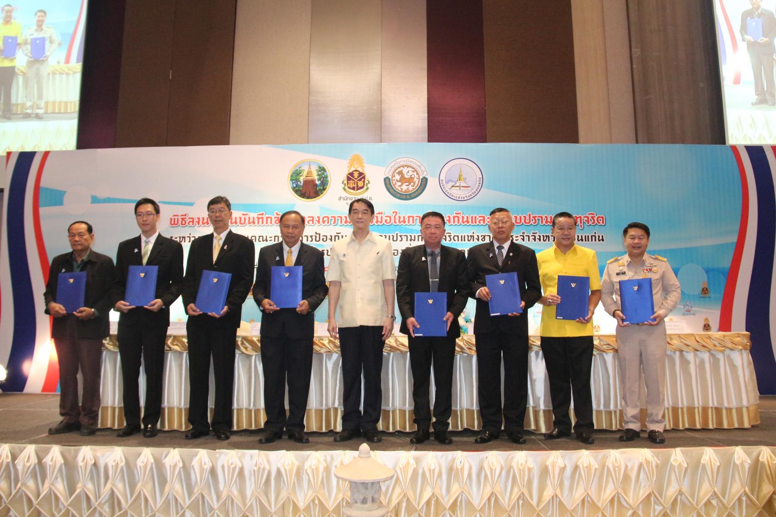 ในโอกาสนี้ องค์การบริหารส่วนจังหวัดขอนแก่น โดย นายก อบจ.ขอนแก่น ดร.พงษ์ศักดิ์ ตั้งวานิชกพงษ์ จัดให้มีพิธีลงนามบันทึกข้อตกลงความร่วมมือในการป้องกันและปราบปรามการทุจริต ระหว่าง สำนักงานคณะกรรมการป้องกันและปราบปรามการทุจริตแห่งชาติ ประจำจังหวัดขอนแก่น กับ องค์กรปกครองส่วนท้องถิ่นจังหวัดขอนแก่น โดยมี รองผู้ว่าราชการจังหวัดขอนแก่น นายประเสริฐ ลือชาธนานนท์ พร้อมด้วย ประธานกรรมการ ป.ป.ช.ขอนแก่น นายพยัต ชาญประเสริฐ ,ผู้อำนวยการสำนักงาน ป.ป.ช.ประจำจังหวัดขอนแก่น นายประวิตร บุตรศรี ,นายก อบจ.ขอนแก่น ดร.พงษ์ศักดิ์ ตั้งวานิชกพงษ์ ,นายกเทศมนตรีตำบลท่าพระ นายพิสุทธิ์ อนุตรอังกูร ,รองปลัดเทศบาลนครขอนแก่น นายกฤษณวรุณ ไชยนิจ ,นายก อบต.คำแคน นายหาญ อุปถัมภ์ และนายกเทศมนตรีเมืองบ้านไผ่ นายแพทย์เปรมศักดิ์ เพียยุระ เป็นผู้ร่วมลงนาม ทั้งนี้มีสมาชิกสภาองค์การบริหารส่วนจังหวัดขอนแก่น พร้อมด้วย คณะผู้บริหาร หัวหน้าส่วนราชการ ข้าราชการ ข้าราชการครูโรงเรียนในสังกัดองค์การบริหารส่วนจังหวัดขอนแก่น ทั้งนี้มีผู้แทนจากองค์กรปกครองส่วนท้องถิ่นทุกแห่งในเขตพื้นที่ จังหวัดขอนแก่น คณะกรรมการ ป.ป.ช.ประจำจังหวัดขอนแก่น ตลอดจนสื่อมวลชนทุกแขนง ในจังหวัดขอนแก่น ร่วมเป็นเกียรติในพิธี ณ โรงแรมเซ็นทราราคอนเวนชั่นเซ็นเตอร์ขอนแก่น