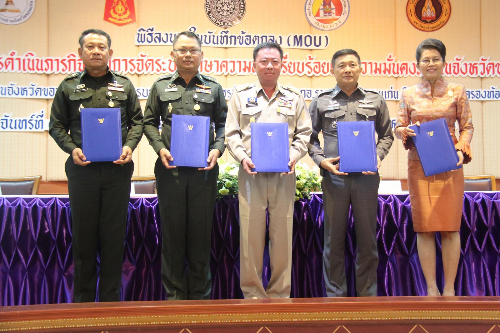 ในโอกาสนี้ องค์การบริหารส่วนจังหวัดขอนแก่น โดย นายก อบจ.ขอนแก่น ดร.พงษ์ศักดิ์ ตั้งวานิชกพงษ์ จัดให้มีพิธีลงนามบันทึกข้อตกลงความร่วมมือในการดำเนินภารกิจด้านการจัดระบบรักษาความสงบเรียบร้อย และความมั่นคงภายในจังหวัดขอนแก่น โดยมี ผู้บัญชาการมณฑลทหารบกที่ ๒๓ พลตรี ธรากฤต ทับทองสิทธ์, ผู้บังคับการตำรวจภูธร จังหวัดขอนแก่น พล.ต.ต.จิตรจรูญ ศรีวนิชย์ ,รองผู้อำนวยการรักษาความมั่นคงภายใน จังหวัดขอนแก่น พันเอก จตุรพงศ์ บกบน และคณบดีวิทยาลัยปกครองท้องถิ่น รศ.ดร.ศุภวัฒนากร วงศ์ธนวสุ เป็นผู้ร่วมลงนาม ทั้งนี้มีสมาชิกสภาองค์การบริหารส่วนจังหวัดขอนแก่น พร้อมด้วย คณะผู้บริหาร หัวหน้าส่วนราชการ ข้าราชการ ข้าราชการครูโรงเรียนในสังกัดองค์การบริหารส่วนจังหวัดขอนแก่น ตลอดจนสื่อมวลชนทุกแขนงในจังหวัดขอนแก่น ร่วมเป็นเกียรติในพิธี ณ หอประชุมองค์การบริหารส่วนจังหวัดขอนแก่น องค์การบริหารส่วนจังหวัดขอนแก่น อ.เมืองขอนแก่น จ.ขอนแก่น