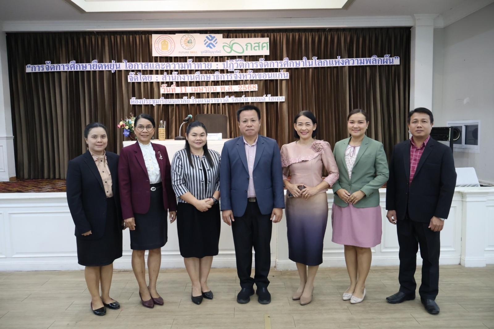 วันที่ 11 เมษายน 2568 เวลา 09.00 น. นายกองค์การบริหารส่วนจังหวัดขอนแก่น นายวัฒนา ช่างเหลา มอบหมายให้ ดร.วรรณภา สมตา ศึกษานิเทศก์ พร้อมด้วยดร.ภักดี ศิริพรรณ ในนามนายกสมาคมผู้บริหารสถานศึกษา สังกัด อบจ.ขอนแก่น ตัวแทนผู้บริหารสถานศึกษาและครูในสังกัด อบจ.ขอนแก่น ประกอบด้วย โรงเรียนเมืองพลพิทยาคม โรงเรียนสีชมพูศึกษา โรงเรียนพระยืนวิทยาคาร โรงเรียนซำสูงพิทยาคมและโรงเรียนซับสมบูรณ์พิทยาลัย เข้าร่วมงานประชุมเสวนา“การจัดการศึกษายืดหยุ่น โอกาสและความท้าทาย : ปฎิวัติการจัดการศึกษาในโลกแห่งความพลิกผัน” เพื่อแลกเปลี่ยนเรียนรู้แนวทางการจัดการศึกษาและเรียนรู้แบบยืดหยุ่นและมีคุณภาพ 1 โรงเรียน 3 รูปแบบ จัดโดย สำนักงานศึกษาธิการจังหวัดขอนแก่น และกองทุนเพื่อความเสมอภาคทางการศึกษา(กสศ.) ณ โรงแรมราชาวดี รีสอร์ท แอนด์โฮเทล