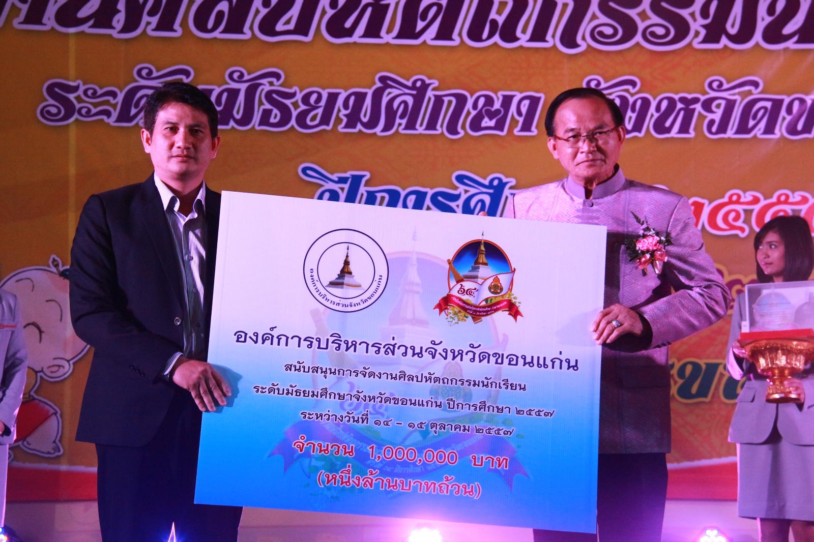 ในโอกาสนี้ อบจ.ขอนแก่น ได้มอบเงินสนับสนุนการจัดงาน โดยมี ผู้อำนวยการสำนักงานเขตพื้นที่การศึกษามัธยมศึกษา เขต 25 นายรังสรรค์ เถื่อนนาดี ให้เกียรติเป็นประธานรับมอบและมอบโล่การสนับสนุนการจัดงานให้องค์การบริหารส่วนจังหวัดขอนแก่น เพื่อเป็นขวัญและกำลังใจและสร้างความสัมพันธ์อันดีระหว่างหน่วยงาน ณ หอประชุม โรงเรียนนครขอนแก่น อ.เมืองขอนแก่น จ.ขอนแก่น