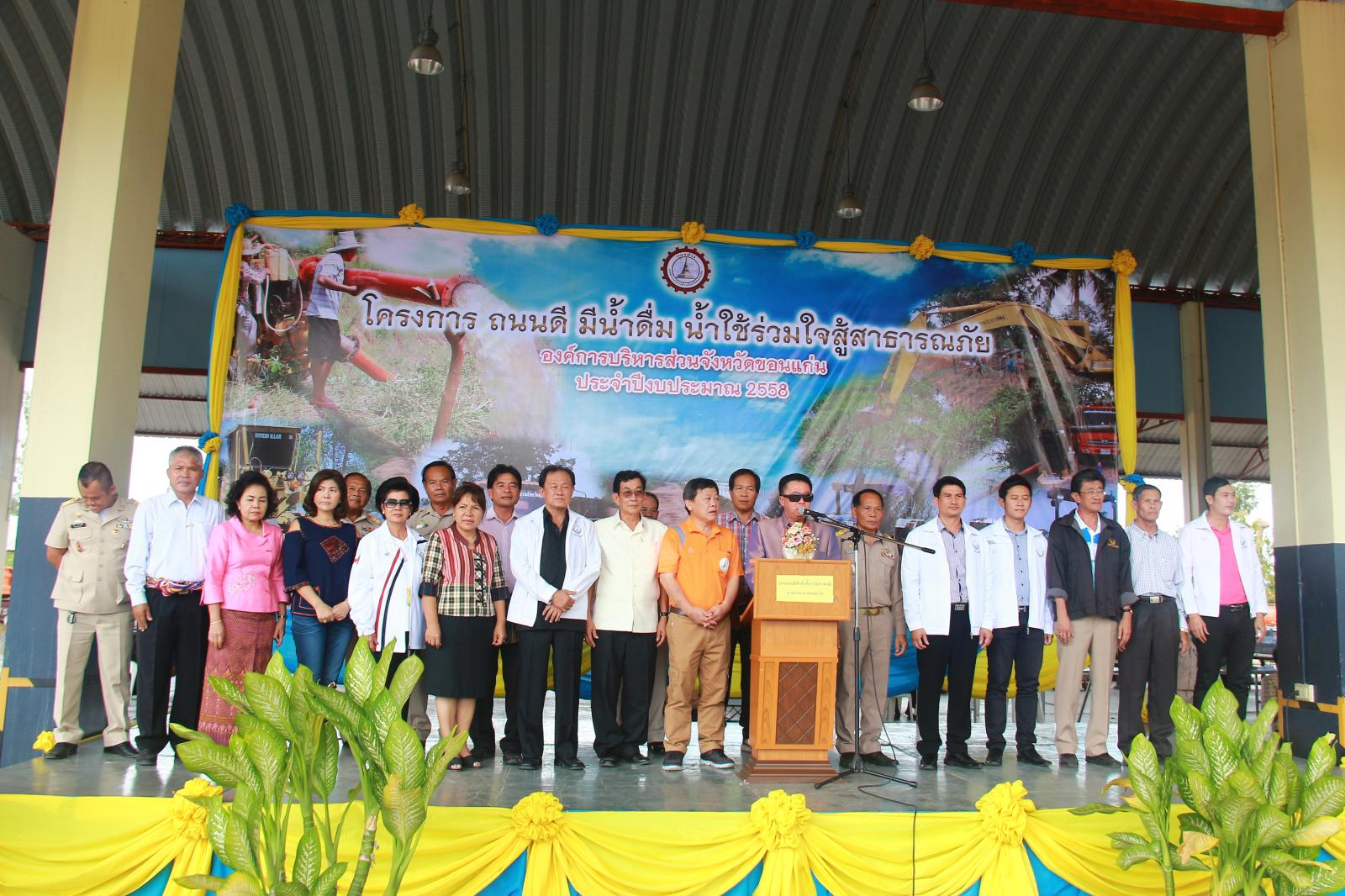 เมื่อวันที่ ๓ พฤศจิกายน ๒๕๕๗ นายก อบจ.ขอนแก่น ดร.พงษ์ศักดิ์ ตั้งวานิชกพงษ์ เป็นประธาน    ในพิธีเปิดโครงการ “ถนนดี มีน้ำดื่ม – น้ำใช้ รวมใจสู้สาธารณภัย” ประจำปีงบประมาณ 2558 ในโอกาสนี้มี รองนายก อบจ.ขอนแก่น นายสิทธิกุล ภูคำวงศ์ นายวัฒนา ช่างเหลา พร้อมด้วย สมาชิกสภาองค์การบริหารส่วนจังหวัดขอนแก่น ผู้บริหาร หัวหน้าส่วนราชการ และข้าราชการ อบจ.ขอนแก่น ตลอดจนตัวแทนสื่อมวลชนทุกแขนงในจังหวัดขอนแก่น เข้าร่วมพิธีเปิดในครั้งนี้ ณ ศูนย์เครื่องจักรกล กองช่าง องค์การบริหารส่วนจังหวัดขอนแก่น จังหวัดขอนแก่น
