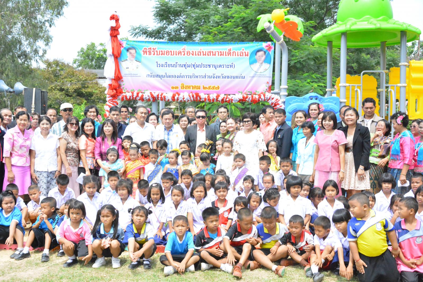 เมื่อวันพุธที่ 13 สิงหาคม 2557 ดร.พงษ์ศักดิ์ ตั้งวานิชกพงษ์ นายกองค์การบริหารส่วนจังหวัดขอนแก่น พร้อมด้วย นายสุชาติ ไตรองค์ถาวร ประธานสภาองค์การบริหารส่วนจังหวัดขอนแก่นได้ร่วมกันมอบเครื่องเล่นสนามเด็กเล่น ให้กับโรงเรียน    บ้านทุ่ม(ทุ่มประชานุเคราะห์) ตำบลบ้านทุ่ม อำเภอเมือง จังหวัดขอนแก่น เพื่อให้นักเรียนได้มีเครื่องเล่นที่มีความปลอดภัยและทันสมัย อันจะก่อให้เกิดการพัฒนาการด้านร่างกาย อารมณ์ และสติปัญญาแก่นักเรียนต่อไป โดยมีคณะบริหาร สมาชิกสภาตำบล ที่ปรึกษา เลขานุการ ประธานสภา กำนัน ผู้ใหญ่บ้าน ผู้นำชุมชน ประชาคมหมู่บ้าน คณะครู นักเรียน หัวหน้าหน่วยงานภาครัฐและเอกชน ร่วมให้การต้อนรับจำนวนมาก