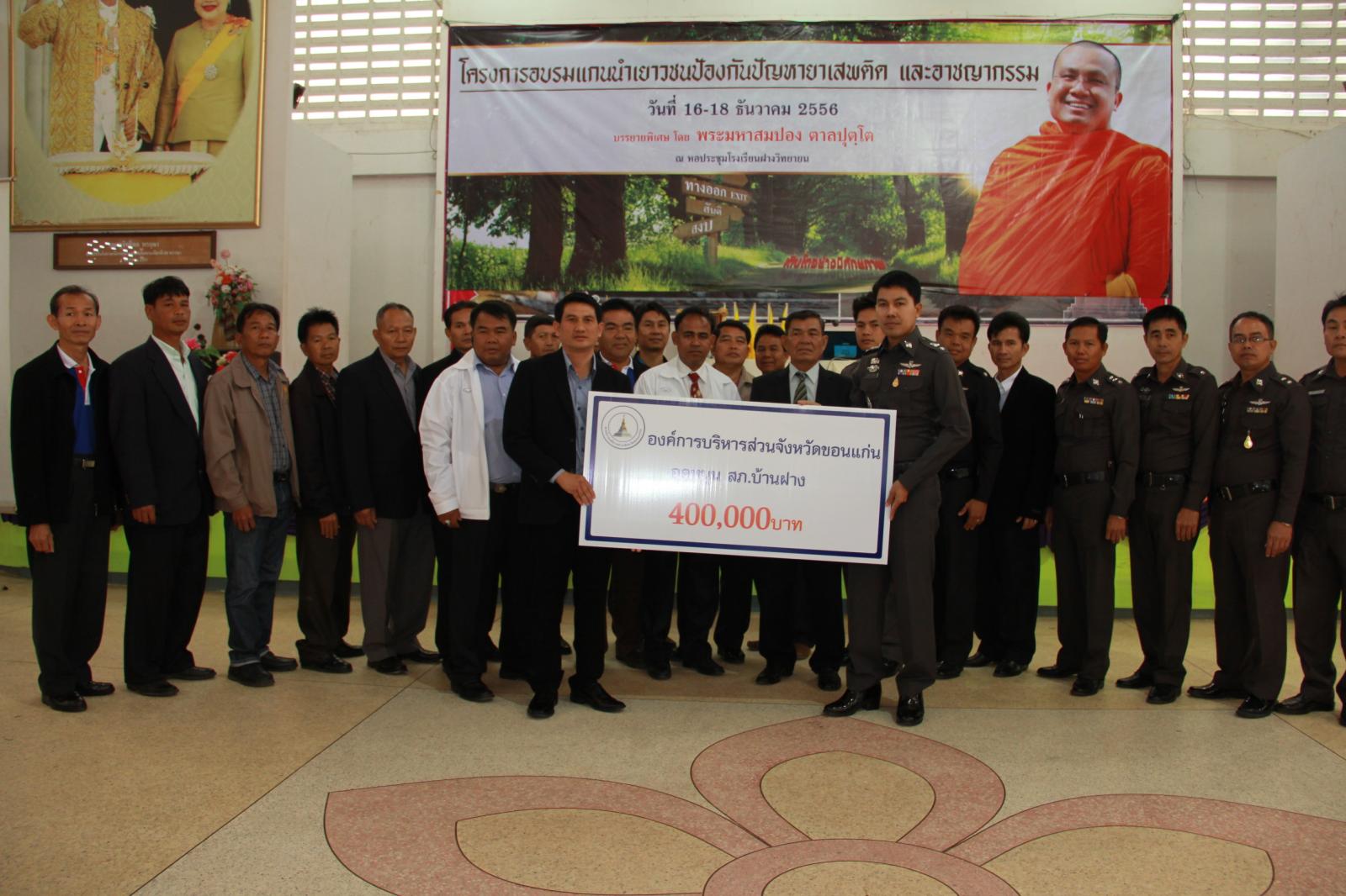 ในการนี้ องค์การบริหารส่วนจังหวัดขอนแก่น โดยนายสิทธิกุล ภูคำวงศ์ รองนายกองค์การบริหารส่วนจังหวัดขอนแก่น พร้อมด้วยนายธณัช เครือมา สมาชิกสภาองค์การบริหารส่วนจังหวัดขอนแก่น เขตอำเภอบ้านฝาง เป็นผู้แทนองค์การบริหารส่วนจังหวัดขอนแก่น ร่วมมอบเงินจำนวน ๔๐๐,๐๐๐ บาท ให้สถานีตำรวจภูธรบ้านฝาง นำไปดำเนินการโครงการดังกล่าวเพื่อสนับสนุนให้เยาวชน มีความรู้ความเข้าใจเกี่ยวกับปัญหายาเสพติดและรูปแบบการเกิดอาชญากรรมตลอดจนแนวทางการป้องกันที่อาจเกิดขึ้นกับตนเองและครอบครัว โดยมี พันตำรวจโท สรกฤช ราชภักดี รองผู้กำกับการ ป้องกันปราบปรามสถานีตำรวจภูธรบ้านฝาง เป็นผู้รับมอบ