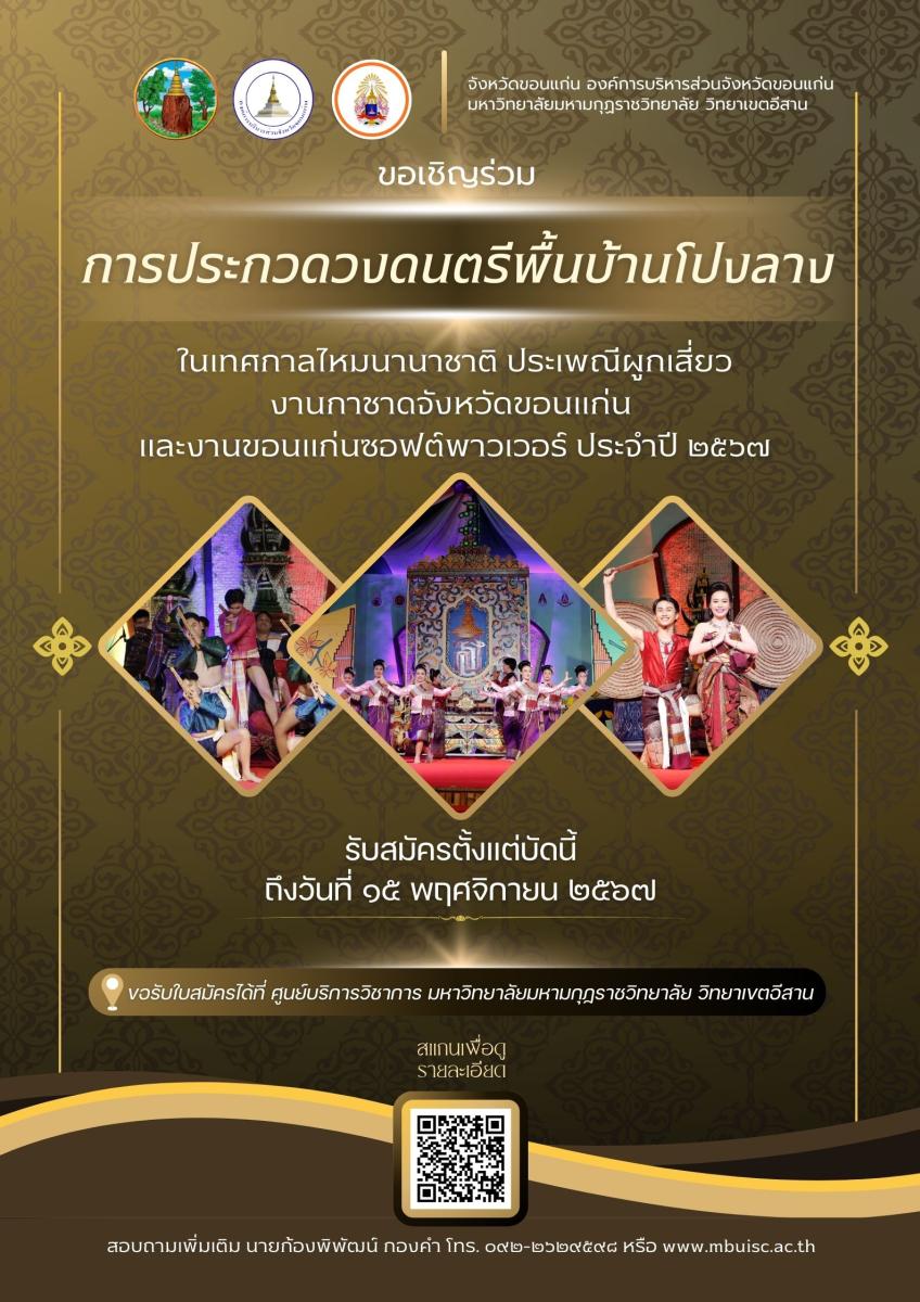 จังหวัดขอนแก่น องค์การบริหารส่วนจังหวัดขอนแก่น มหาวิทยาลัยมหามกุฏราชวิทยาลัย วิทยาเขตอีสาน ขอเชิญชวนร่วมการประกวดวงดนตรีพื้นบ้านโปงลาง ประเภทเด็กและเยาวชน รุ่นอายุไม่เกิน ๒๑ ปี ชิงถ้วยรางวัลและทุนส่งเสริมศิลปวัฒนธรรมกว่า ๑๐๐,๐๐๐ บาท ในงานเทศกาลไหมนานาชาติ ประเพณีผูกเสี่ยว งานกาชาดจังหวัดขอนแก่น และงานขอนแก่นซอฟต์พาวเวอร์ ประจำปี ๒๕๖๗ ในระหว่างวันที่ ๓๐ พฤศจิกายน ๒๕๖๗ ถึงวันที่ ๔ ธันวาคม ๒๕๖๗ ณ คุ้มวัฒนธรรม บริเวณหน้าศาลากลางจังหวัดขอนแก่น