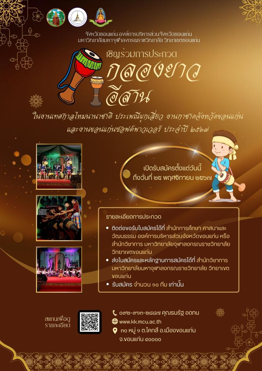 จังหวัดขอนแก่น องค์การบริหารส่วนจังหวัดขอนแก่น มหาวิทยาลัยมหาจุฬาลงกรณราชวิทยาลัย วิทยาเขตขอนแก่น ขอเชิญชวนร่วมการประกวดกลองยาวอีสาน ในงานเทศกาลไหมนานาชาติ ประเพณีผูกเสี่ยว งานกาชาดจังหวัดขอนแก่น และงานขอนแก่นซอฟต์พาวเวอร์ ประจำปี ๒๕๖๗ ประเภทประชาชนทั่วไป ไม่จำกัดอายุ รับสมัครจำนวน ๑๐ ทีมเท่านั้น ชิงถ้วยรางวัลเกียรติยศและเงินรางวัล จากองค์การบริหารส่วนจังหวัดขอนแก่นกว่า ๗๐,๐๐๐ บาท ซึ่งกิจกรรมจัดขึ้นในระหว่างวันที่ ๒๙ พฤศจิกายน ๒๕๖๗ ถึงวันที่ ๑๐ ธันวาคม ๒๕๖๗ ณ คุ้มวัฒนธรรม บริเวณหน้าศาลากลางจังหวัดขอนแก่น