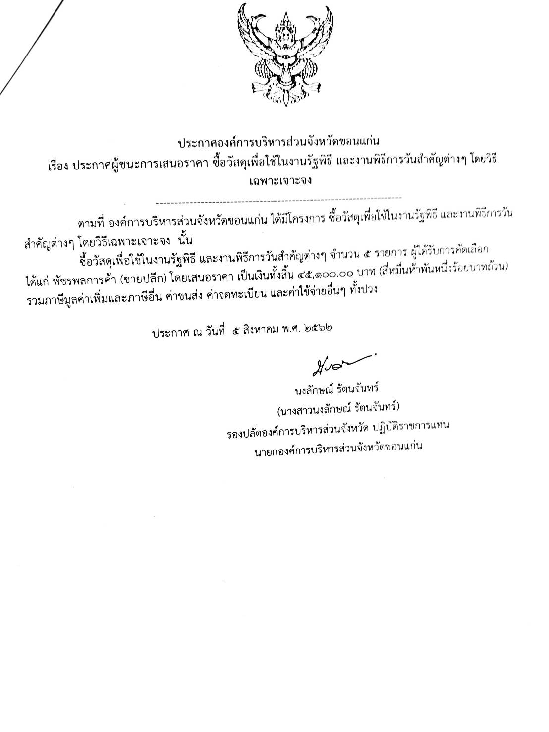 ประกาศผู้ชนะการเสนอราคา ซื้อวัสดุเพื่อใช้ในงานรัฐพิธี และงานพิธีการสำคัญต่างๆ (สำนักปลัดฯ 45,100.-)