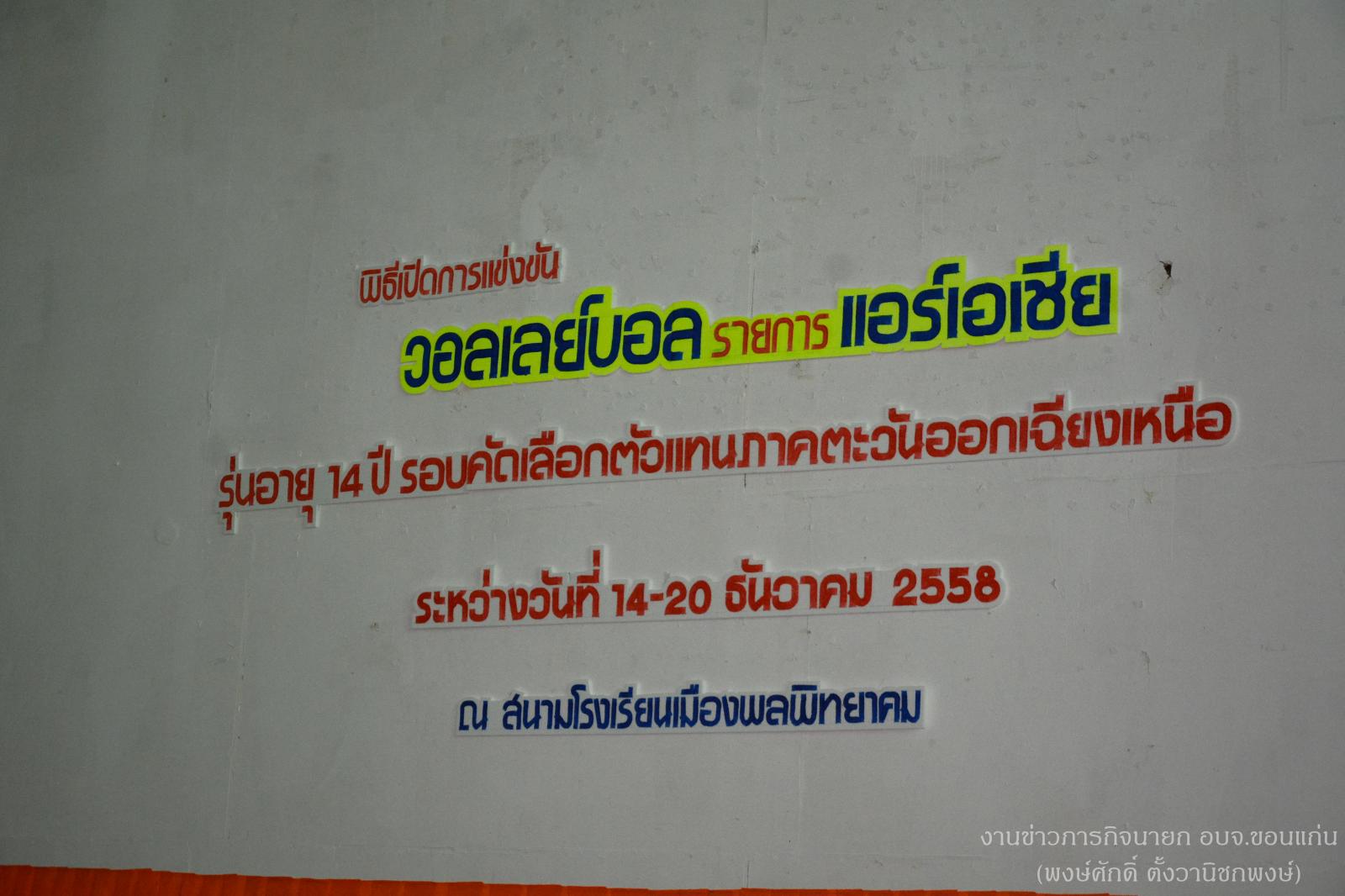 ดร.พงษ์ศักดิ์ ตั้งวานิชกพงษ์ นายกองค์การบริหารส่วนจังหวัดขอนแก่น เป็นประธานในพิธีเปิดการแข่งขันวอลเลย์บอลรายการ "แอร์เอเชีย" รุ่นอายุ 14 ปี รอบคัดเลือกตัวแทนภาคตะวันออกเฉียงเหนือ โดยมีนายประเวศ เทศเรียน ผู้อำนวยการโรงเรียน กล่าวรายงานการจัดการแข่งขันฯ ในครั้งนี้ พร้อมด้วย นายคจิตร พงษ์คำพันธ์ นายคงฤทธิ์ อัศวพัฒนากูล สมาชิกสภาองค์การบริหารส่วนจังหวัดขอนแก่น เขต อำเภอพล คณะครู นักเรียน และประชาชนในพื้นที่ ส่วนราชการต่างๆ ร่วมในพิธี เมื่อวันที่ 14 ธันวาคม 2558 ณ สนามโรงเรียนเมืองพลพิทยาคม อำเภอพล จังหวัดขอนแก่น