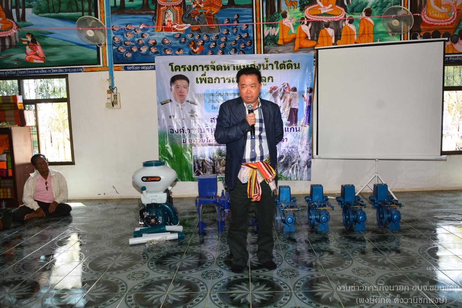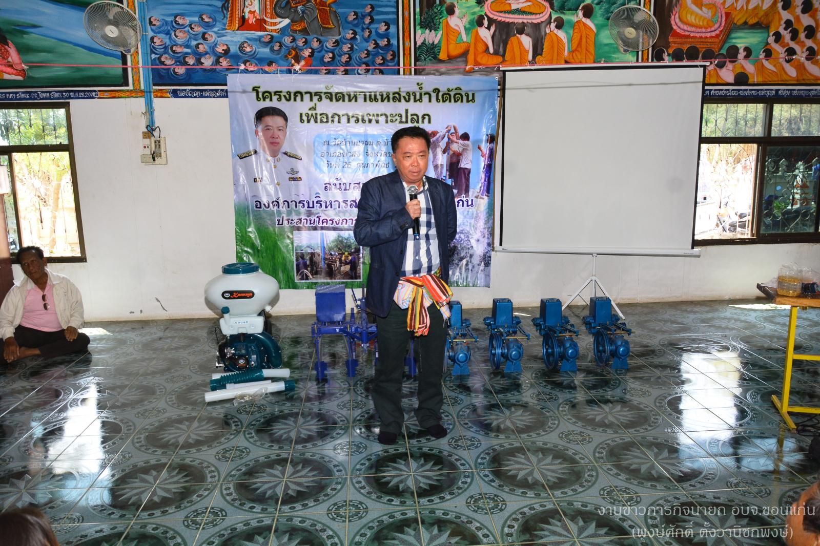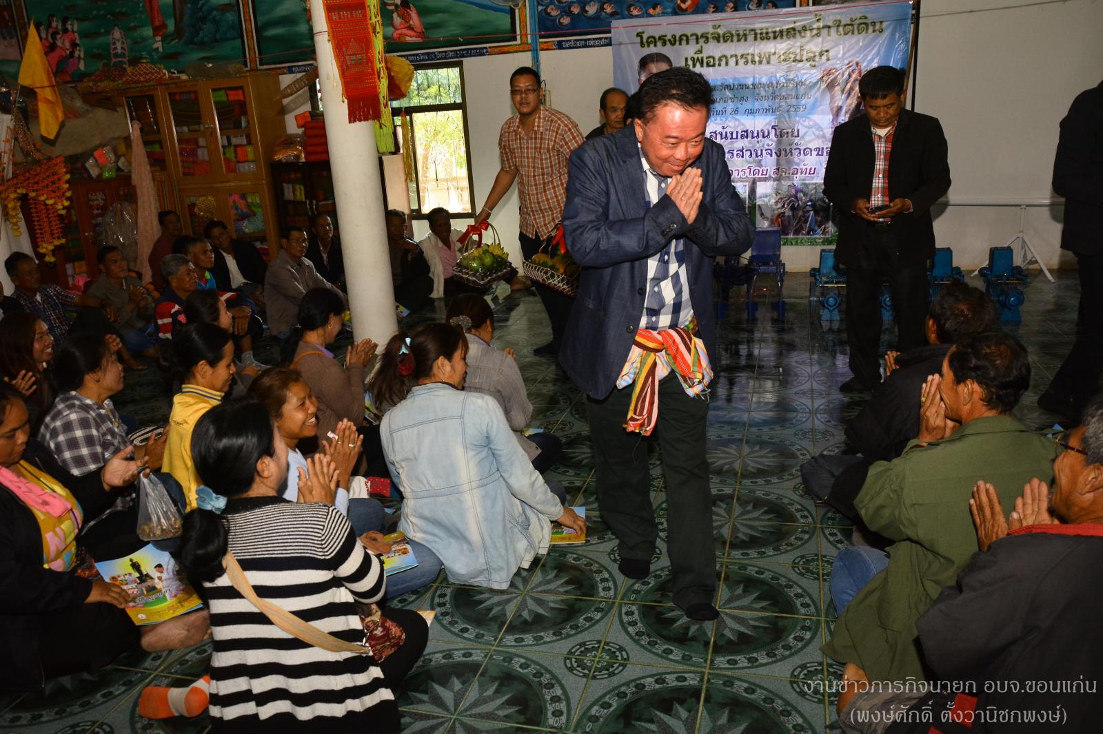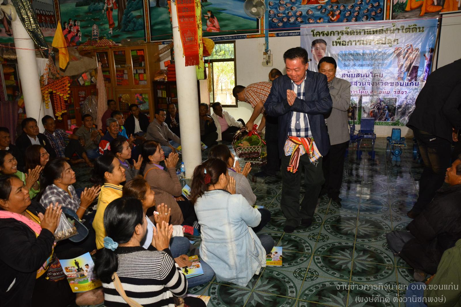 ดร.พงษ์ศักดิ์ ตั้งวานิชกพงษ์ นายกองค์การบริหารส่วนจังหวัดขอนแก่น เป็นประธานเปิดโครงการจัดหาแหล่งน้ำไต้ดินเพื่อการเพาะปลูก ให้แก่กลุ่มวิสาหกิจชุมชนผู้ใช้น้ำบาดาลเพื่อการเกษตรนำร่องแบบเศรษฐกิจพอเพียง ตำบลบ้านโนน อำเภอซำสูง จังหวัดขอนแก่น โดยมีนายสุดใจ ทุยบึงฉิม สมาชิกสภาองค์การบริหารส่วนจังหวัดขอนแก่น เขต อ.เมือง ร่วมให้ความรู้และพบปะผู้เข้าร่วมโครงการ เมื่อวันที่ 26 กุมภาพันธ์ 2559 ณ วัดบ้านนายม ตำบลบ้านโนน อำเภอซำสูง จังหวัดขอนแก่น