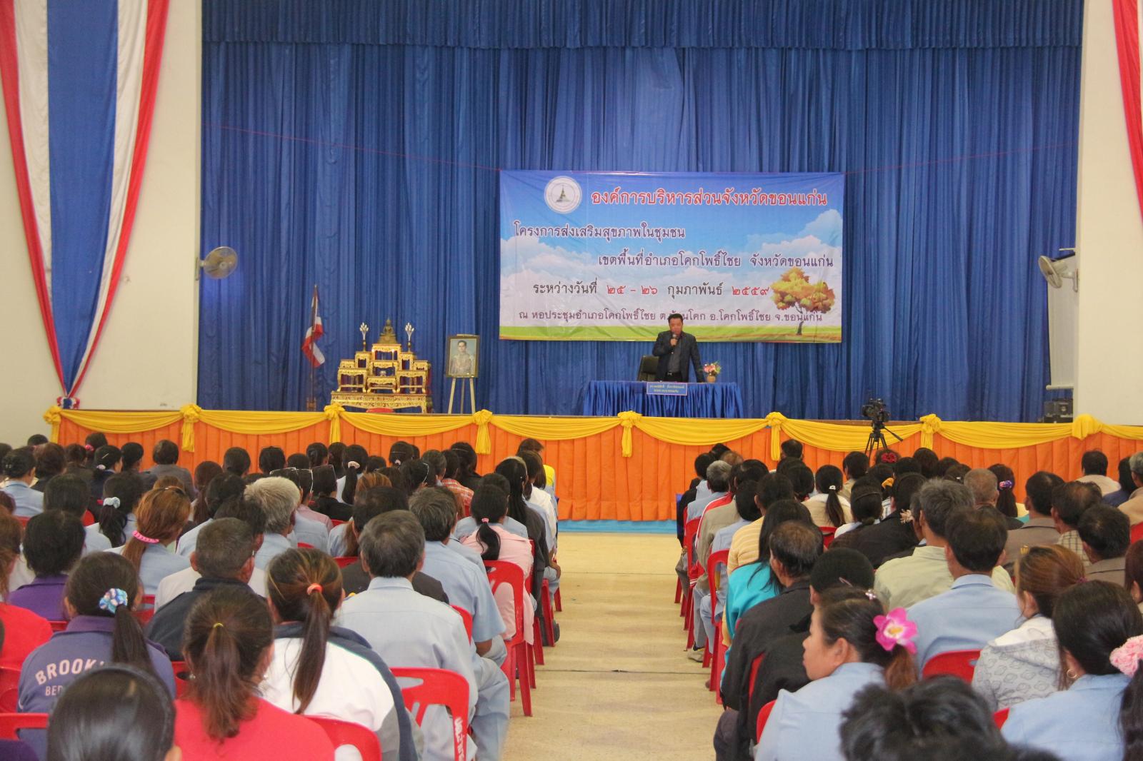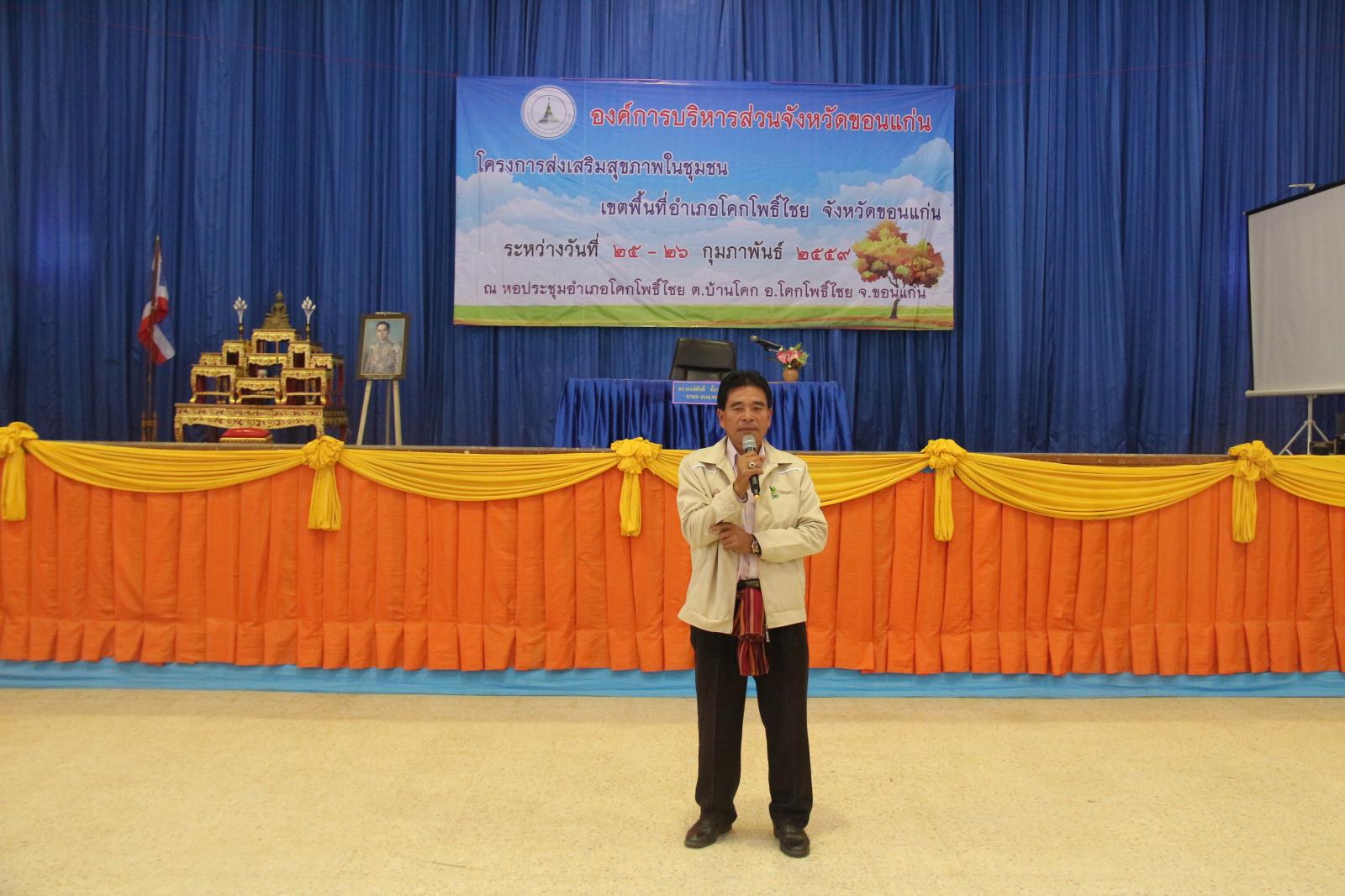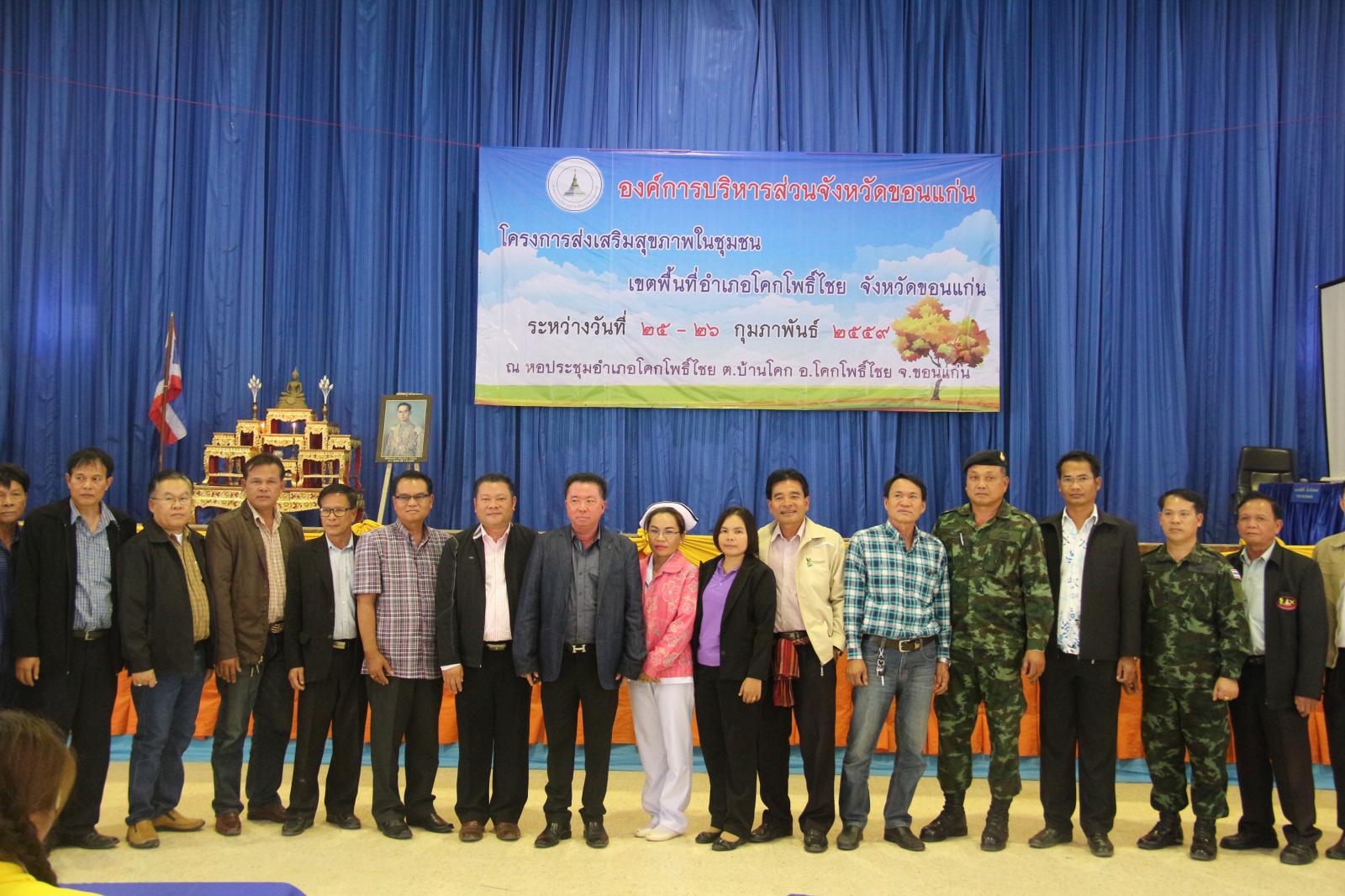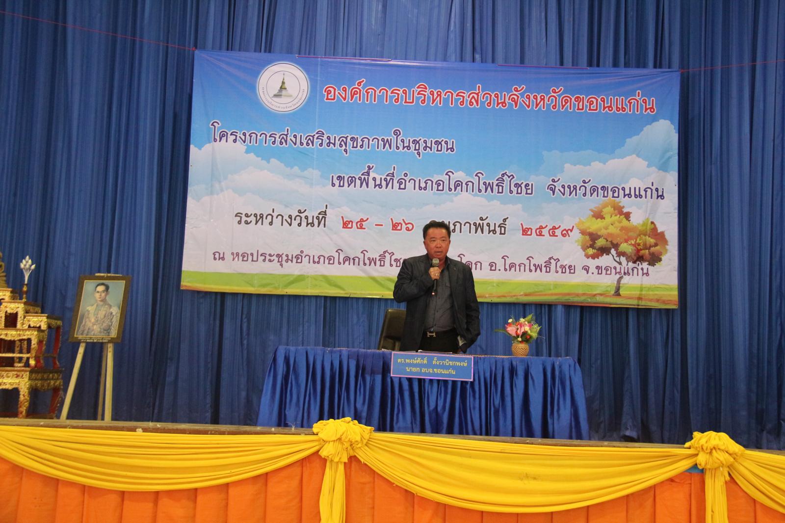 เมื่อวันที่ ๒๕ กุมภาพันธ์ ๒๕๕๙ นายก อบจ.ขอนแก่น ดร.พงษ์ศักดิ์ ตั้งวานิชกพงษ์ เป็นประธานเปิดโครงการส่งเสริมสุขภาพชุมชน เขตพื้นที่อำเภอโคกโพธิ์ไชย ประจำปี ๒๕๕๙ มีวัตถุประสงค์เพื่อพัฒนาศักยภาพและเพิ่นพูนความรู้ ให้แก่ผู้นำชุมชนในการปฏิบัติงานด้านสาธารณสุขและประชาชนทั่วไปได้มีส่วนร่วมในการดูแลสุขภาพของตนเองและชุมชนได้อย่างถูกต้องและมีประสิทธิภาพ โดยมี หัวหน้าสำนักปลัด อบจ. นายวรเวทย์ ดิเรกศรี เป็นผู้กล่าวรายงาน และมี ส.อบจ.ขอนแก่น เขต อ.โคกโพธิ์ไชย นายมีสวัสดิ์ ชมชัยภูมิ กล่าวต้อนรับ ในโอกาสนี้มี ส.อบจ.ขอนแก่น เขต อ.พระยืน นายสมาส นามพิกุล พร้อมด้วย นายอำเภอโคกโพธิ์ นายสันติ จัตุพันธ์ ,คณะผู้บริหาร รพ.สต. ในเขตอำเภอโคกโพธิ์ไชย และผู้นำท้องถิ่นในเขตอำเภอโคกโพธิ์ไชย เข้าร่วมเป็นเกียรติในพิธี ณ หอประชุมอำเภอโคกโพธิ์ไชย ต.บ้านโคก อ.โคกโพธิ์ไชย จ.ขอนแก่น