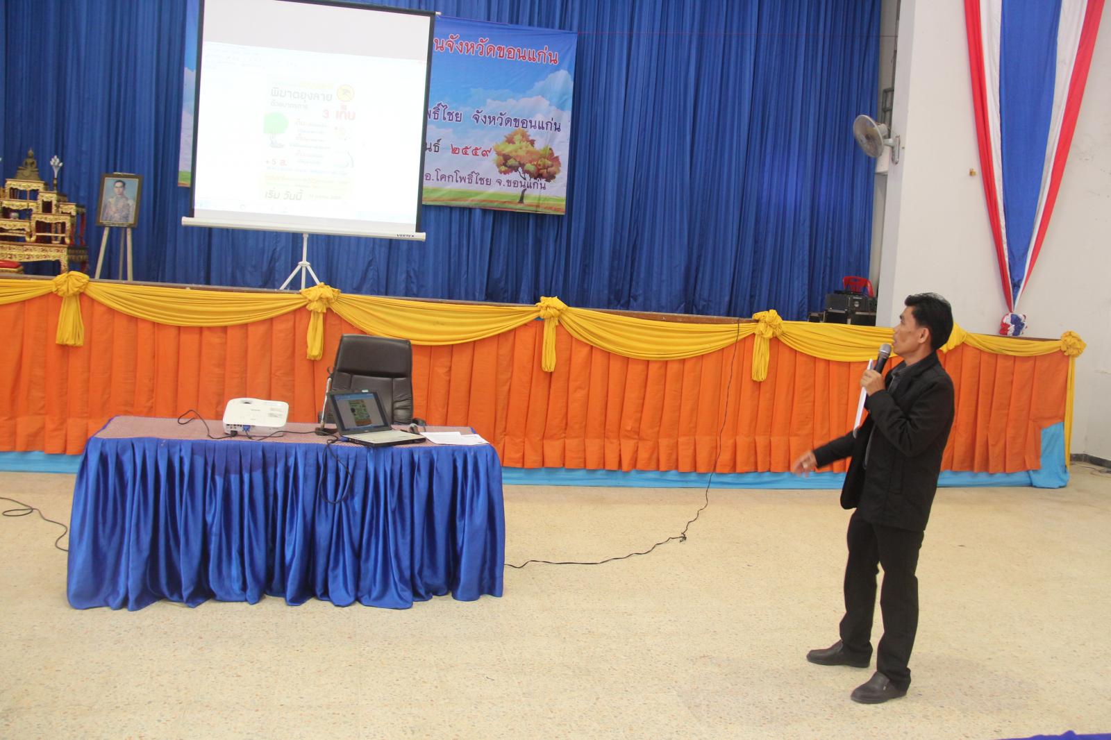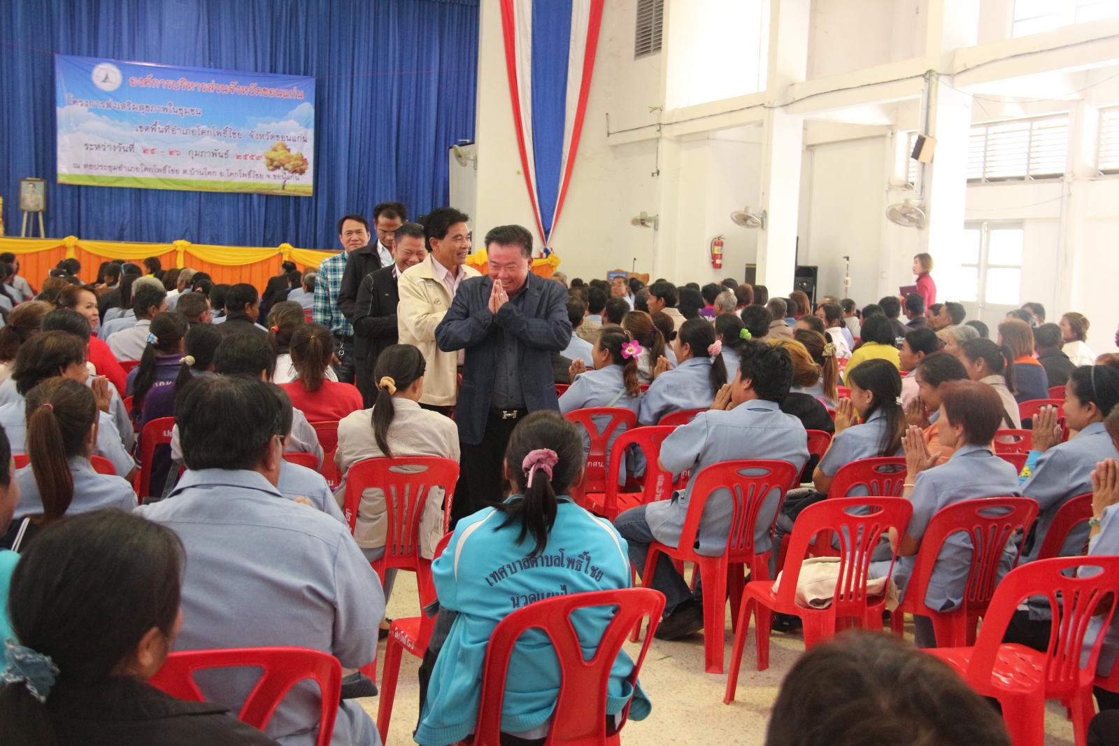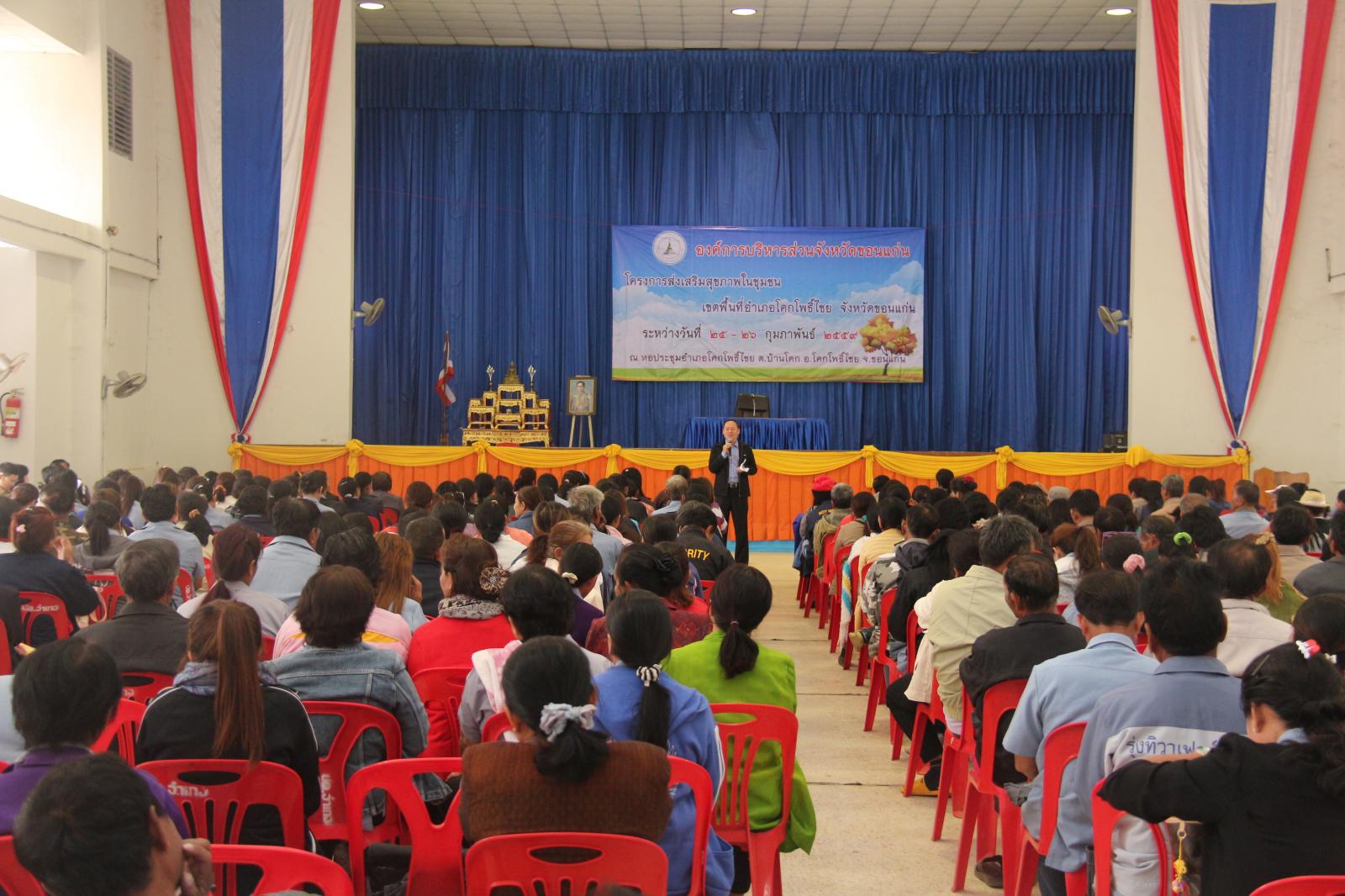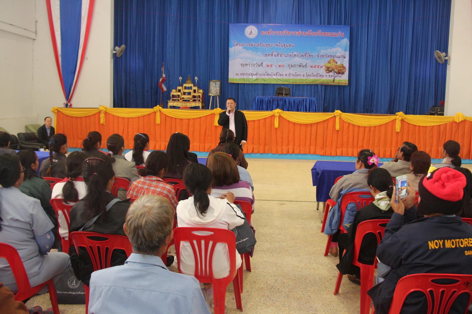 เมื่อวันที่ ๒๕ กุมภาพันธ์ ๒๕๕๙ นายก อบจ.ขอนแก่น ดร.พงษ์ศักดิ์ ตั้งวานิชกพงษ์ เป็นประธานเปิดโครงการส่งเสริมสุขภาพชุมชน เขตพื้นที่อำเภอโคกโพธิ์ไชย ประจำปี ๒๕๕๙ มีวัตถุประสงค์เพื่อพัฒนาศักยภาพและเพิ่นพูนความรู้ ให้แก่ผู้นำชุมชนในการปฏิบัติงานด้านสาธารณสุขและประชาชนทั่วไปได้มีส่วนร่วมในการดูแลสุขภาพของตนเองและชุมชนได้อย่างถูกต้องและมีประสิทธิภาพ โดยมี หัวหน้าสำนักปลัด อบจ. นายวรเวทย์ ดิเรกศรี เป็นผู้กล่าวรายงาน และมี ส.อบจ.ขอนแก่น เขต อ.โคกโพธิ์ไชย นายมีสวัสดิ์ ชมชัยภูมิ กล่าวต้อนรับ ในโอกาสนี้มี ส.อบจ.ขอนแก่น เขต อ.พระยืน นายสมาส นามพิกุล พร้อมด้วย นายอำเภอโคกโพธิ์ นายสันติ จัตุพันธ์ ,คณะผู้บริหาร รพ.สต. ในเขตอำเภอโคกโพธิ์ไชย และผู้นำท้องถิ่นในเขตอำเภอโคกโพธิ์ไชย เข้าร่วมเป็นเกียรติในพิธี ณ หอประชุมอำเภอโคกโพธิ์ไชย ต.บ้านโคก อ.โคกโพธิ์ไชย จ.ขอนแก่น