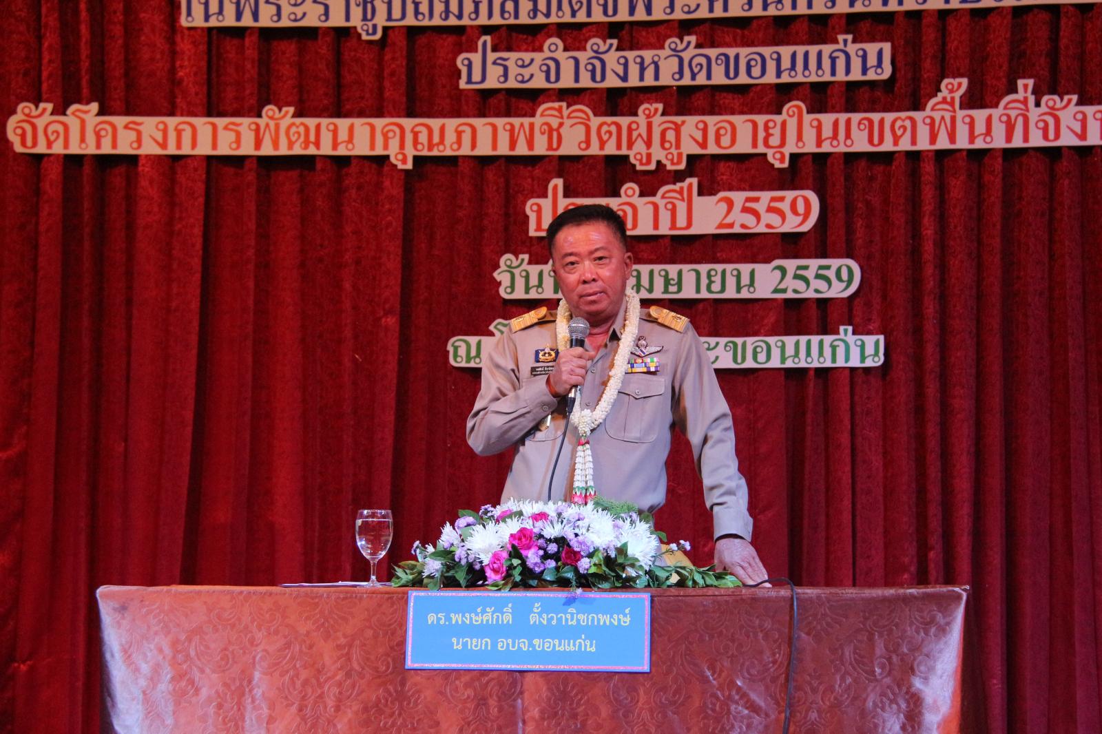 เมื่อวันที่ ๘ เมษายน ๒๕๕๙ นายก อบจ.ขอนแก่น ดร.พงษ์ศักดิ์ ตั้งวานิชกพงษ์ เป็นประธานเปิดโครงการพัฒนาคุณภาพชีวิตผู้สูงอายุในเขตพื้นที่จังหวัดขอนแก่น ประจำปี ๒๕๕๙ โดยมี ประธานชมรมผู้สูงอายุ สาขาสมาคมภาคตะวันออกเฉียงเหนือ นายสำราญ ศรีน้อยขาว เป็นผู้กล่าวรายงาน มีวัตถุประสงค์เพื่อสร้างความรักความอบอุ่นให้เกิดขึ้นกับผู้สูงอายุ เปิดโอกาสให้แสดงความคิดเห็นแลกเปลี่ยนประสบการณ์ รวมทั้งแนวทางการพัฒนาชมรมผู้สูงอายุให้เจริญก้าวหน้าต่อไป ในโอกาสนี้ มี ปลัด อบจ.ขอนแก่น นางพัฒนาวดี จันทร์นวล พร้อมด้วย รองปลัด อบจ.ขอนแก่น นางสาวนงลักษณ์ รัตนจันทร์ ,หัวหน้าสำนักปลัด อบจ. นายวรเวทย์ ดิเรกศรี ,นักพัฒนาสังคมชำนาญการ สนง.พมจ.ขอนแก่น นางภัทรานิษฐ์ วิทยตมาภรณ์ เข้าร่วมเป็นเกียรติ ณ ห้องมงกุฎเพชร โรงแรมโฆษะ อ.เมืองขอนแก่น จ.ขอนแก่น
