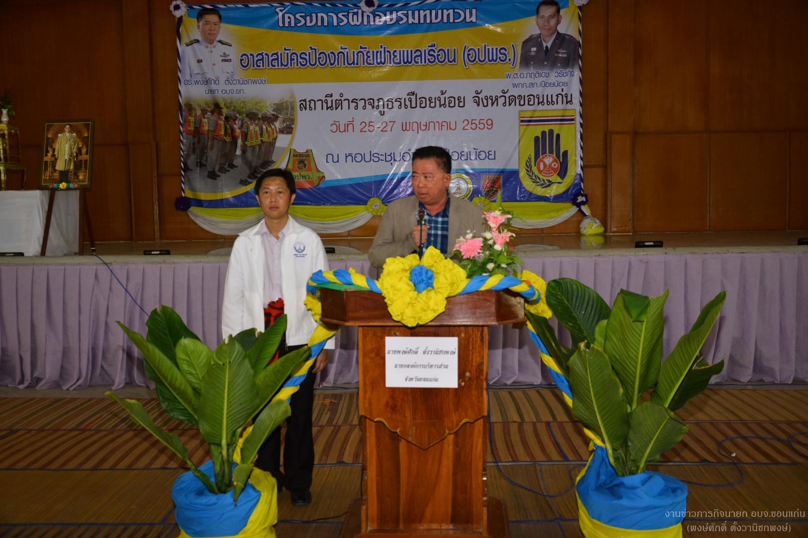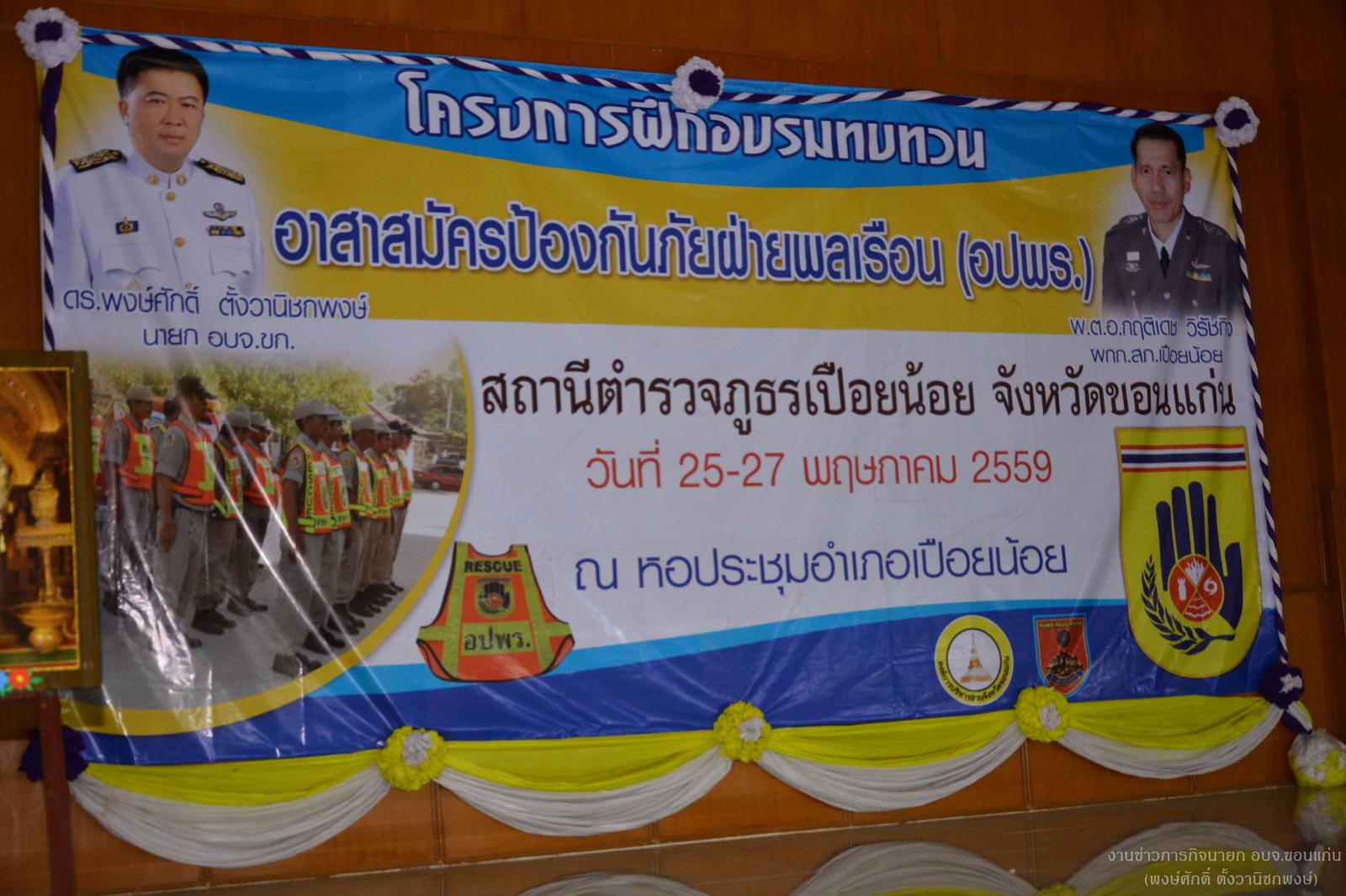 ดร.พงษ์ศักดิ์ ตั้งวานิชกพงษ์ นายกองค์การบริหารส่วนจังหวัดขอนแก่น เป็นประธานเปิดโครงการฝึกอบรมทบทวนอาสาสมัครป้องกันภัยฝ่ายพลเรือน (อปพร.) สถานีตำรวจภูธรเปือยน้อย จังหวัดขอนแก่น ณ หอประชุมอำเภอเปือยน้อย โดยมี นายจิรยุทธ โชติศิลากุล ส.อบจ.ขอนแก่น เขต อ.เปือยน้อย พ.ต.อ.กฤติเดช วิรัชกิจ ผกก.สภ.เปือยน้อย พร้อมคณะให้การต้อนรับอย่างอบอุ่น เมื่อ 25 พฤษภาคม 2559