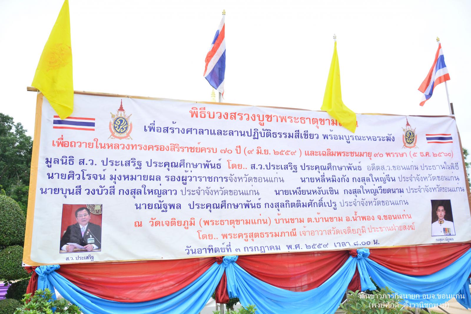 ดร.พงษ์ศักดิ์ ตั้งวานิชกพงษ์ นายกองค์การบริหารส่วนจังหวัดขอนแก่น พร้อมด้วย นายนพพร ปิติสุวรรณรัตน์ ส.อบจ.ขอนแก่น เขต อ.น้ำพอง ร่วมในพิธีบวงสรวงพระบรมธาตุขามแก่น เพื่อสร้างศาลาและลานปฏิบัติธรรมภายในบริเวณวัดพระธาตุขามแก่น ณ วัดพระธาตุขามแก่น บ้านขาม ตำบลบ้านขาม อำเภอน้ำพอง จังหวัดขอนแก่น นำโดยนายประเสริฐ ประคุณศึกษาพันธ์ อดีต สว.ขอนแก่น , ฯพณฯ กงสุลใหญ่สาธารณรัฐประชาชนจีน จังหวัดขอนแก่น, ฯพณฯ กงสุลใหญ่สาธารณรัฐสังคมนิยมเวียดนาม ประจำจังหวัดขอนแก่น, ฯพณฯ กงสุลใหญ่สาธารณรัฐประชาธิปไตยประชาชนลาว ประจำจังหวัดขอนแก่น, ฯพณฯ กงสุลกิตติมศักดิ์ สาธารณรัฐเปรู จังหวัดขอนแก่น เมื่อวันที่ 3 กรกฎาคม 2559