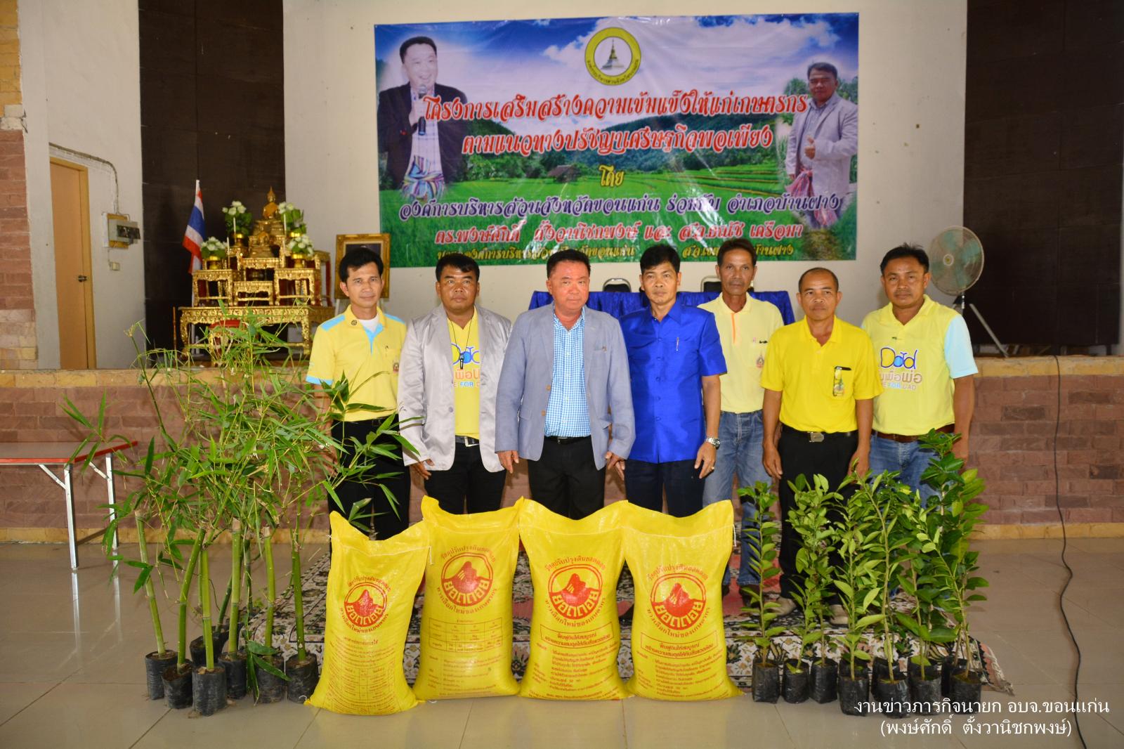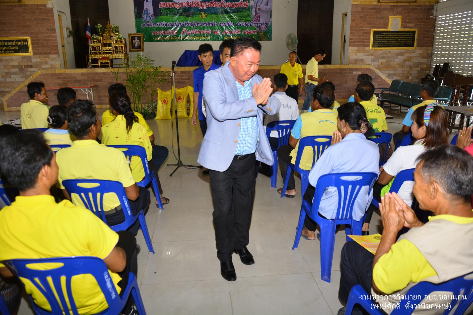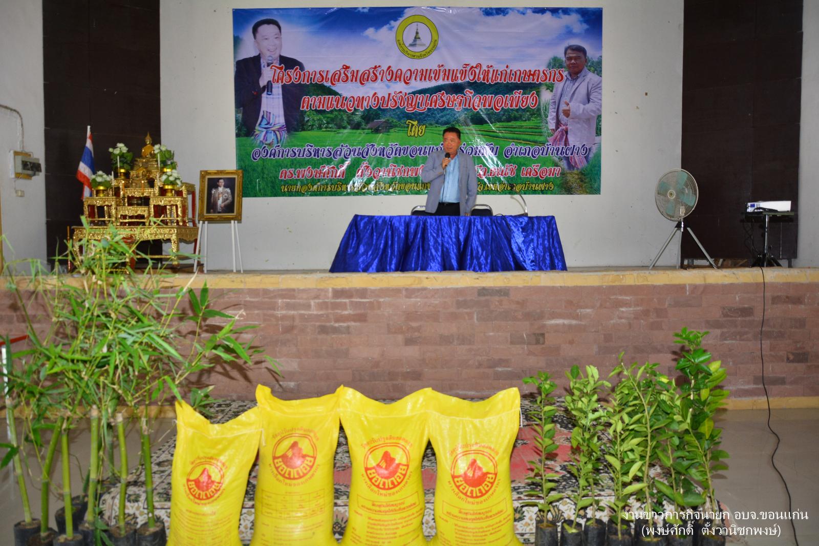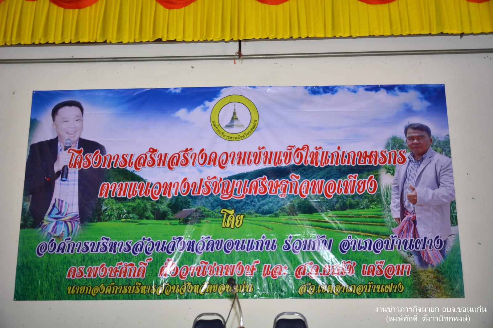ดร.พงษ์ศักดิ์ ตั้งวานิชกพงษ์ นายกองค์การบริหารส่วนจังหวัดขอนแก่น เป็นประธานพิธีเปิดโครงการเสริมสร้างความเข้มแข็งให้แก่เกษตรตามแนวทางปรัชญาเศรษฐกิจพอเพียง โดยมี นายธณัช เครือมา ส.อบจ.ขอนแก่น อ.บ้านฝาง ให้การต้อนรับ นายณัฐวุฒิ ถุนนอก นายอำเภอบ้านฝาง เป็นผู้กล่าวรายงาน ณ หอประชุมอำเภอบ้านฝาง จังหวัดขอนแก่น เมื่อ 12 กรกฎาคม 2559