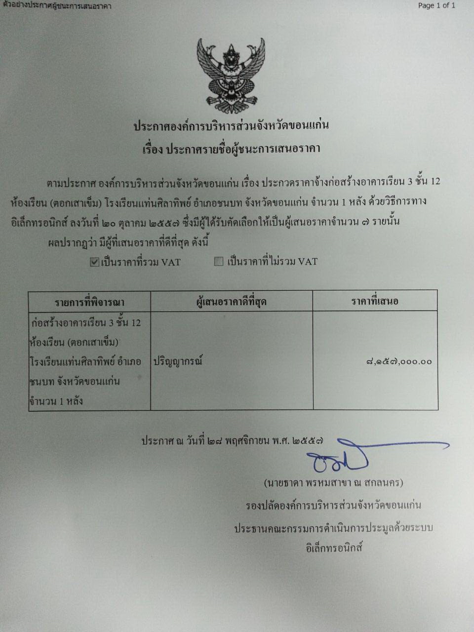 ประกาศรายชื่อผู้ชนะการประมูลจ้างก่อสร้างอาคารเรียน 3 ชั้น 12 ห้องเรียน (ตอกเสาเข็ม) โรงเรียนแท่นศิลาทิพย์ศึกษา อำเภอชนบท จังหวัดขอนแก่น จำนวน 1 หลัง