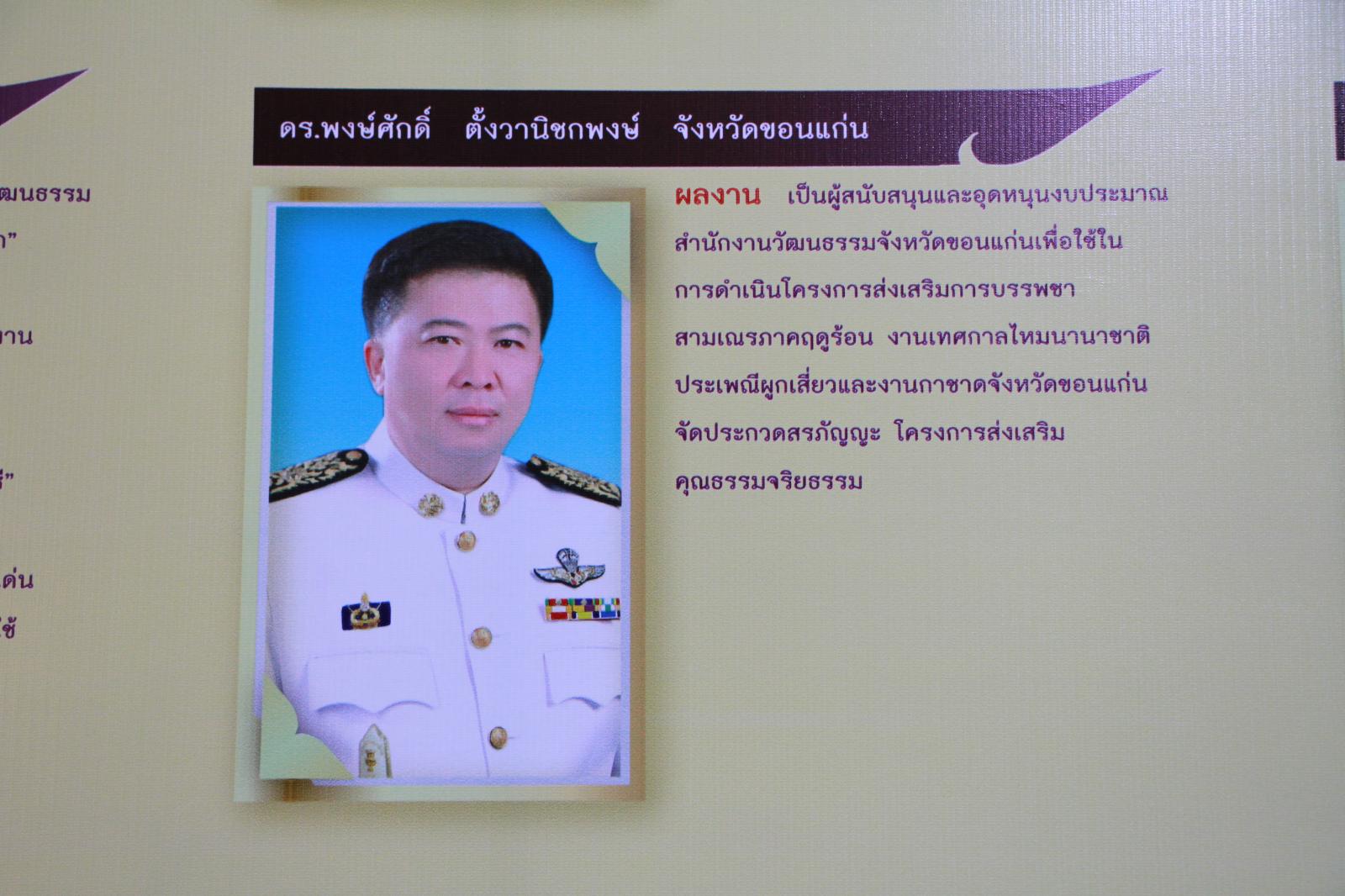 เมื่อวันที่ 3 ตุลาคม 2559 นายก อบจ.ขอนแก่น ดร.พงษ์ศักดิ์ ตั้งวานิชกพงษ์ เข้ารับมอบโล่ เชิดชูเกียรติผู้ทำคุณประโยชน์ต่อกระทรวงวัฒนธรรม “วัฒนคุณาธร” ประจำปีงบประมาณ พ.ศ.2559 ประเภทบุคคล โดยมี รัฐมนตรีว่าการกระทรวงวัฒนธรรม นายวีระ โรจน์พจนรัตน์ เป็นประธานมอบ เพื่อเป็นการยกย่องว่าเป็นผู้ที่ส่งเสริมสนับสนุนกระทรวงวัฒนธรรมในการดำเนินงานศาสนา ศิลปะ และวัฒนธรรม จนประสบผลสำเร็จตามภารกิจของกระทรวงวัฒนธรรม ประจำปีงบประมาณ พ.ศ.2559 ณ หอประชุมใหญ่ ศูนย์วัฒนธรรมแห่งประเทศไทย กรุงเทพมหานคร