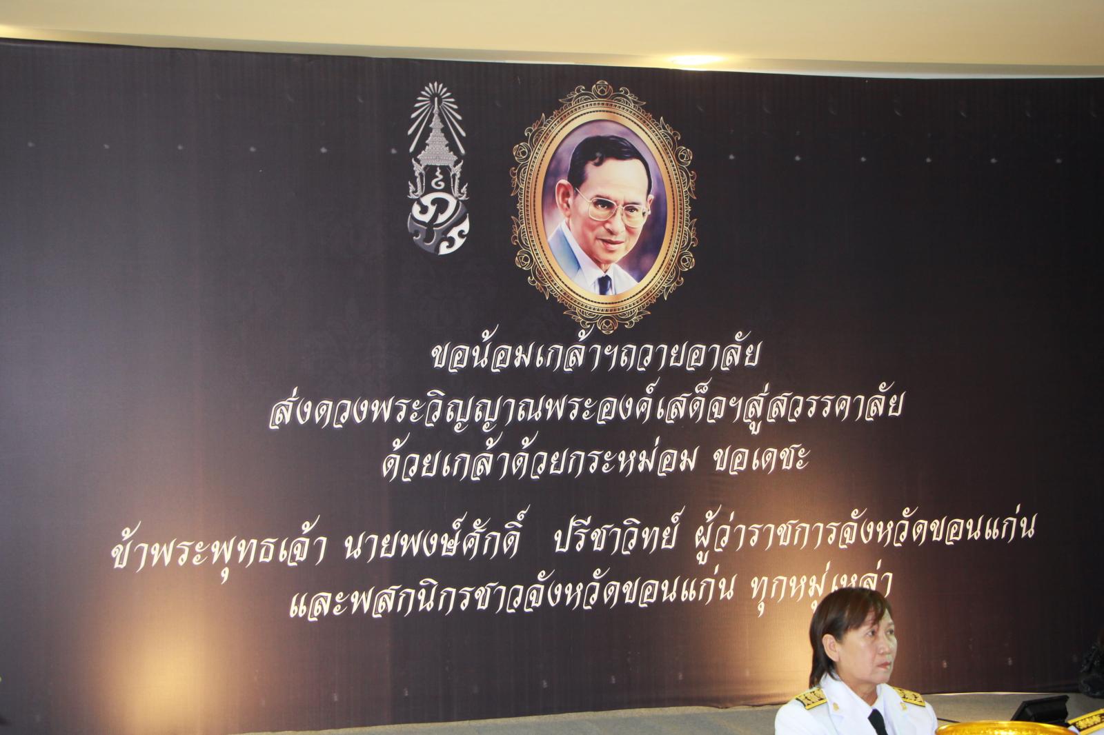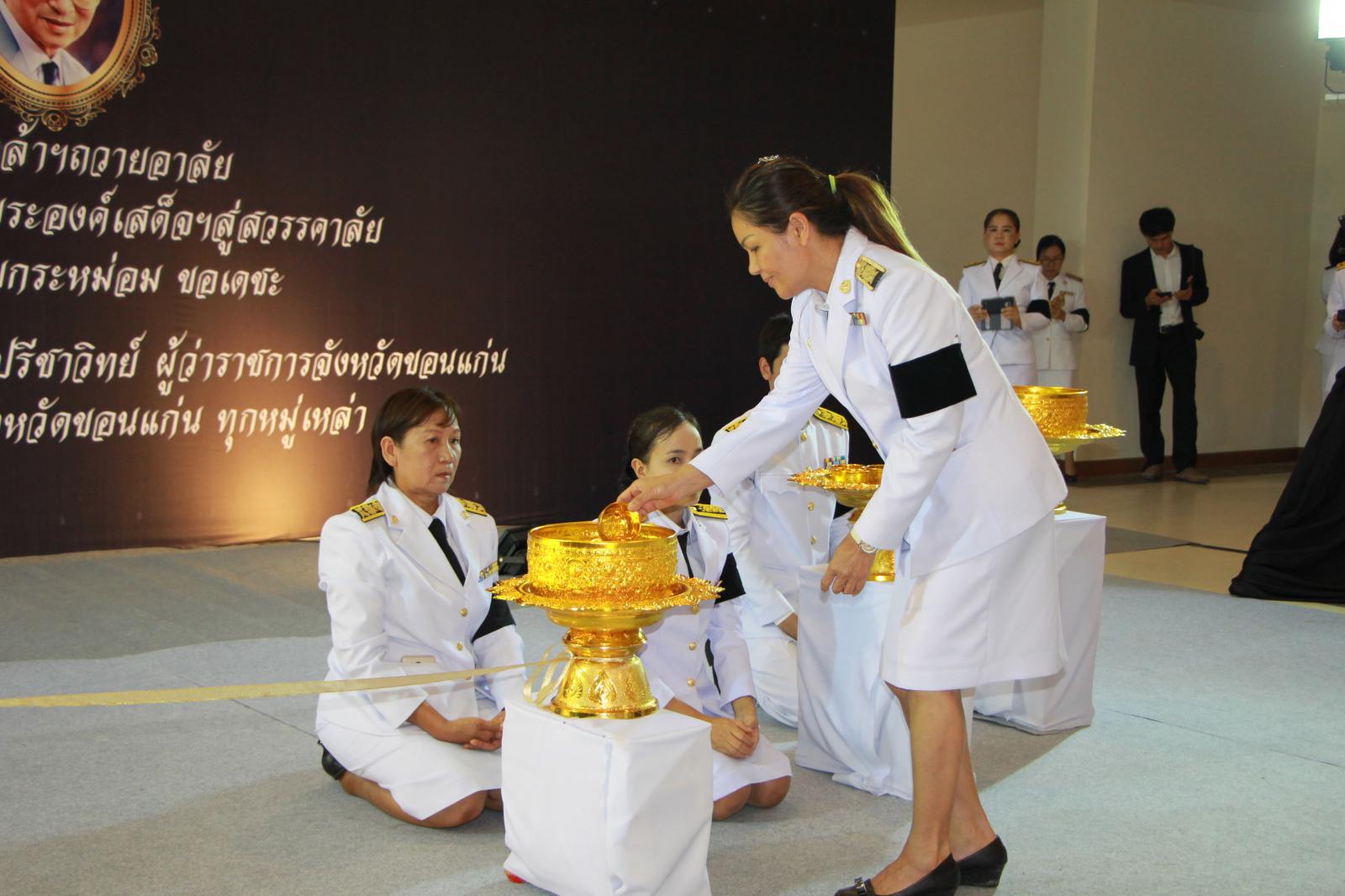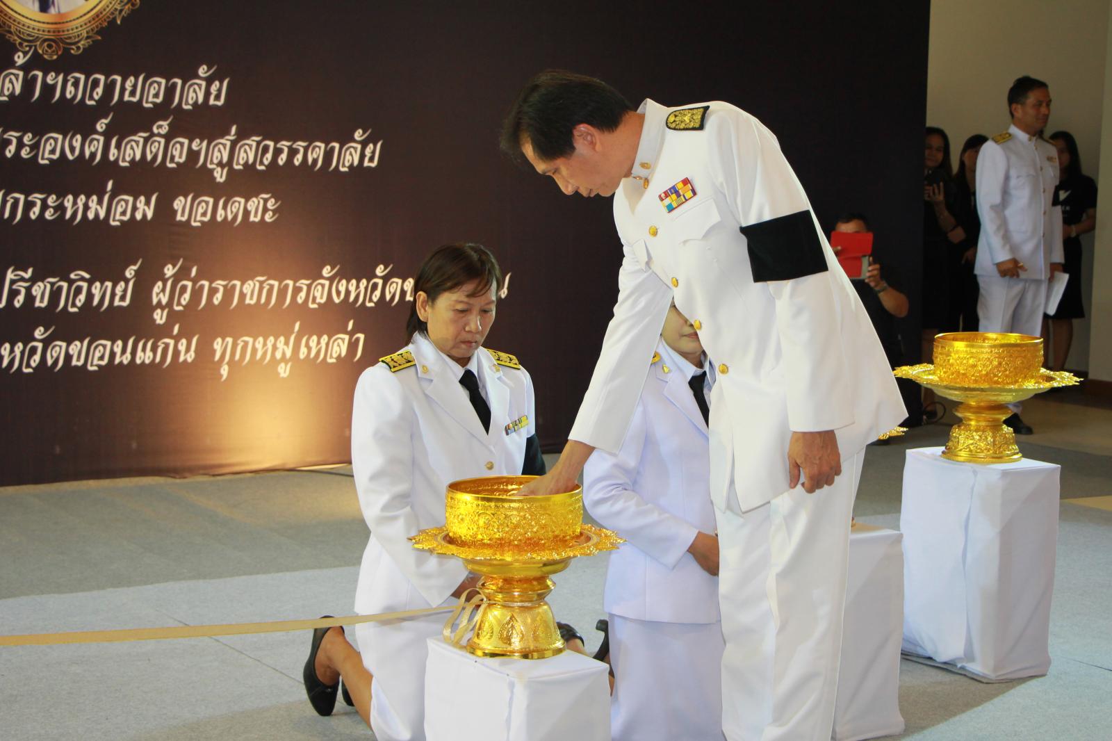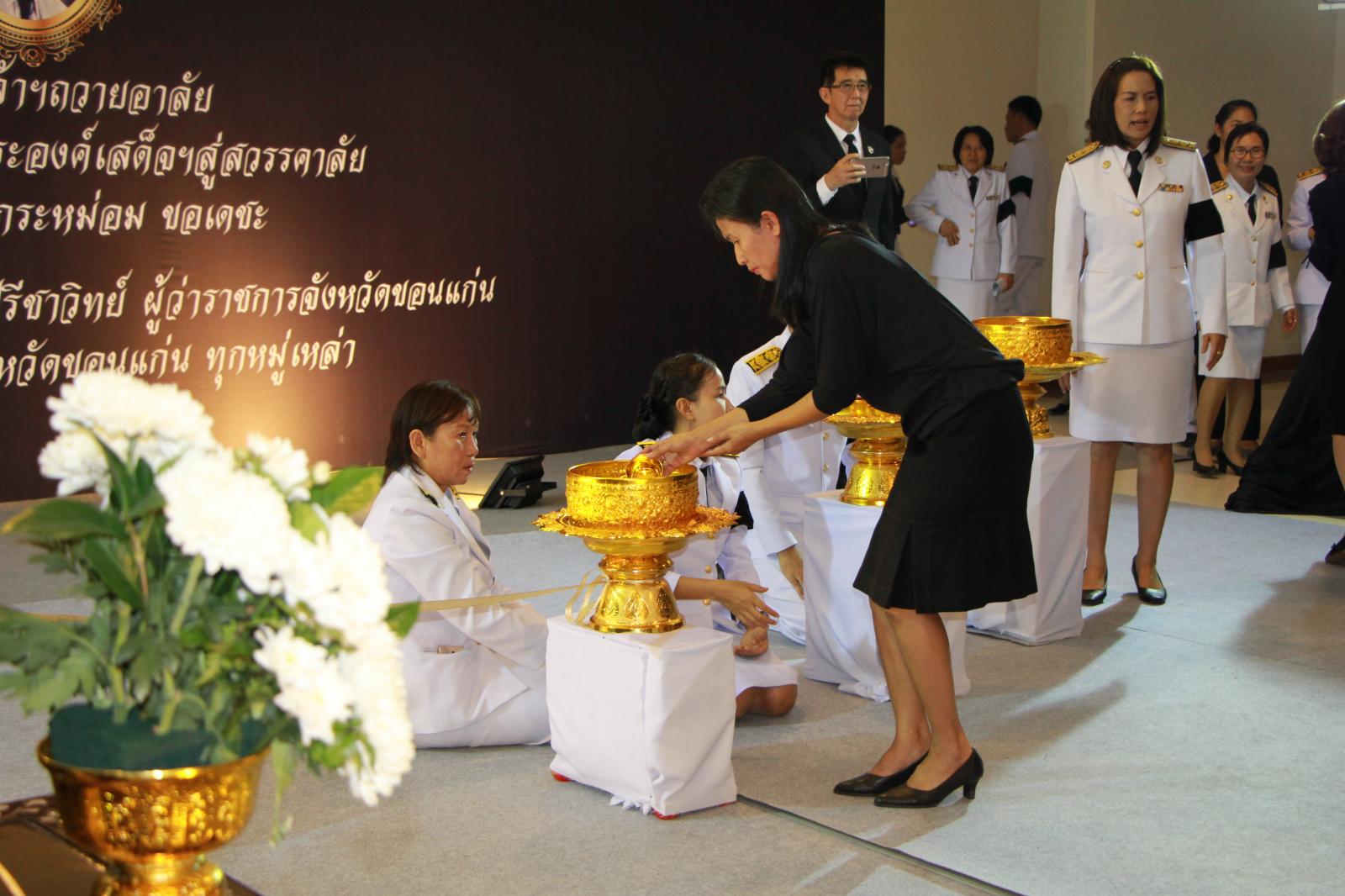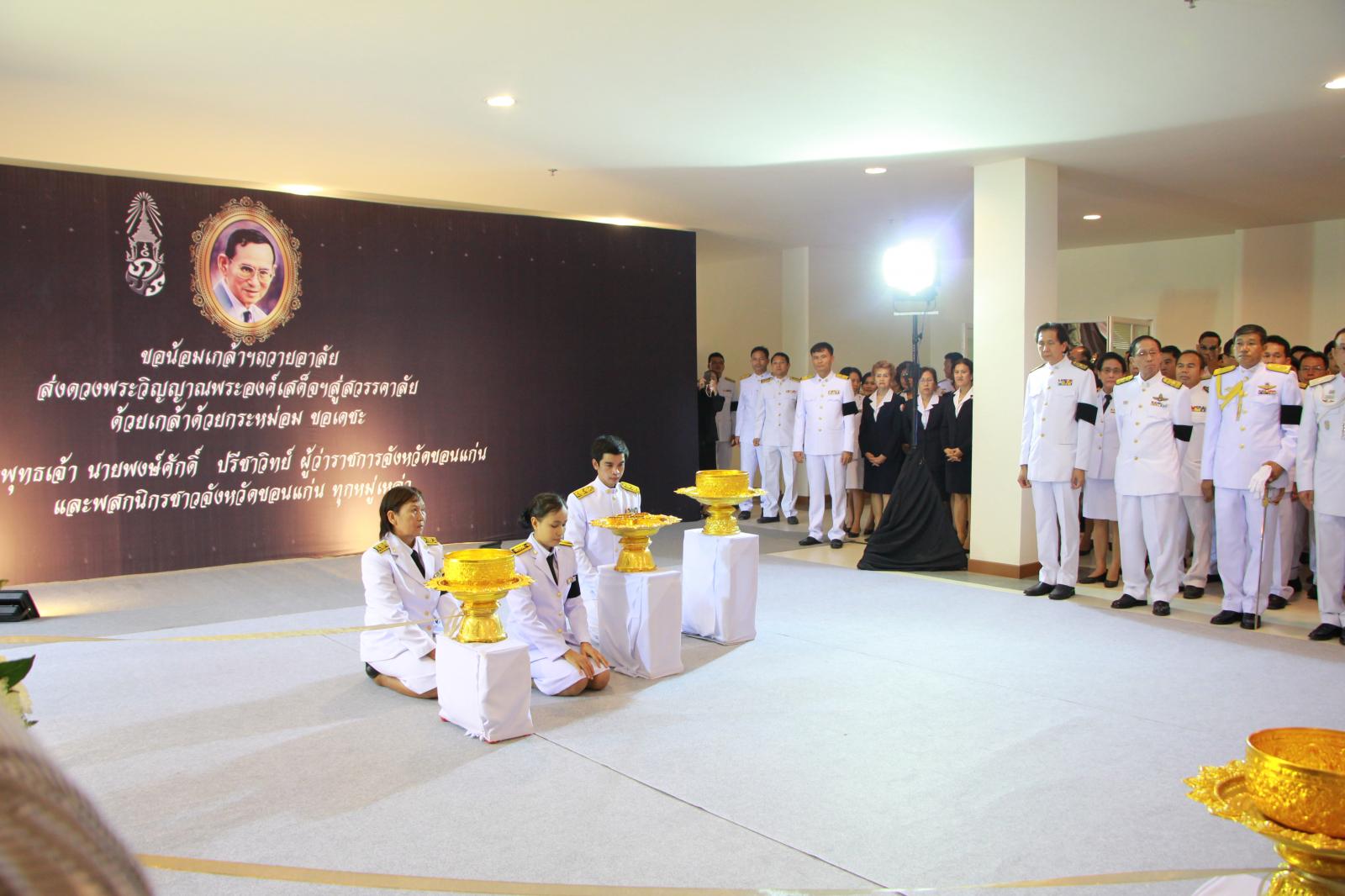 ในวันที่ 14 ตุลาคม 2559 นายก อบจ.ขอนแก่น ดร.พงษ์ศักดิ์ ตั้งวานิชกพงษ์ พร้อมด้วยรองนายก อบจ.ขอนแก่น นายสิทธิกุล ภูคำวงศ์ ,ปลัด อบจ.ขอนแก่น นางพัฒนาวดี จันทร์นวล หัวหน้าส่วนราชการ ข้าราชการ อบจ.ขอนแก่น ร่วมพิธีถวายน้ำสรงพระบรมศพ และพิธีบำเพ็ญกุศลเพื่อถวายเป็นพระราชกุศล แด่พระบาทสมเด็จพระปรมินทรมหาภูมิพลอดุลยเดช มหิตลาธิเบศรรามาธิบดี จักรีนฤบดินทร สยามินทราธิราช บรมนาถบพิตร โดยมี ผู้ว่าราชการจังหวัดขอนแก่น นายพงษ์ศักดิ์ ปรีชาวิทย์ เป็นประธาน ทั้งนี้มีผู้แทนจากหน่วยงานภาครัฐ และเอกชน ตลอดจนประชาชนในจังหวัดขอนแก่น เข้าร่วมพิธี ณ ห้องประชุมแก่นเมืองศาลากลางจังหวัดขอนแก่น (หลังใหม่) ชั้น 1 อ.เมืองขอนแก่น จ.ขอนแก่น