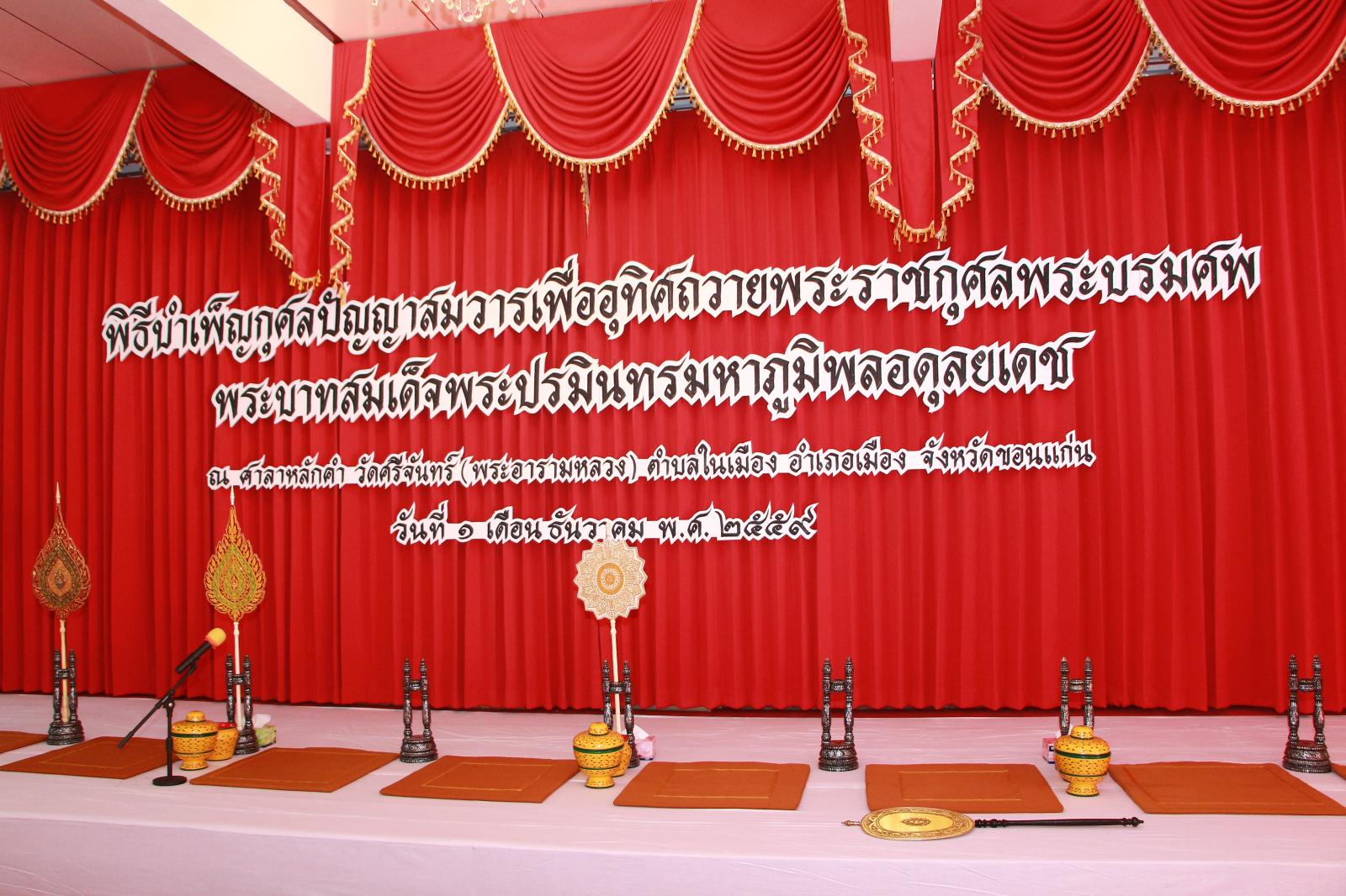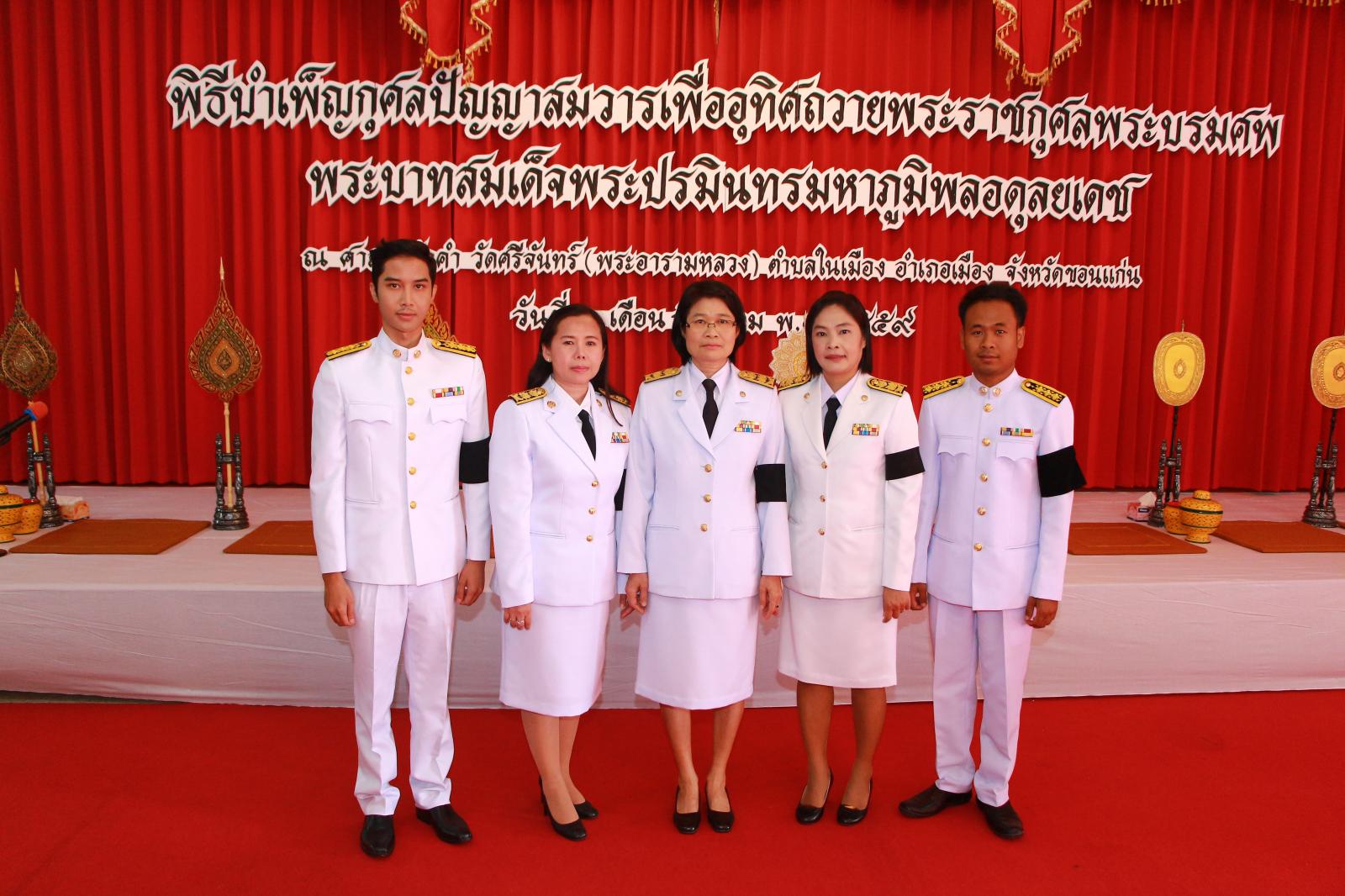 เมื่อวันที่ 1 ธันวาคม 2559 นายก อบจ.ขอนแก่น ดร.พงษ์ศักดิ์ ตั้งวานิชกพงษ์ มอบหมายให้ ปลัด อบจ.ขอนแก่น นางพัฒนาวดี จันทร์นวล ,รองปลัด อบจ.ขอนแก่น นายธาดา พรหมสาขา ณ สกลนคร ,น.ส.นงลักษณ์ รัตนจันทร์ หัวหน้าส่วนราชการ ข้าราชการ อบจ.ขอนแก่น ร่วมพิธีบำเพ็ญกุศลปัญญาสมวาร (50 วัน) เพื่อถวายเป็นพระราชกุศล แด่พระบาทสมเด็จพระปรมินทรมหาภูมิพลอดุลยเดช โดยมี ผู้ว่าราชการจังหวัดขอนแก่น นายพงษ์ศักดิ์ ปรีชาวิทย์ เป็นประธาน ณ วัดศรีจันทร์พระอารามหลวง อ.เมืองขอนแก่น จ.ขอนแก่น