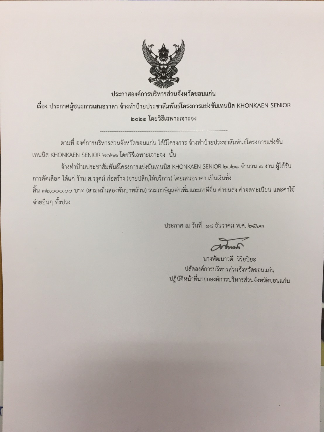 ประกาศผู้ชนะการเสนอราคาจ้างทำป้ายประชาสัมพันธ์โครงการแข่งขันเทนนิส KHON KAEN SENIOR 2021 (สำนักปลัดฯ 32,000.-)