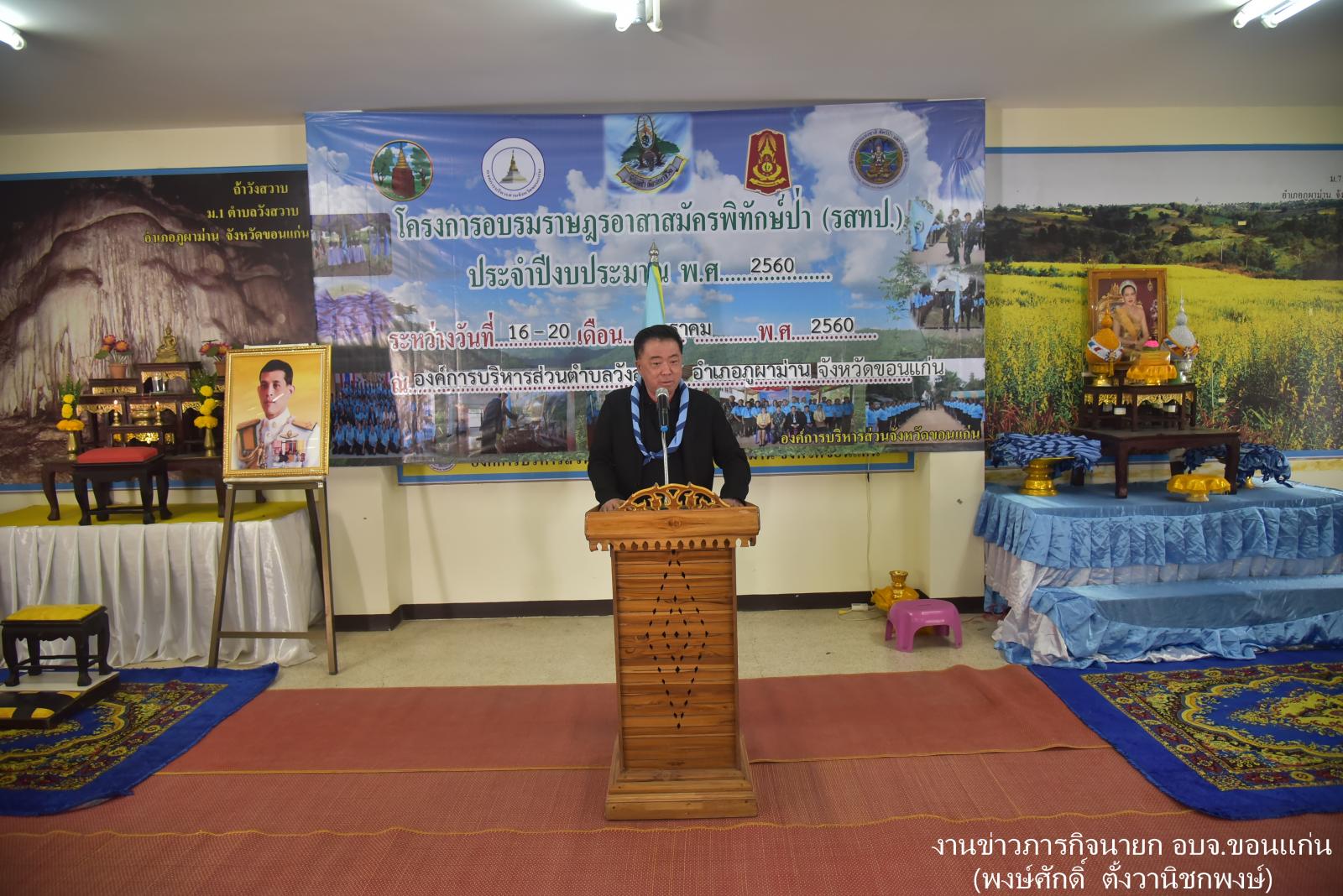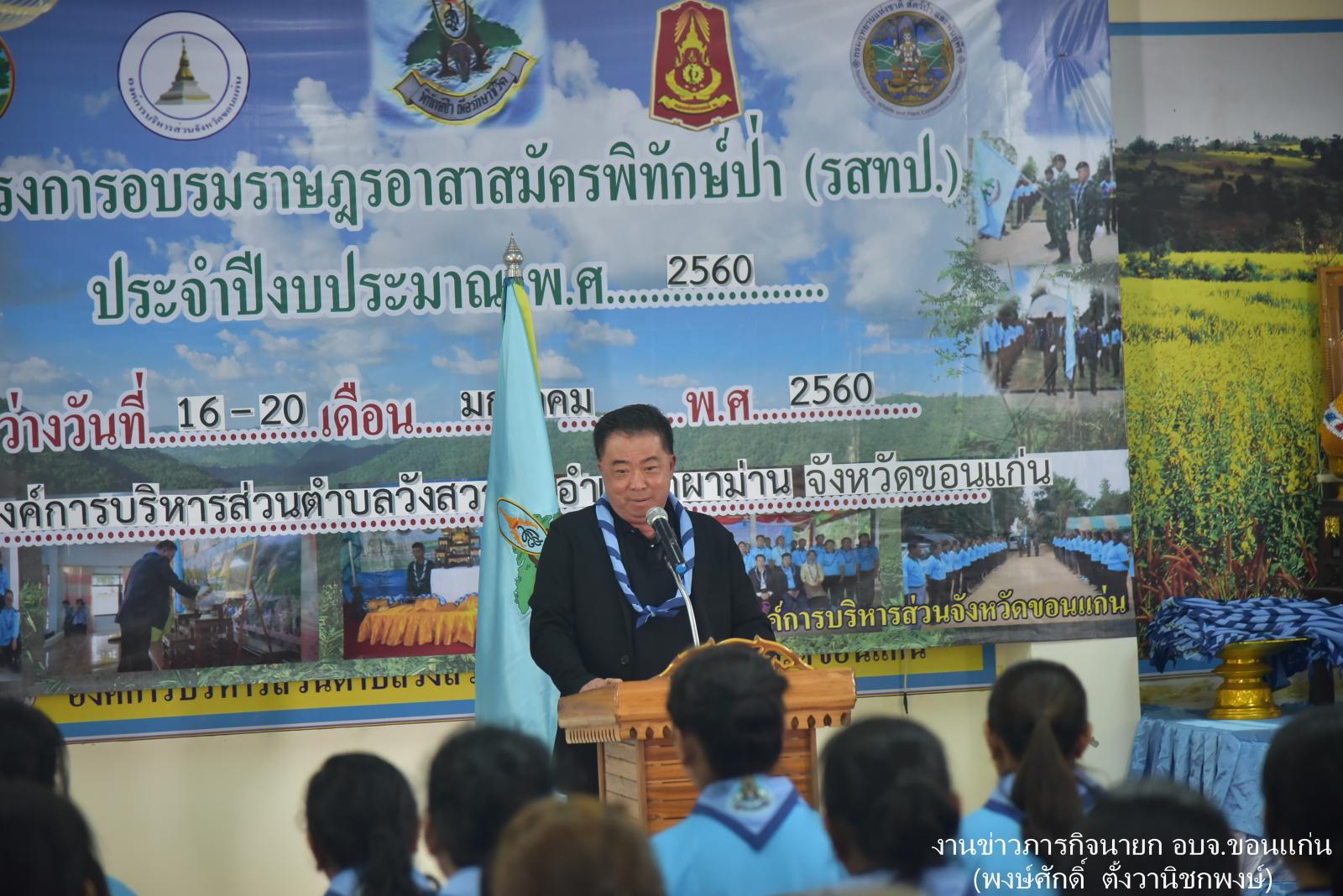 ดร.พงษ์ศักดิ์ ตั้งวานิชกพงษ์ นายกองค์การบริหารส่วนจังหวัดขอนแก่น เป็นประธานในพิธีรับผ้าผูกคอพระราชทาน พิธีปิด โครงการฝึกอบรมราษฎรอาสาสมัครพิทักษ์ป่า (รสทป.) ประจำปีงบประมาณ พ.ศ.2560 พร้อมมอบวุฒิบัตรให้แก่ผู้เข้ารับการฝึกอบรม ณ องค์การบริหารส่วนตำบลวังสวาบ อำเภอภูผาม่าน จังหวัดขอนแก่น โดยมี นายประสิทธิ์ ทองแท่งไทย ส.อบจ.ขอนแก่น เขต อ.ภูผาม่าน ร่วมในพิธี เมื่อ 19 มกราคม 2560