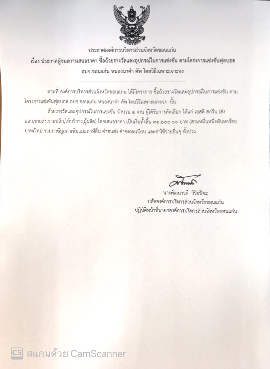 ประกาศผู้ชนะการเสนอราคาซื้อถ้วยรางวัลและอุปกรณ์ในการแข่งขัน ตามโครงการแข่งขันฟุตบอล อบจ.ขอนแก่น หนองนาคำ คัพ (สำนักปลัดฯ 31,600.-)