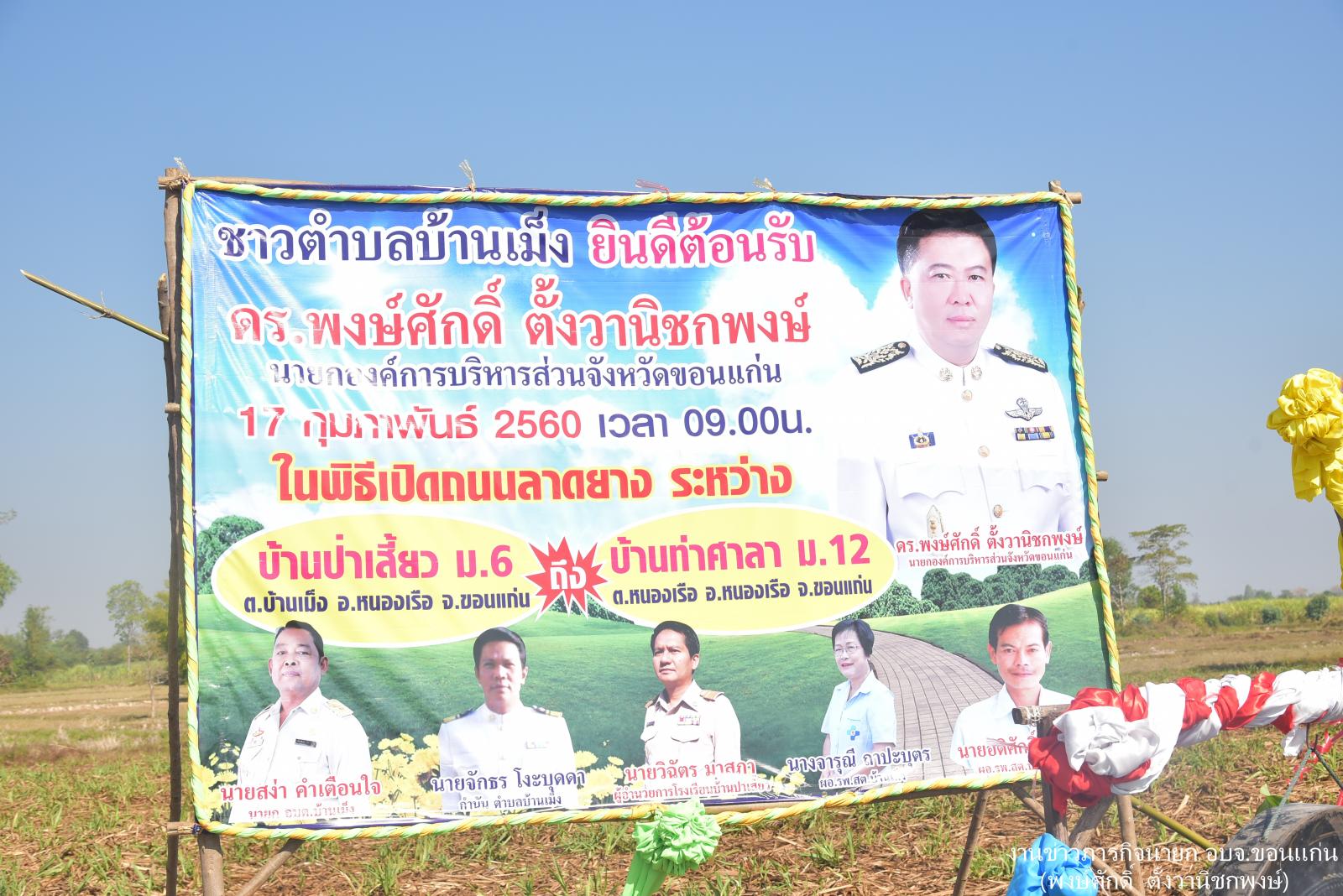 เมื่อวันที่ 17 กุมภาพันธ์ 2560 ดร.พงษ์ศักดิ์ ตั้งวานิชกพงษ์ นายกองค์การบริหารส่วนจังหวัดขอนแก่น เป็นประธานในพิธีเปิดถนนลาดยางสายบ้านป่าเสี้ยว หมู่ 6 ตำบลบ้านเม็ง – บ้านท่าศาลา หมู่ 12 ตำบลหนองเรือ อำเภอหนองเรือ จังหวัดขอนแก่น โดยมี นายสง่า คำเตือนใจ นายก อบต.บ้านเม็ง นายจักธร โงะบุดดา กำนันตำบลบ้านเม็ง ผู้นำท้องถิ่น และประชาชนในพื้นที่ร่วมให้การต้อนรับ