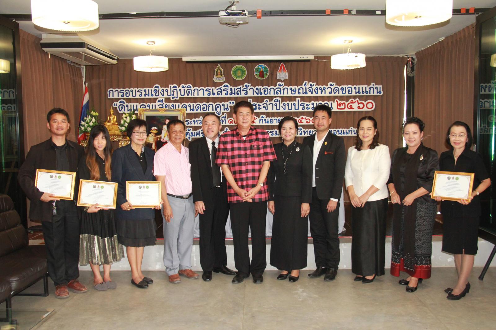 วันที่ 14 กันยายน 2560 เวลา 13.00 น. นายก อบจ.ขอนแก่น ดร.พงษ์ศักดิ์ ตั้งวานิชกพงษ์ มอบหมายให้ รองปลัด อบจ.ขอนแก่น นางสาวนงลักษณ์ รัตนจันทร์ ร่วมพิธีเปิดโครงการอบรมเชิงปฏิบัติการเสริมสร้างเอกลักษณ์จังหวัดขอนแก่น “ดินแดนเสียงแคนดอกคูน” ประจำปีงบประมาณ 2560 และรับมอบเกียรติบัตรหน่วยงานที่สนับสนุนกิจกรรมฯ ณ ห้องประชุมคุ้มศรีฐาน สำนักวัฒนธรรม มหาวิทยาลัยขอนแก่น