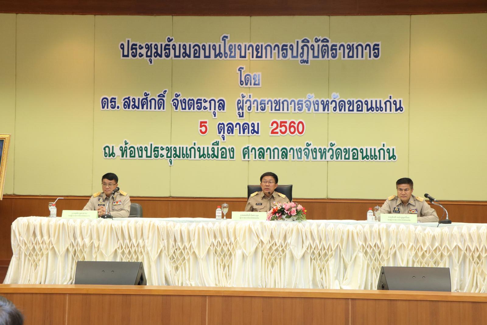 เมื่อวันที่ 5 ตุลาคม 2560 นายก อบจ.ขอนแก่น ดร.พงษ์ศักดิ์ ตั้งวานิชกพงษ์ มอบหมายให้ ปลัด อบจ.ขอนแก่น นางพัฒนาวดี วิริยปิยะ เข้าร่วมประชุมรับมอบนโยบายการปฏิบัติราชการ โดยมี ผู้ว่าราชการจังหวัดขอนแก่น ดร.สมศักดิ์ จังตระกุล เป็นประธาน ณ ห้องประชุมแก่นเมือง ศาลากลางจังหวัดขอนแก่น (หลังใหม่) อ.เมืองขอนแก่น จ.ขอนแก่น