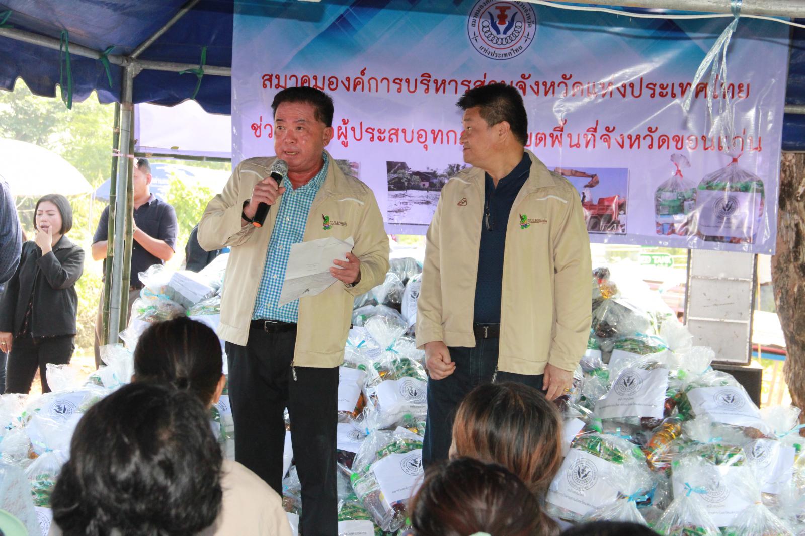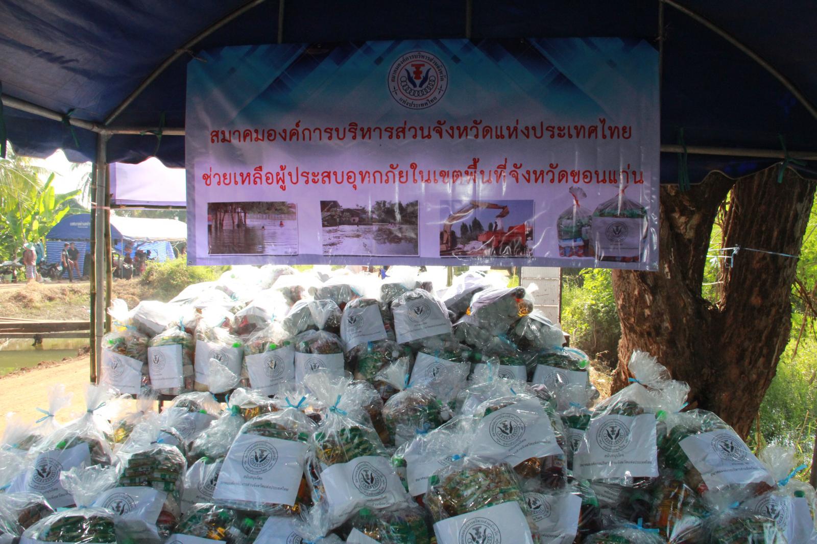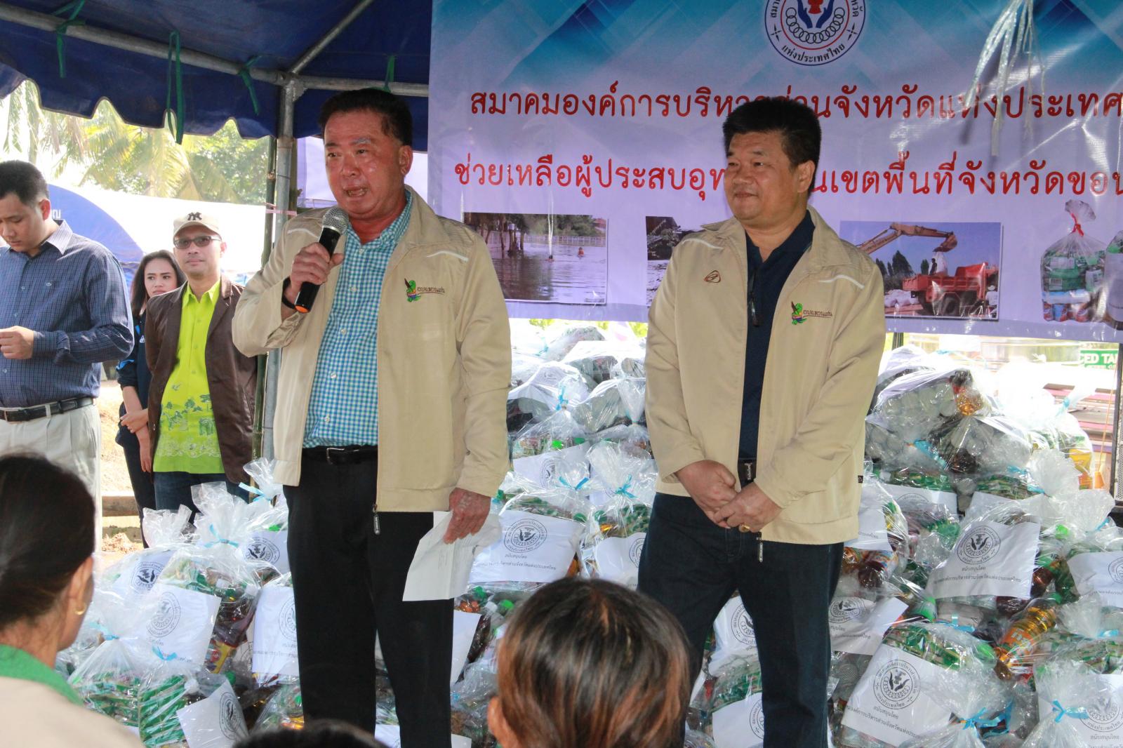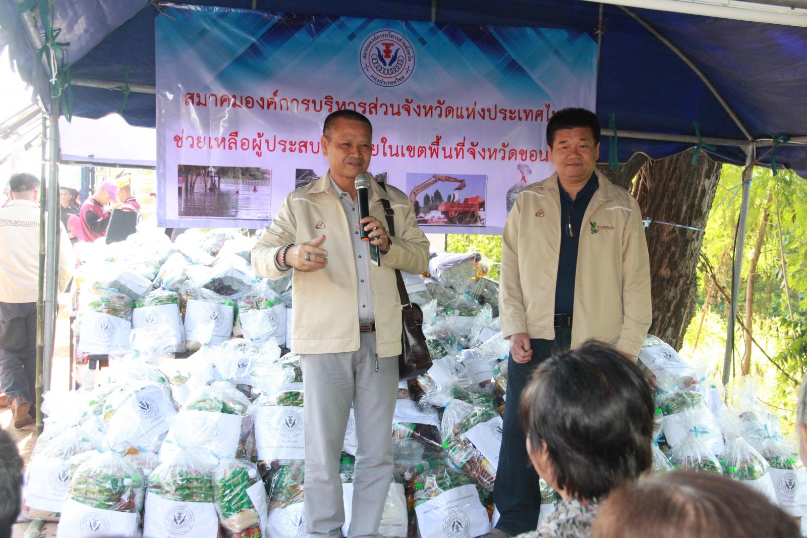 และนาย วัฒนา ช่างเหล่า รองนายกองค์การบริหารส่วนจังหวัดขอนแก่น นางพัฒนาวดี วิริยปิยะ ปลัดองค์การบริหารส่วนจังหวัดขอนแก่น นาย ธาดา พรหมสาขา ณ สกลนคร รองปลัดองค์การบริหารส่วนจังหวัดขอนแก่น หัวหน้าส่วนราชการ ข้าราชพนักงานองค์การบริหารส่วนจังหวัดขอนแก่น ร่วมกับ สมาคมองค์การบริหารส่วนจังหวัดแห่งประเทศไทย มอบถุงยังชีพช่วยเหลือผู้ประสบอุทกภัย ณ ศูนย์กองอำนวยการช่วยเหลือประชาชน ม.๔ บ้านนาพียง และม.๘ บ้านอัมพวัน ตำบลสำราญ อำเภอเมือง จังหวัดขอนแก่น จำนวน 328 ชุด