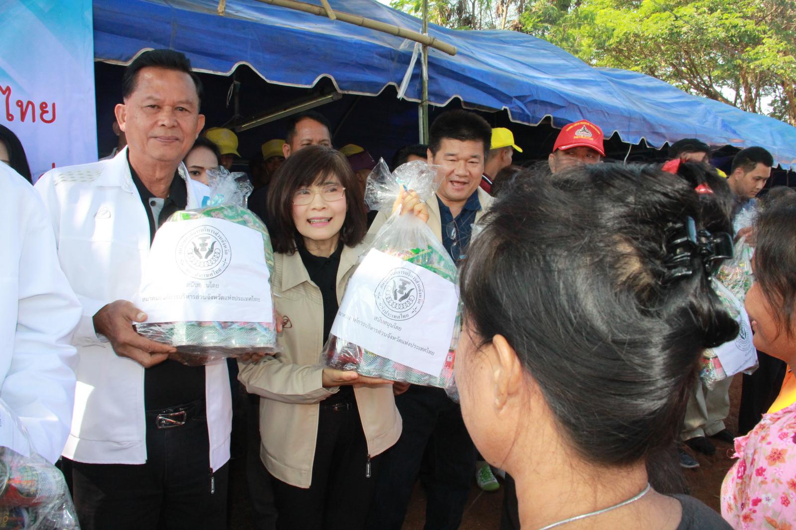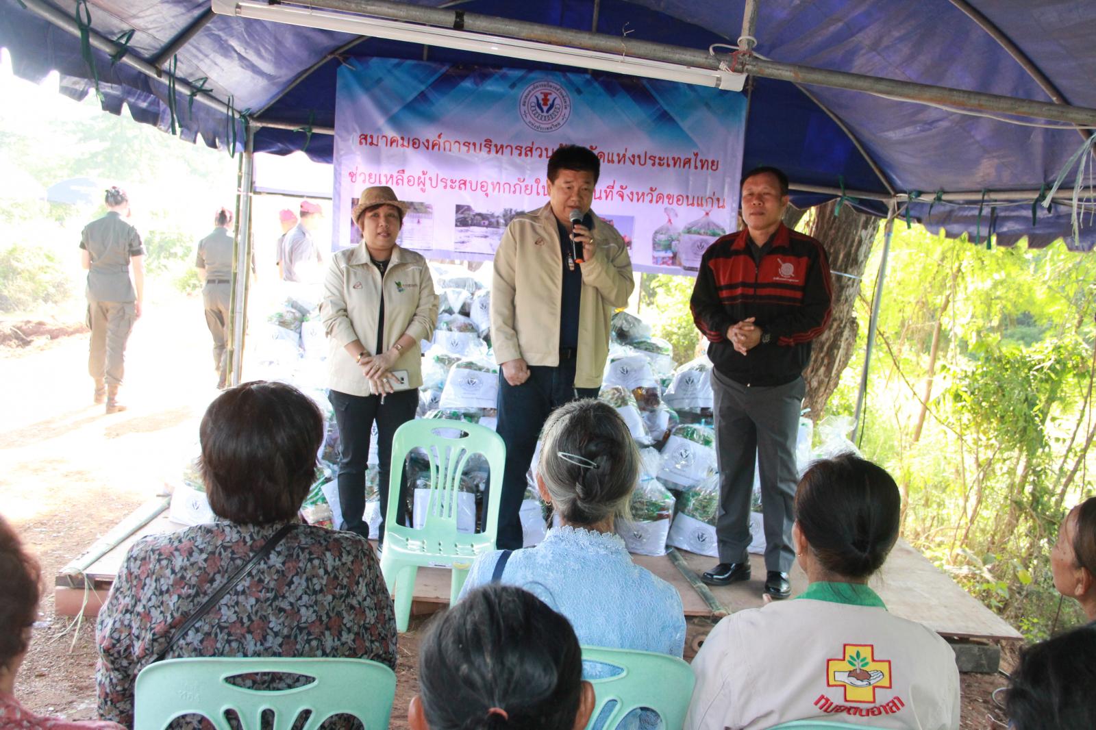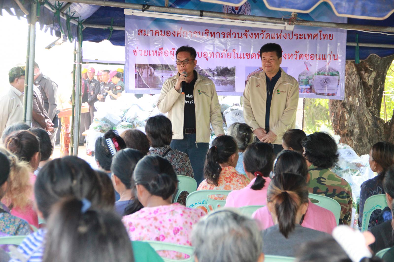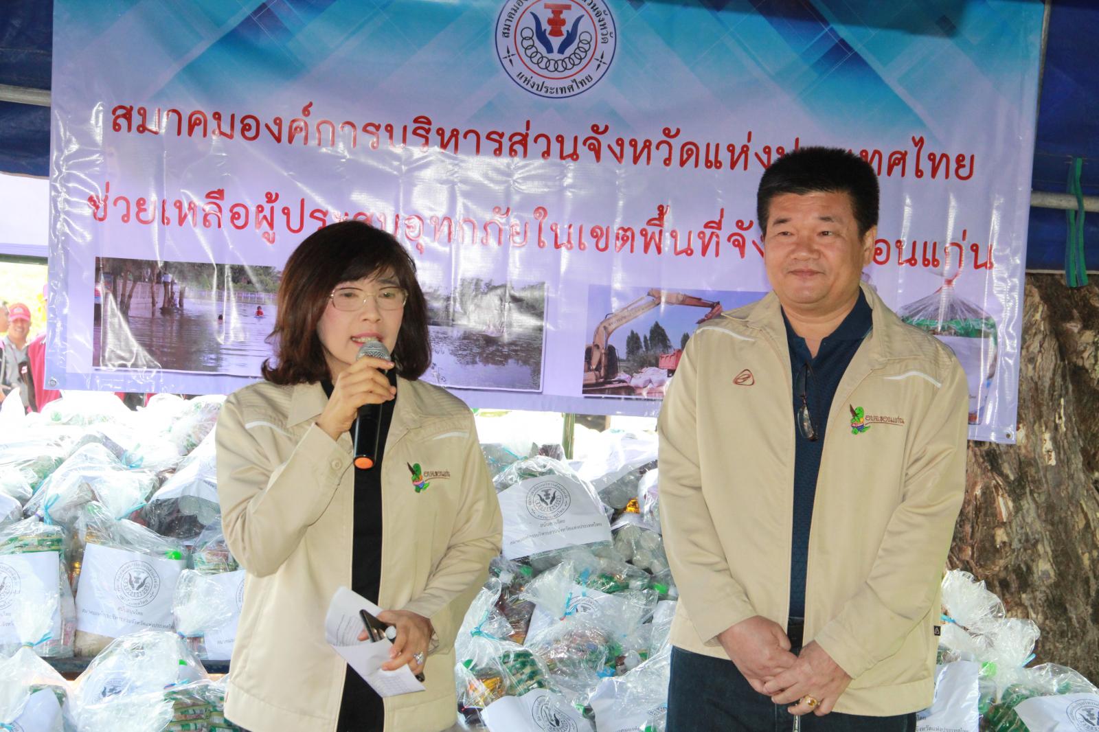 และนาย วัฒนา ช่างเหล่า รองนายกองค์การบริหารส่วนจังหวัดขอนแก่น นางพัฒนาวดี วิริยปิยะ ปลัดองค์การบริหารส่วนจังหวัดขอนแก่น นาย ธาดา พรหมสาขา ณ สกลนคร รองปลัดองค์การบริหารส่วนจังหวัดขอนแก่น หัวหน้าส่วนราชการ ข้าราชพนักงานองค์การบริหารส่วนจังหวัดขอนแก่น ร่วมกับ สมาคมองค์การบริหารส่วนจังหวัดแห่งประเทศไทย มอบถุงยังชีพช่วยเหลือผู้ประสบอุทกภัย ณ ศูนย์กองอำนวยการช่วยเหลือประชาชน ม.๔ บ้านนาพียง และม.๘ บ้านอัมพวัน ตำบลสำราญ อำเภอเมือง จังหวัดขอนแก่น จำนวน 328 ชุด