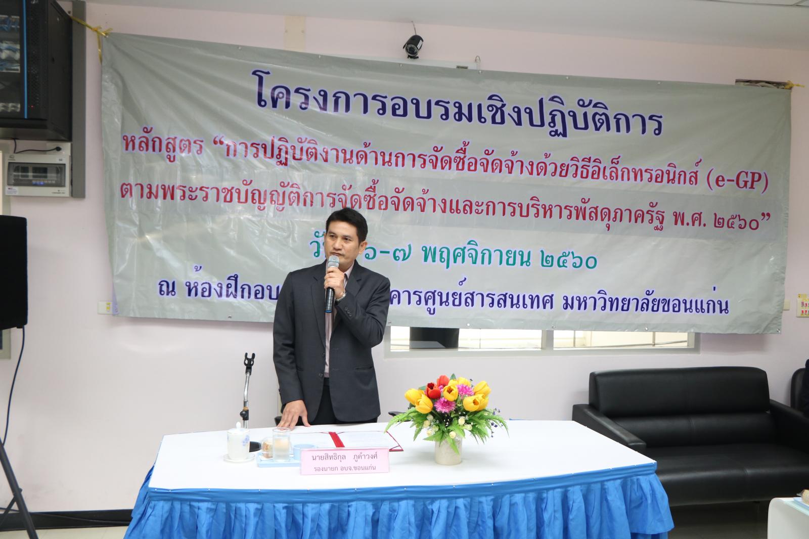 ในวันที่ 6 พฤศจิกายน 2560 นายก อบจ.ขอนแก่น ดร.พงษ์ศักดิ์ ตั้งวานิชกพงษ์ มอบหมายให้ รองนายก อบจ.ขอนแก่น นายสิทธิกุล ภูคำวงศ์ เป็นประธานในพิธีเปิดโครงการอบรมเชิงปฏิบัติการ หลักสูตร “การปฏิบัติงานด้านการจัดซื้อจัดจ้างด้วยวิธิเล็กทรอนิกส์ (e - GP) ตามพระราชบัญญัติการจัดซื้อจัดจ้าง และการบริหารพัสดุภาครัฐ พ.ศ.2560” โดยมี ผอ.กองการเจ้าหน้าที่ นายสุวนัย ภูมาศ เป็นผู้กล่าวรายงาน ในโอกาสนี้มี รองปลัด อบจ.ขอนแก่น นายธาดา พรหมสาขา ณ สกลนคร หัวหน้าส่วนราชการ ข้าราชการ อบจ.ขอนแก่น ร่วมเป็นเกียรติ ณ ห้องฝึกอบรม ชั้น 4 ศูนย์สารสนเทศ มหาวิทยาลัยขอนแก่น อ.เมืองขอนแก่น จ.ขอนแก่น