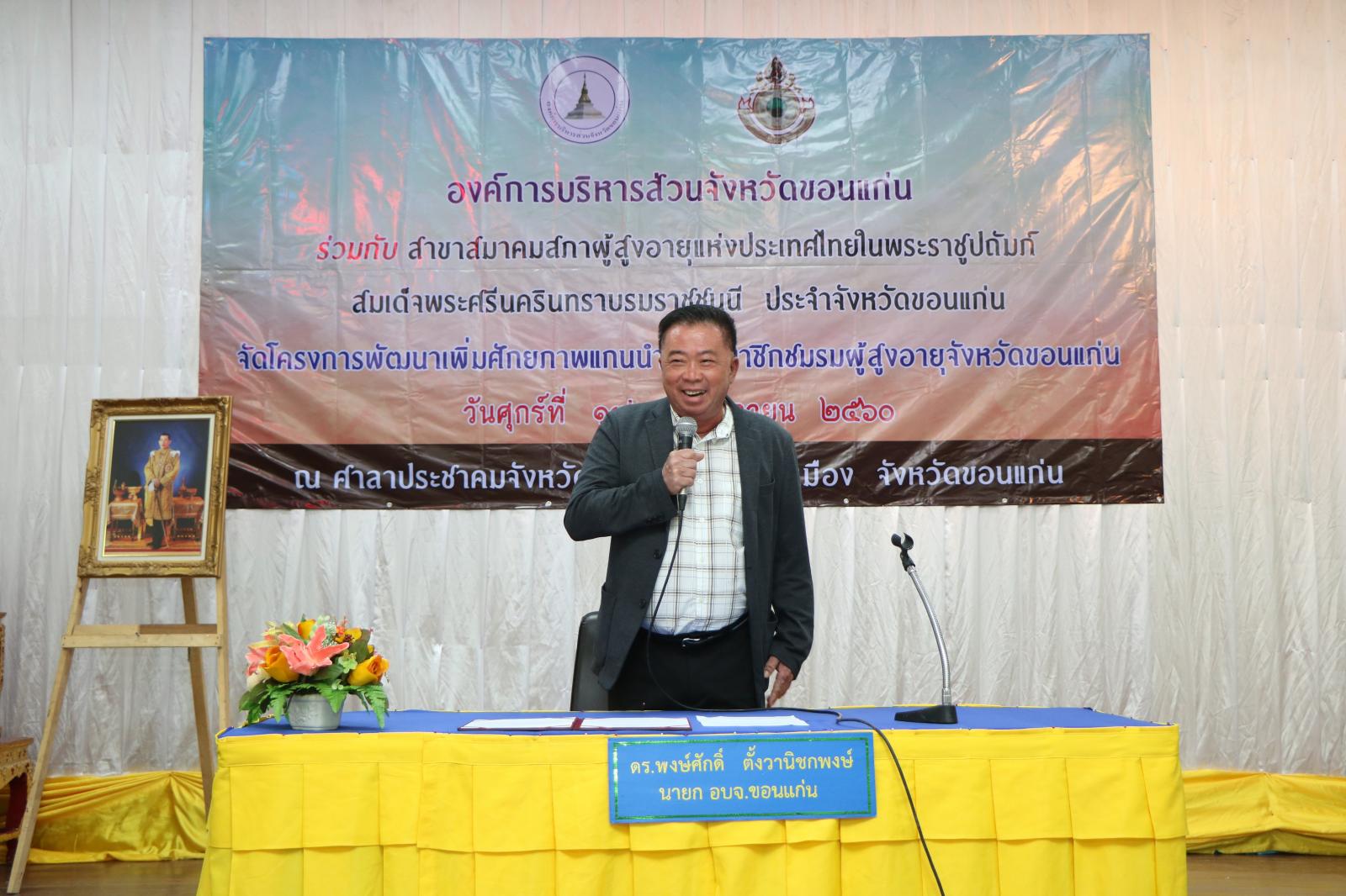 วันที่ 17 พฤศจิกายน 2560 นายกอบจ.ขอนแก่น ดร.พงษ์ศักดิ์ ตั้งวานิชกพงษ์ เป็นประธานพิธีเปิดโครงการพัฒนาเพิ่มศักยภาพแกนนำและสมาชิกชมรมผู้สูงอายุจังหวัดขอนแก่น โดยมี ส.อบจ.ขอนแก่น อ.เมืองขอนแก่น เขต1นางปณิดา แก้วขัน, ส.อบจ.ขอนแก่น อ.กระนวน เขต1 นางกรรณิการ์ สืบสารคาม ,คณะผู้บริหาร อบจ.ขอนแก่น ร่วมเป็นเกียรติ ณ ศาลาประชาคมจังหวัดขอนแก่น อ.เมืองขอนแก่น จ.ขอนแก่น