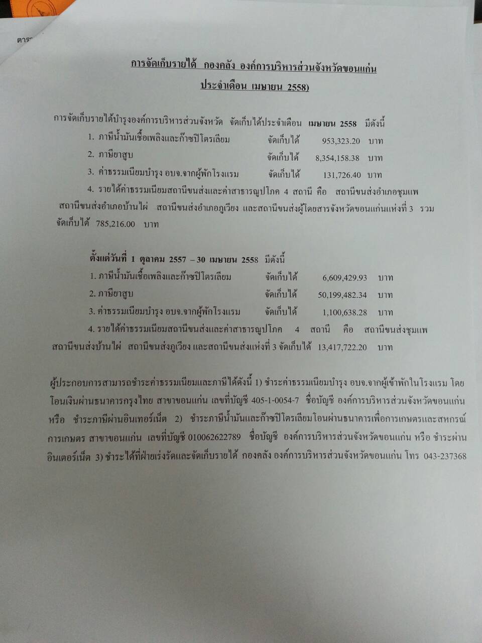 จัดเก็บรายได้ขององค์การบริหารส่วนจังหวัดขอนแก่น ประจำเดือน เมษายน 2558