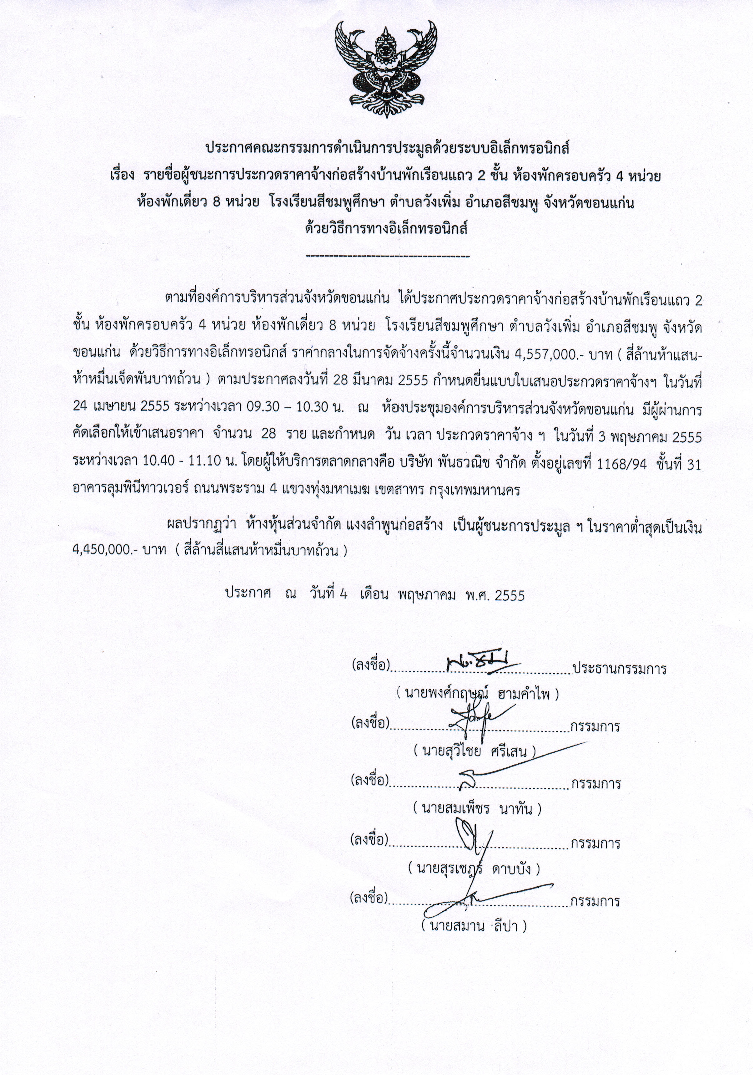 ประกาศรายชื่อผู้ชนะการประกวดราคาจ้างก่อสร้างบ้านพักเรือนแถว โรงเรียนสีชมพูศึกษา