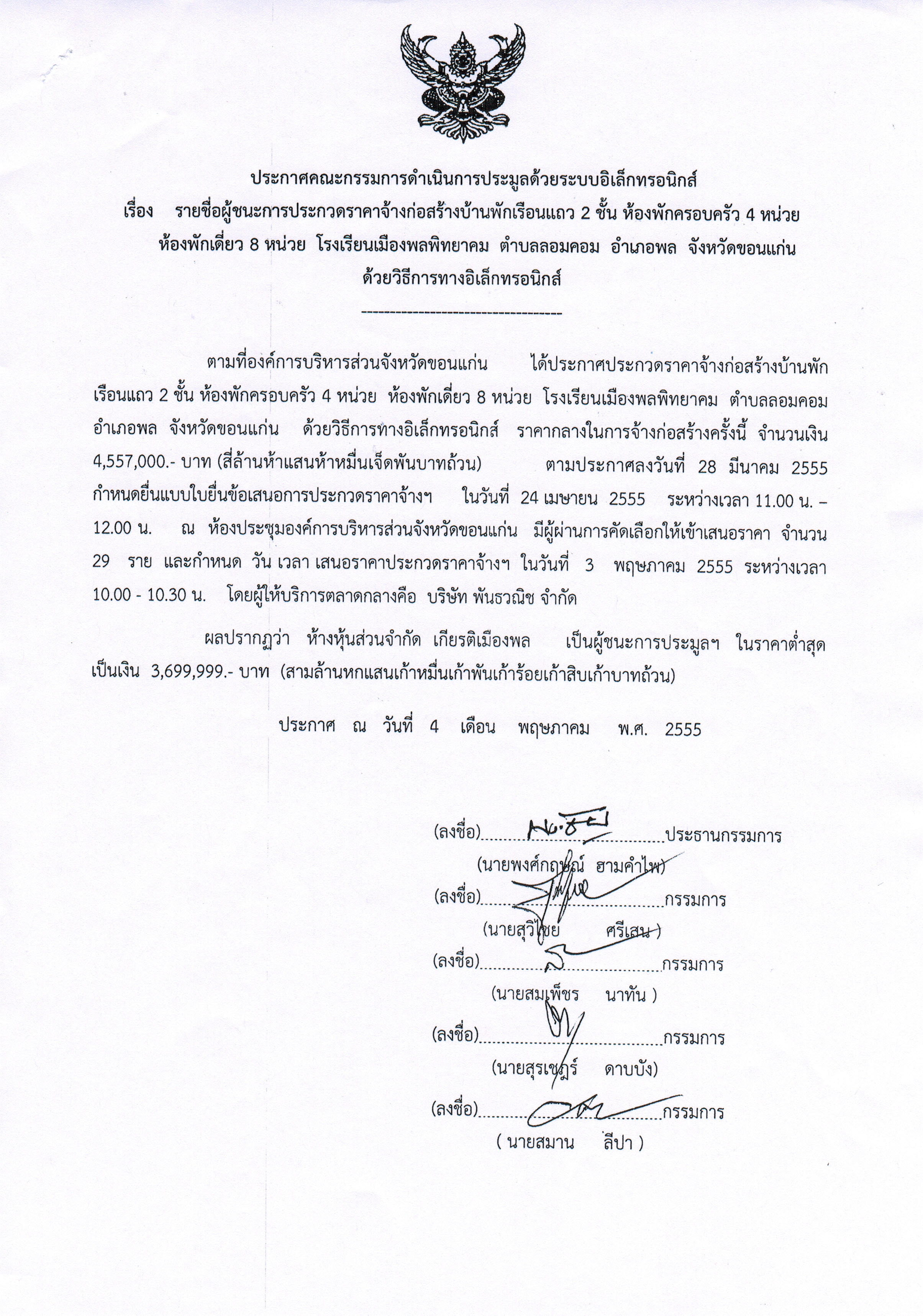 ประกาศรายชื่อผู้ชนะการประกวดราคาจ้างก่อสร้างบ้านพัก โรงเรียนเมืองพลพิทยาคม