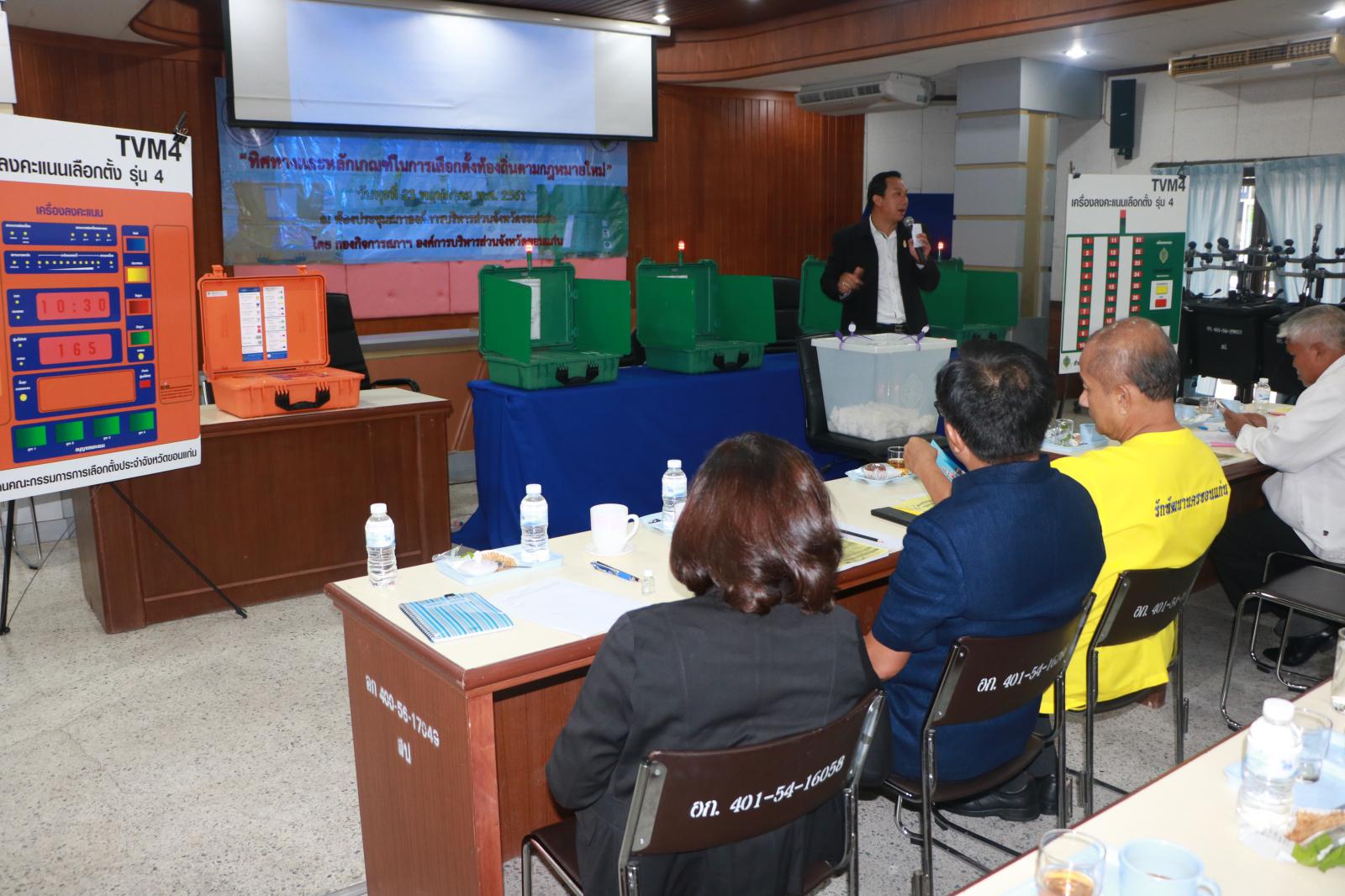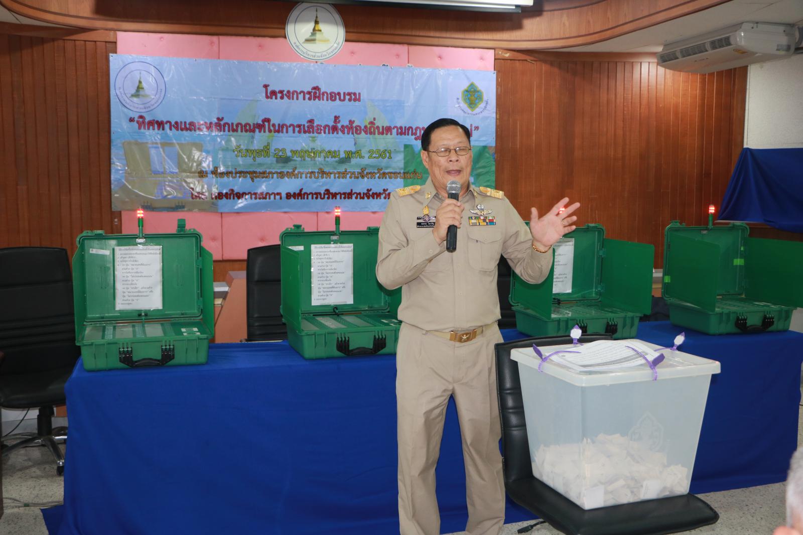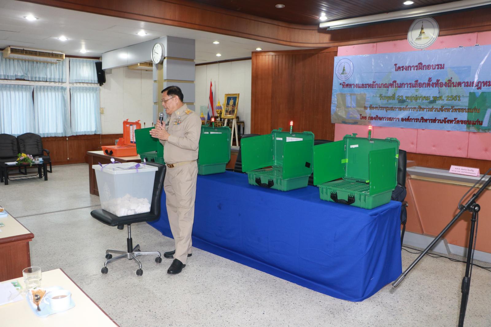 เมื่อวันที่ 23 พฤษภาคม 2561 รองนายก อบจ.ขอนแก่น นายสิทธิกุล ภูคำวงศ์ ส.อบจ.ขอนแก่น ปลัด อบจ.ขอนแก่น นางพัฒนาวดี วิริยปิยะ รองปลัด อบจ.ขอนแก่น นายธาดา พรหมสาขา ณ สกลนคร พร้อมด้วยหัวหน้าส่วนราชการ ข้าราชการ อบจ.ขอนแก่น ผู้บริหารท้องถิ่น สมาชิกสภาท้องถิ่น ข้าราชการ พนักงานเทศบาล และเจ้าหน้าที่ที่เกี่ยวข้องกับการบริหารการเลือกตั้ง ร่วมฟังบรรยาย โครงการฝึกอบรมทิศทางและหลักเกณฑ์ในการเลือกตั้งท้องถิ่นตามกฎหมายใหม่ และสาธิตการใช้เครื่องลงคะแนนเลือกตั้ง โดยมี รองผู้อำนวยการสำนักงาน กกต.จังหวัดขอนแก่น พ.ต.ท.สมชาย โตเจริญ หัวหน้างานการมีส่วนร่วม นายนรวิชญ์ สนอุป เป็นวิทยากร ณ ห้องประชุมสภา อบจ.ขอนแก่น