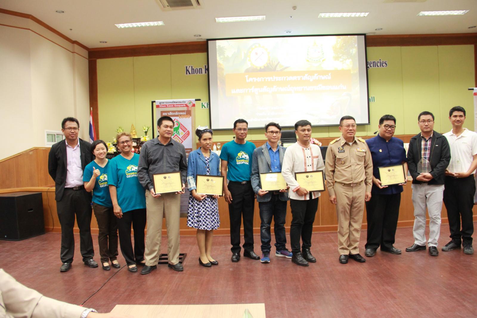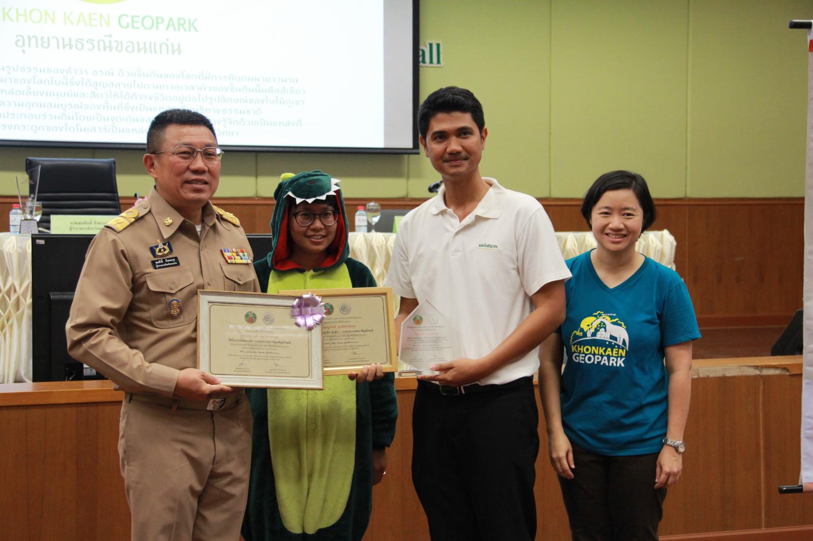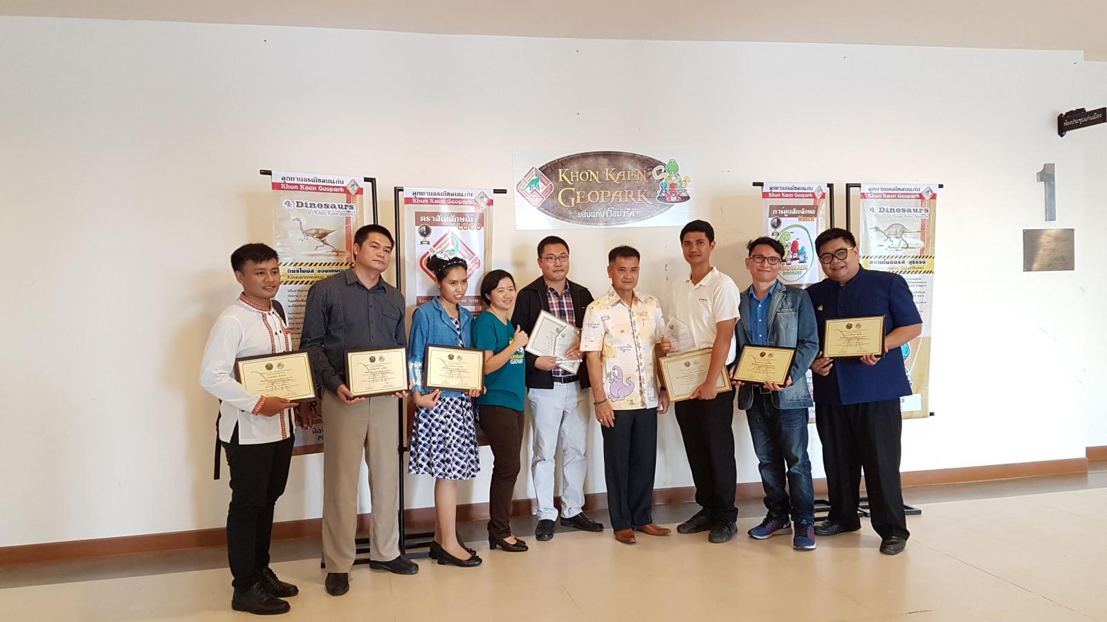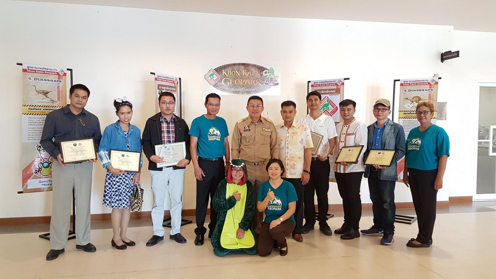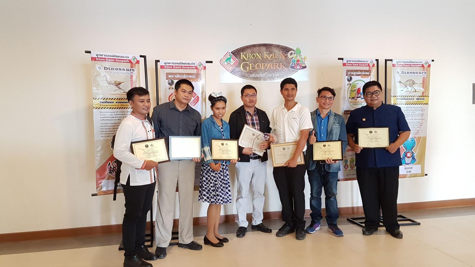 เมื่อวันที่ 28 กันยายน 2561 เวลา 09.30 น. ตามที่ องค์การบริหารส่วนจังหวัดขอนแก่น ได้จัดทำ "โครงการประกวดออกแบบตราสัญลักษณ์ (Logo) และการ์ตูนสัญลักษณ์ (Mascot) อุทยานธรณีขอนแก่น" และได้ประกาศผลการประกวดออกแบบตราสัญลักษณ์และการ์ตูนสัญลักษณ์อุทยานธรณีขอนแก่น เพื่อเป็นการแสดงความขอบคุณสำหรับการให้ความร่วมมือด้วยดีดังกล่าว องค์การบริหารส่วนจังหวัดขอนแก่น จึงเชิญผู้ชนะการประกวดและคณะกรรมการผู้ตัดสิน เข้ารับเกียรติบัตรฯ จาก นายสมศักดิ์ จังตระกุล ผู้ว่าราชการจังหวัดขอนแก่น โดยมีเข้ารับเกียรติบัตรดังนี้