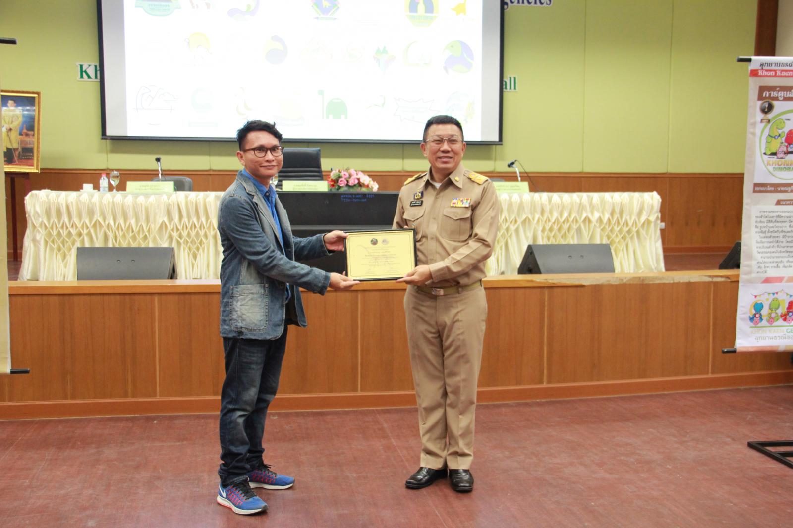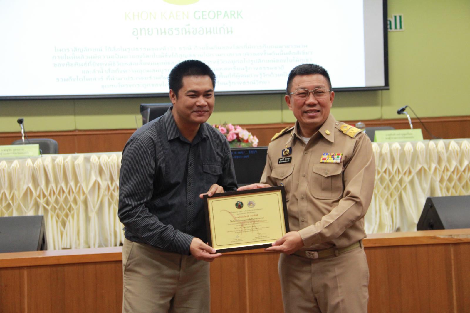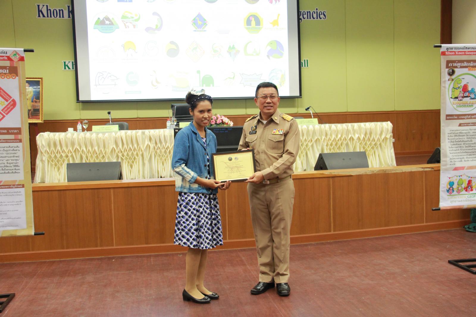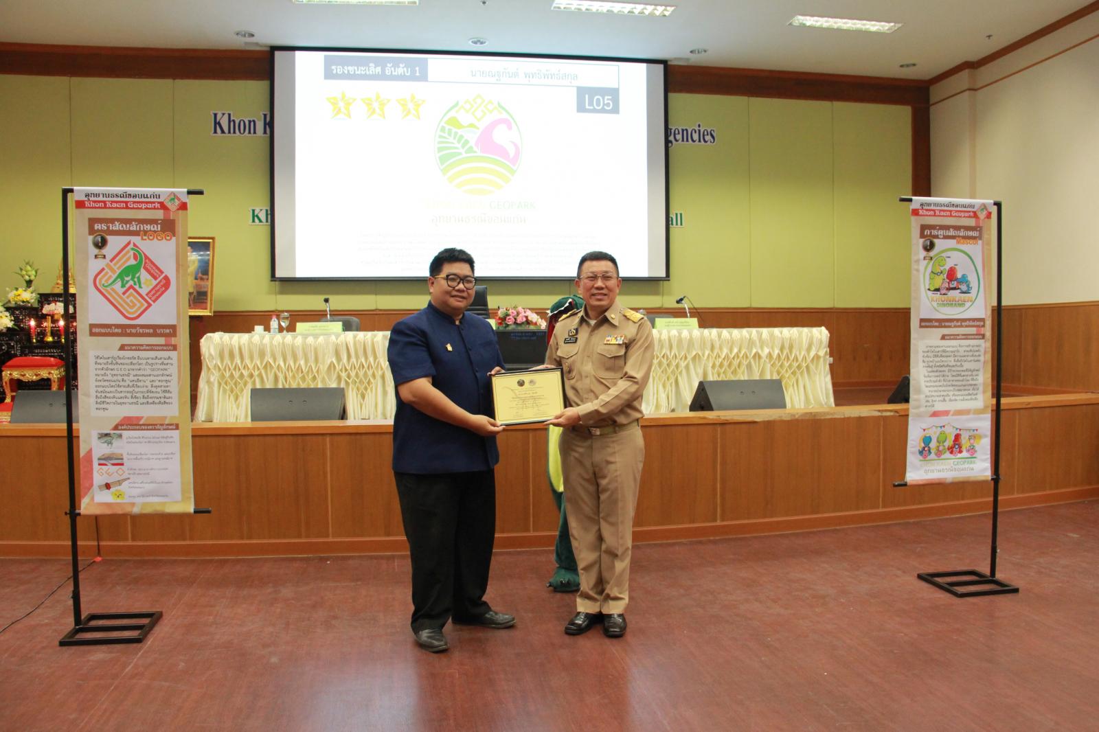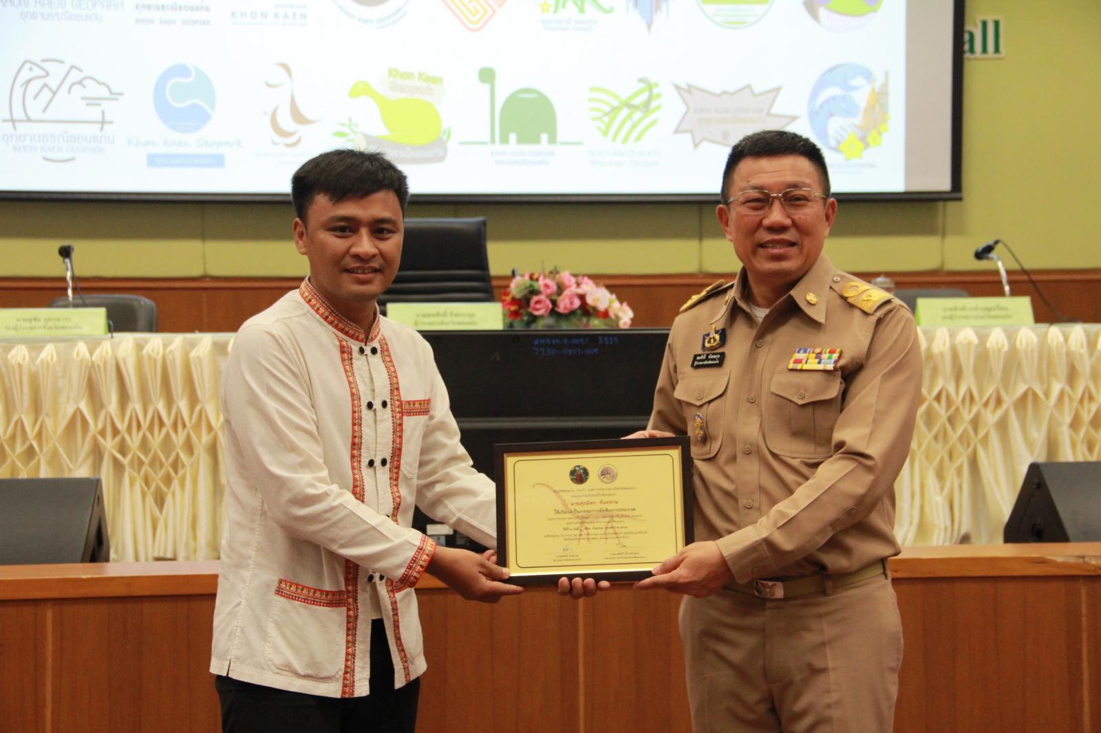 เมื่อวันที่ 28 กันยายน 2561 เวลา 09.30 น. ตามที่ องค์การบริหารส่วนจังหวัดขอนแก่น ได้จัดทำ "โครงการประกวดออกแบบตราสัญลักษณ์ (Logo) และการ์ตูนสัญลักษณ์ (Mascot) อุทยานธรณีขอนแก่น" และได้ประกาศผลการประกวดออกแบบตราสัญลักษณ์และการ์ตูนสัญลักษณ์อุทยานธรณีขอนแก่น เพื่อเป็นการแสดงความขอบคุณสำหรับการให้ความร่วมมือด้วยดีดังกล่าว องค์การบริหารส่วนจังหวัดขอนแก่น จึงเชิญผู้ชนะการประกวดและคณะกรรมการผู้ตัดสิน เข้ารับเกียรติบัตรฯ จาก นายสมศักดิ์ จังตระกุล ผู้ว่าราชการจังหวัดขอนแก่น โดยมีเข้ารับเกียรติบัตรดังนี้