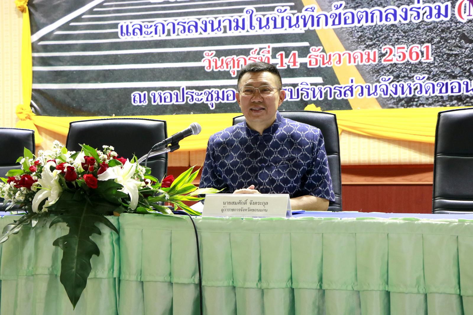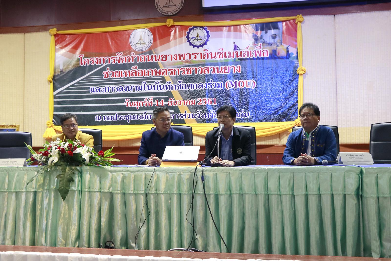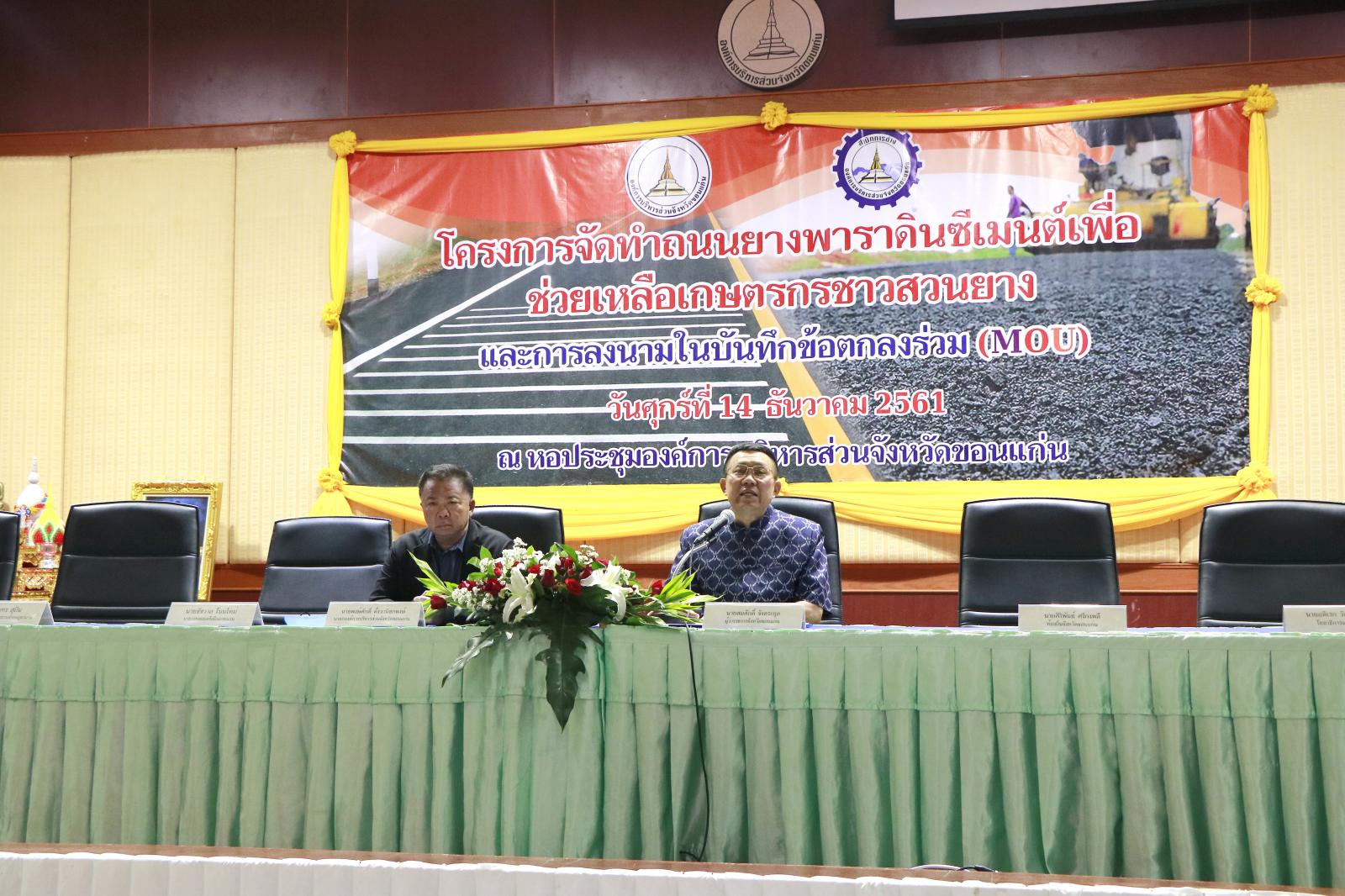 เมื่อวันที่ 14 ธันวาคม 2561 เวลา 09.00 น. ดร.พงษ์ศักดิ์ ตั้งวานิชกพงษ์ นายก อบจ.ขอนแก่น กล่าวรายงานในพิธีเปิดโครงการจัดทำถนนลาดยางพาราดินซีเมนต์เพื่อช่วยเหลือเกษตรกรชาวสวนยาง โดยมี ดร.สมศักดิ์ จังตระกุล ผู้ว่าราชการจังหวัดขอนแก่น เป็นประธาน และร่วมลงนามบันทึกข้อตกลงร่วม (MOU) ซึ่งมีผู้แทนจาก มหาวิทยาลัยเทคโนโลยีพระจอมเกล้าพระนครเหนือ การยางแห่งประเทศไทย สาขาจังหวัดขอนแก่น องค์กรปกครองส่วนท้องถิ่นในเขตจังหวัดขอนแก่น ท้องถิ่นจังหวัดขอนแก่น แขวงทางหลวงชนบทจังหวัดขอนแก่น มหาวิทยาลัยราชมงคลอีสานวิทยาเขตขอนแก่น เกษตรและสหกรณ์จังหวัดขอนแก่น ร่วมลงนามบันทึกข้อตกลงในครั้งนี้ด้วย ในโอกาสนี้มี นายสุชาติ ไตรองค์ถาวร ประธานสภา อบจ.ขอนแก่น, นายปรัชญา ผิวผาง เลขานุการ นายก อบจ.ขอนแก่น ,นายวุฒิพร ศรีมังกรแก้ว ส.อบจ.ขอนแก่น อ.เมือง เขต 2 ,นางพัฒนาวดี วิริยปิยะ ปลัด อบจ.ขอนแก่น หัวหน้าส่วนราชการ ข้าราชการ พนักงาน อบจ.ขอนแก่น ร่วมเป็นเกียรติ ณ หอประชุมองค์การบริหารส่วนจังหวัดขอนแก่น อ.เมืองขอนแก่น จ.ขอนแก่น
