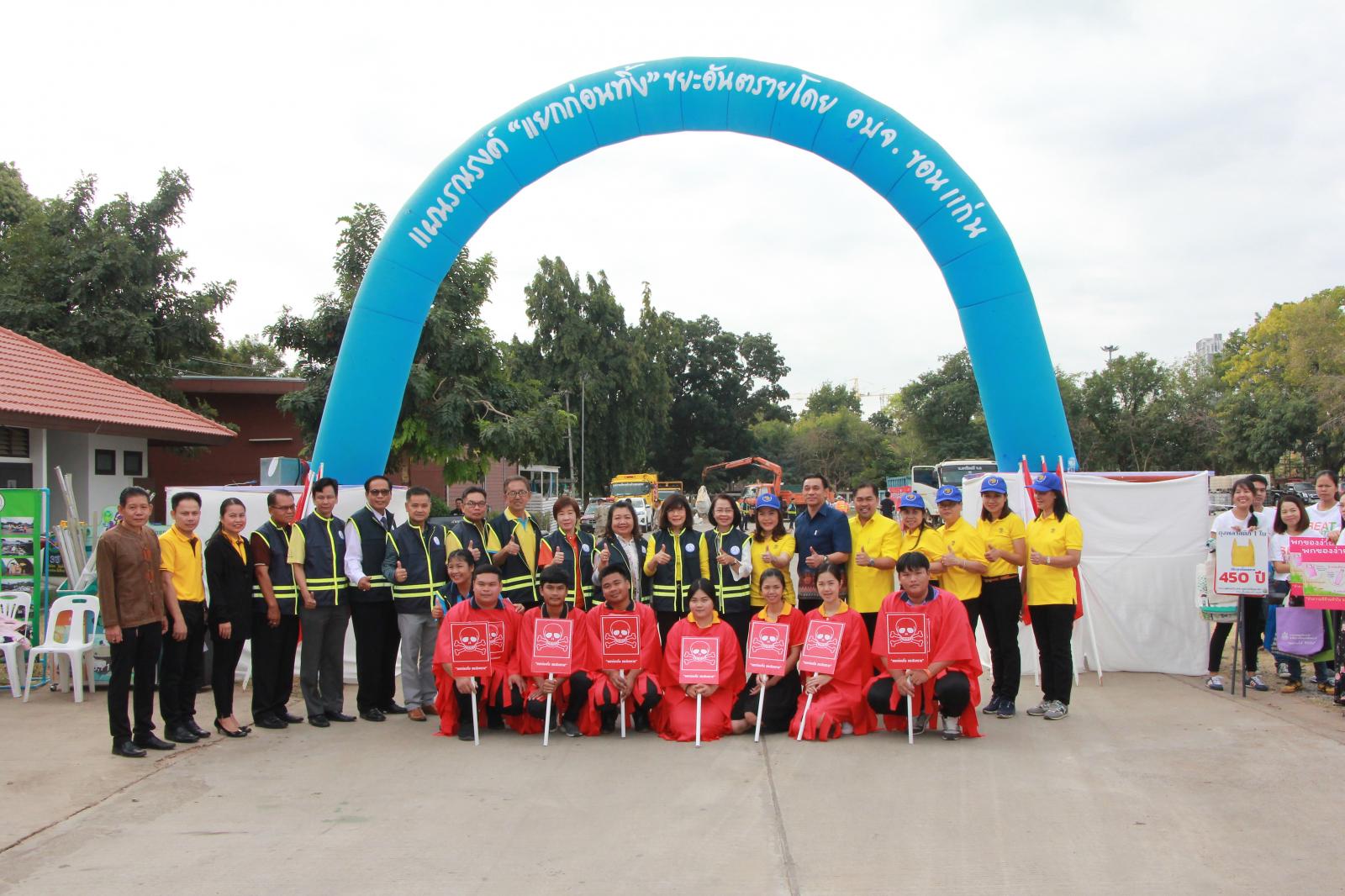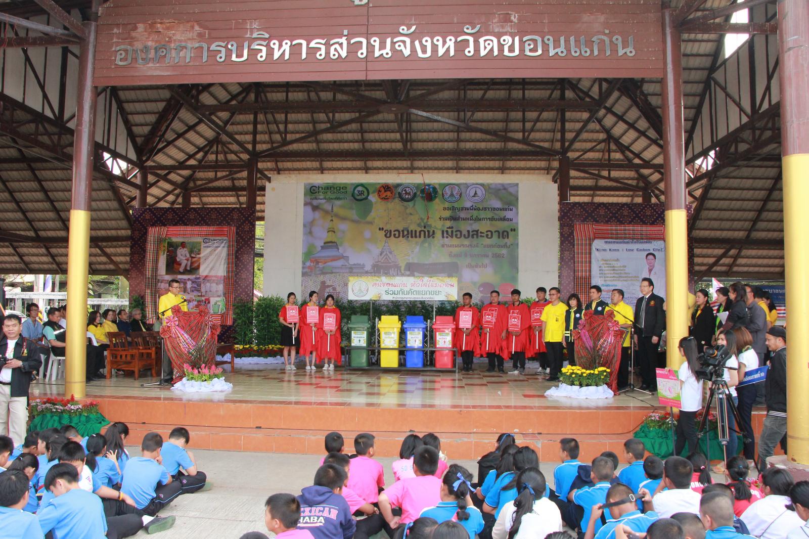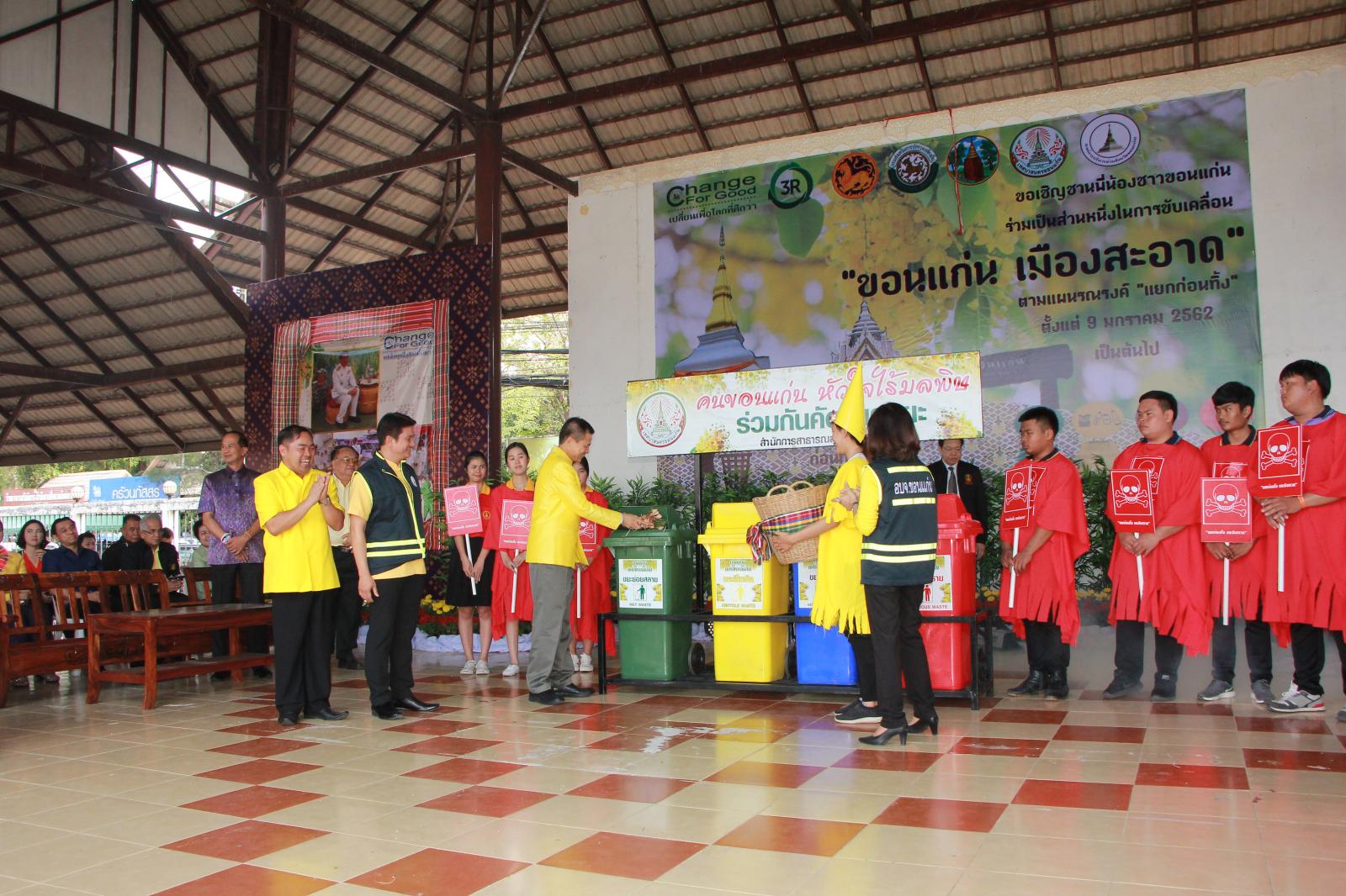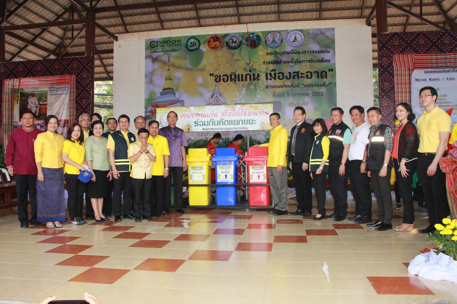 เมื่อวันที่ 9 มกราคม 2562 เวลา 09.30 น. ดร.พงษ์ศักดิ์ ตั้งวานิชกพงษ์ นายก อบจ.ขอนแก่น มอบหมายให้ นายสิทธิกุล ภูคำวงศ์ รองนายก อบจ.ขอนแก่น, นางพัฒนาวดี วิริยปิยะ ปลัด อบจ.ขอนแก่น, นางสาวนงลักษณ์ รัตนจันทร์ รองปลัด อบจ.ขอนแก่น และหัวหน้าส่วนราชการ อบจ.ขอนแก่น ร่วมพิธีเปิดกิจกรรมตามแผนรณรงค์ “แยกขยะก่อนทิ้ง” เพื่อขับเคลื่อนการจัดการขยะมูลฝอย ประจำปีงบประมาณ พ.ศ. 2562 โดยมีนายสันติ เหล่าบุญเสงี่ยม รองผู้ว่าราชการจังหวัดขอนแก่น เป็นประธานในพิธี ณ บริเวณหน้าศาลากลางจังหวัดขอนแก่น (บริเวณศาลาผูกเสี่ยว)