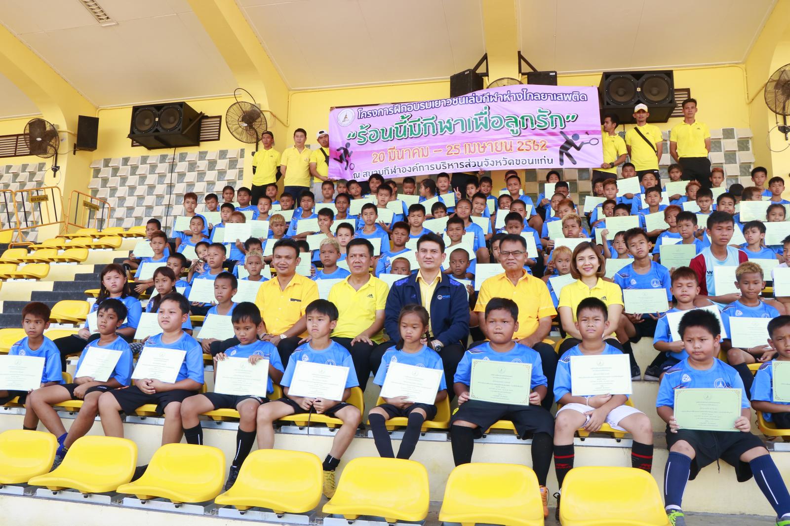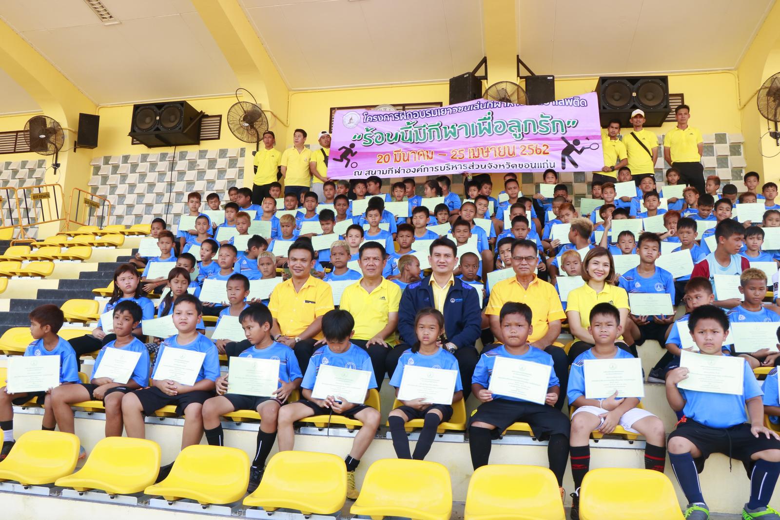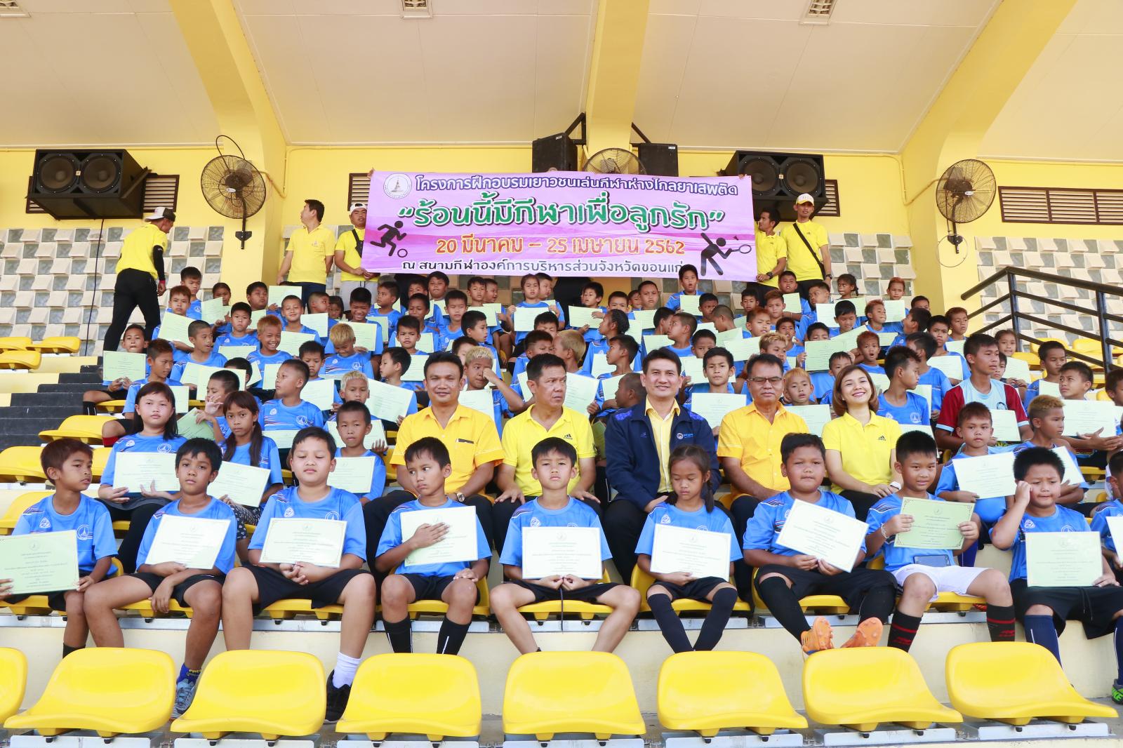 เมื่อวันที่ 25 เมษายน 2562 เวลา 14.00 น. ดร.พงษ์ศักดิ์ ตั้งวานิชกพงษ์ นายก อบจ.ขอนแก่น มอบหมายให้ นายสิทธิกุล ภูคำวงศ์ รองนายก อบจ.ขอนแก่น เป็นประธานในพิธีปิดและมอบประกาศนียบัตรการฝึกอบรมให้เยาวชนที่เข้าร่วมโครงการฝึกอบรมเยาวชนเล่นกีฬาห่างไกลยาเสพติด “ร้อนนี้มีกีฬาเพื่อลูกรัก” ประจำปี 2562 โดยมี นายวรเวทย์ ดิเรกศรี หัวหน้าสำนักปลัด อบจ. หัวหน้าส่วนราชการ ข้าราชการ อบจ.ขอนแก่น และผู้ปกครองชองเยาวชน เข้าร่วมพิธี ณ สนามกีฬา อบจ.ขอนแก่น อ.เมืองขอนแก่น จ.ขอนแก่น
