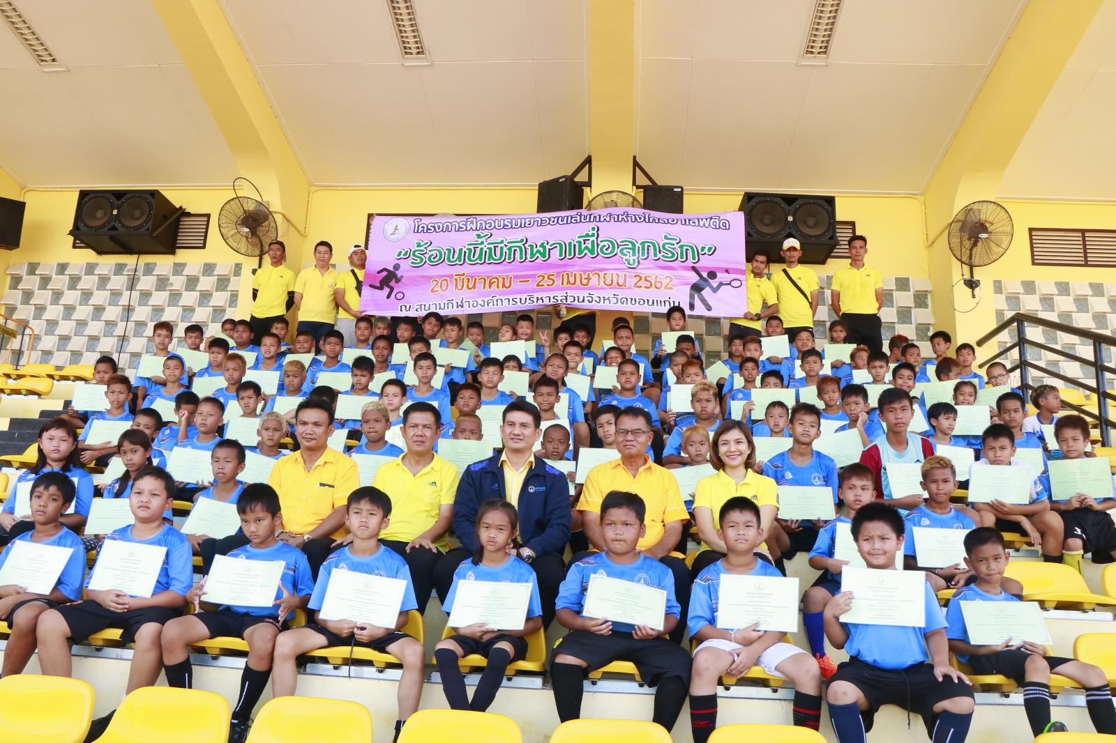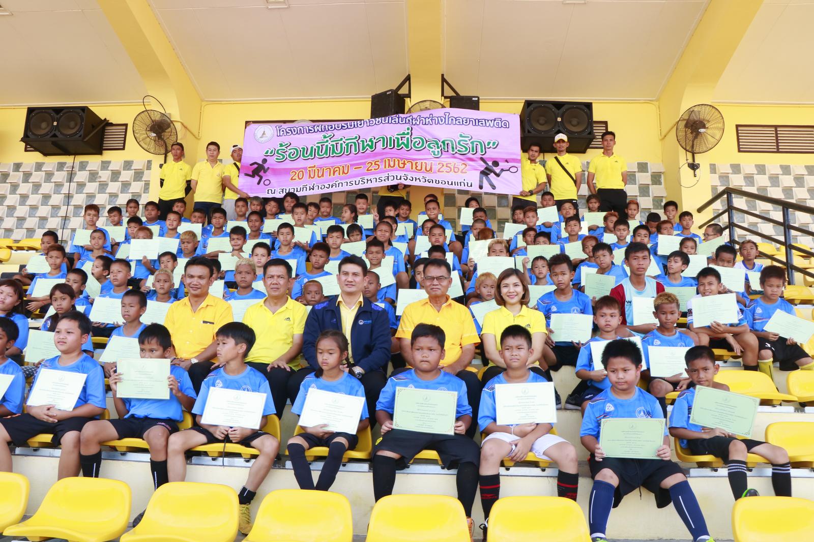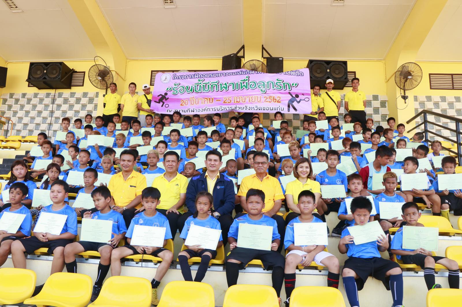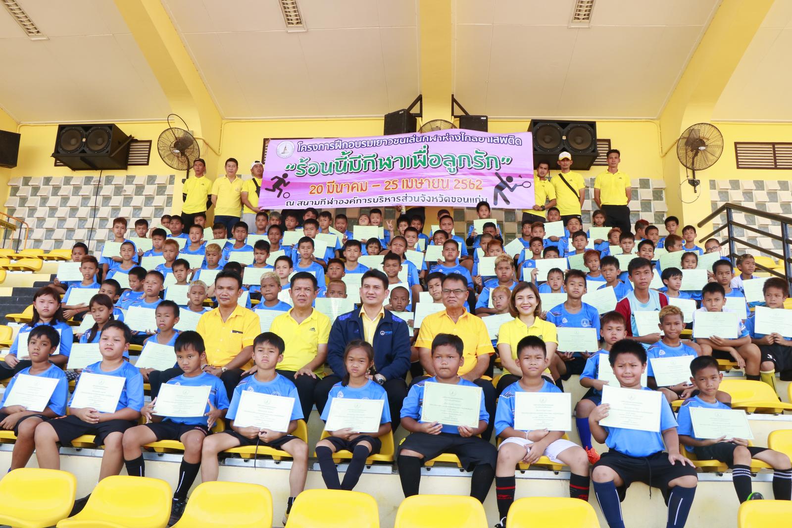 เมื่อวันที่ 25 เมษายน 2562 เวลา 14.00 น. ดร.พงษ์ศักดิ์ ตั้งวานิชกพงษ์ นายก อบจ.ขอนแก่น มอบหมายให้ นายสิทธิกุล ภูคำวงศ์ รองนายก อบจ.ขอนแก่น เป็นประธานในพิธีปิดและมอบประกาศนียบัตรการฝึกอบรมให้เยาวชนที่เข้าร่วมโครงการฝึกอบรมเยาวชนเล่นกีฬาห่างไกลยาเสพติด “ร้อนนี้มีกีฬาเพื่อลูกรัก” ประจำปี 2562 โดยมี นายวรเวทย์ ดิเรกศรี หัวหน้าสำนักปลัด อบจ. หัวหน้าส่วนราชการ ข้าราชการ อบจ.ขอนแก่น และผู้ปกครองชองเยาวชน เข้าร่วมพิธี ณ สนามกีฬา อบจ.ขอนแก่น อ.เมืองขอนแก่น จ.ขอนแก่น